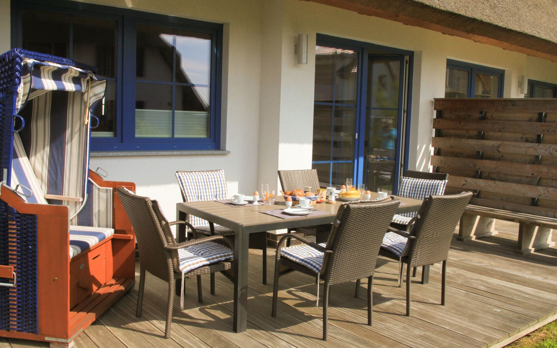 Holzterrasse mit Tisch + 6 Stühlen, 1 Grillplatz mit festen Außengrill, Holzhaus zum Abstellen von Fahrrädern, PKW-Stellplatz. Je Haus sind zudem 2 Fahrräder und 1 Strandkorb vorhanden.