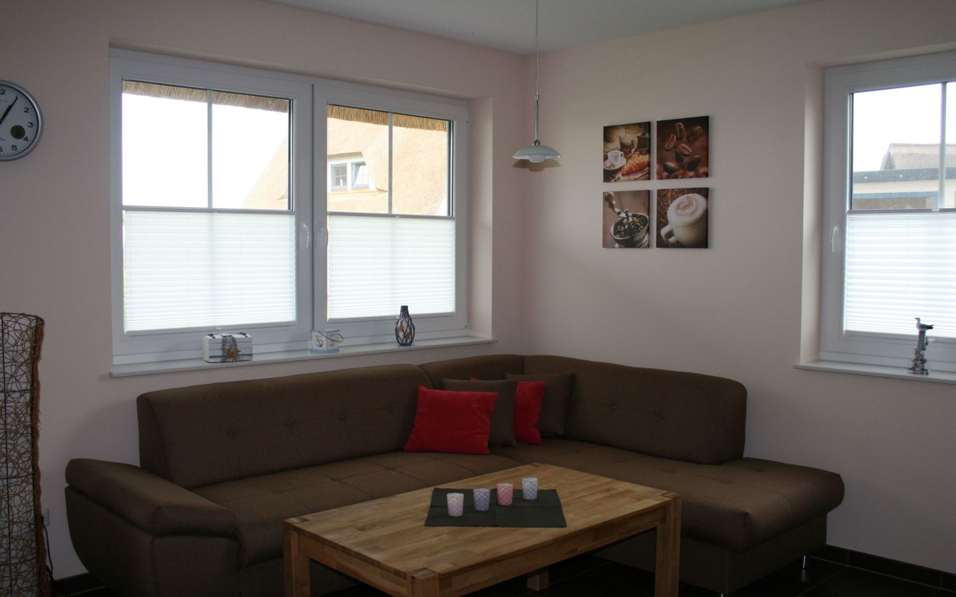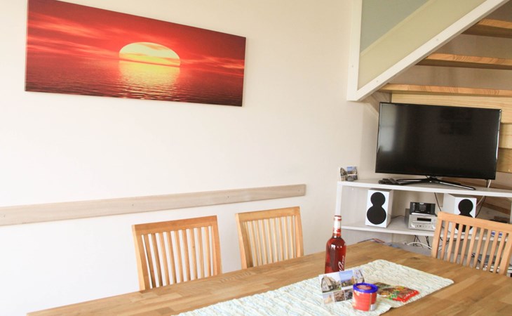 Höchster Komfort Unser reetgedecktes Domizil bietet zwei Unterkünfte für je 6 Personen, jede Wohneinheit verfügt über ca. 100 qm Wohnfläche und ist großzügig ausgestattet mit 3 Schlafzimmer, 2 Bädern, Sauna, Kamin, modern eingerichteter Küche, möblierter Terrasse und vieles mehr. Beide Wohneinheiten, links Seepferdchen, rechts Seestern sind in Ihrer Art und Weise sowei in der Ausstattung komplett identisch. Ausstattung ERDGESCHOSS Küche Cerankochfeld, Backofen, Geschirrspüler, Kühlschrank, Geschirr, Töpfe und Pfannen, Kaffeemaschine, Toaster, Wasserkocher, Mixer Ess- und Wohnbereich Tisch + 6 Stühle, Eckcouch, Couchtisch, LED-HD-Fernseher, HiFi-Anlage mit DVD-Player, Internetanschluss, freistehender Kaminofen Badezimmer Fußbodenheizung, Dusche, Sauna, Handtuchtrockner, WC, Waschtisch, Fön OBERGESCHOSS 2 Schlafzimmer je 1 Doppelbett mit 2 Nachttischen, 1 Babybett bei Bedarf, Schlafzimmerschrank, 2 Stühle und 1 Tisch Badezimmer Dusche, WC, Waschtisch, Fön DACHGESCHOSS Schlafzimmer 2 Einzelbetten mit Nachttisch und Schrank HAUSWIRTSCHAFTSRAUM Waschmaschine, Wäschetrockner, Staubsauger