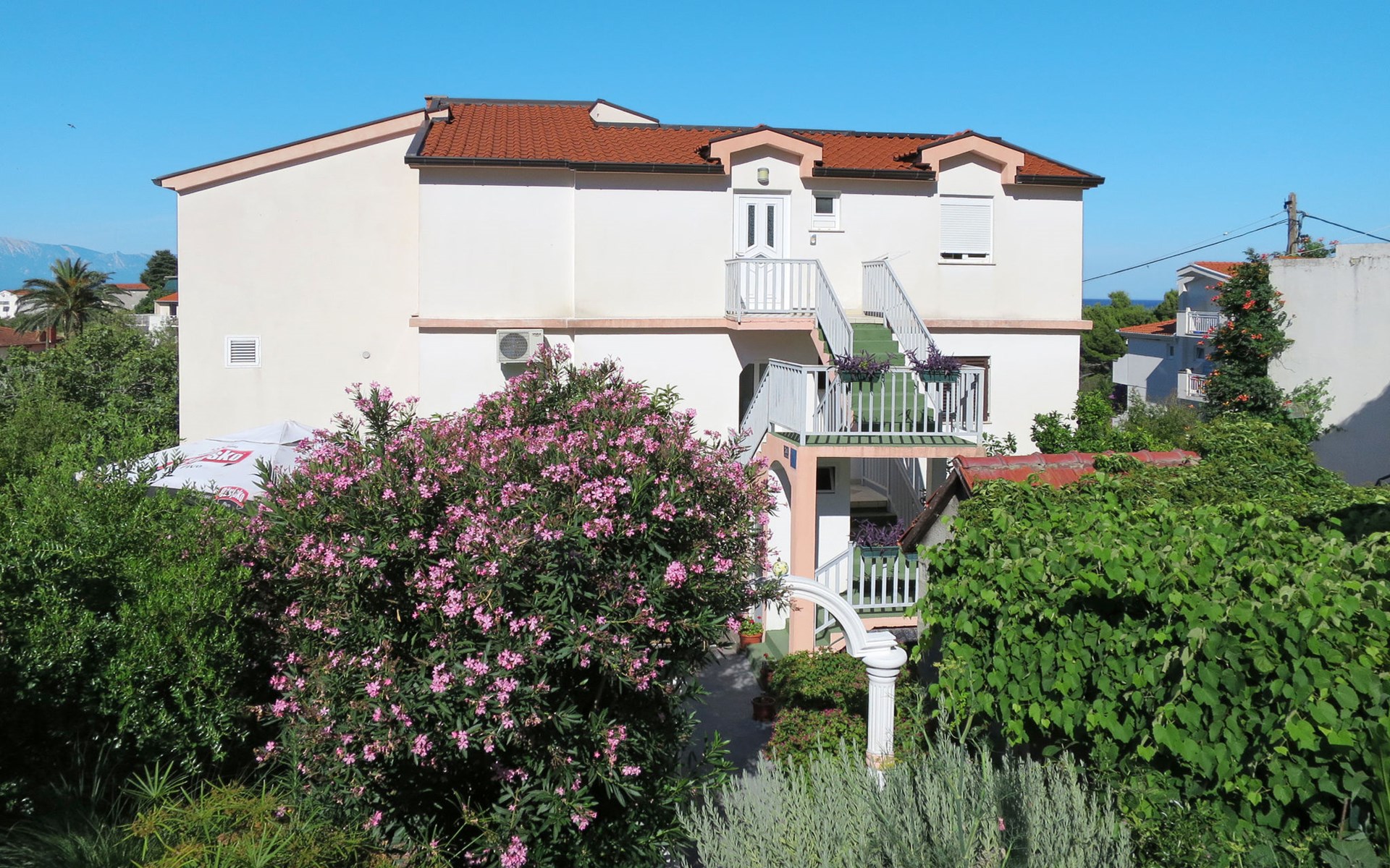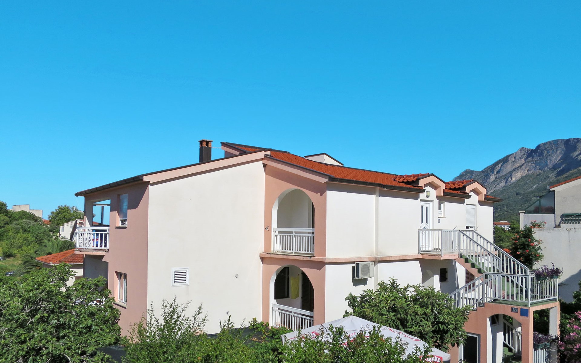 Mehrfamilienhaus "Rudez". 250 m vom Zentrum von Gradac, 15 km vom Zentrum von Ploče, 40 km vom Zentrum von Makarska, am Hang, 250 m vom Meer, 350 m vom Strand. Zur Mitbenutzung: Grundstück 400 m2, Bäumen. Grill. Im Hause: Internetzugang. Parkplatz auf dem Grundstück. Supermarkt 250 m, Restaurant 350 m, Bushaltestelle 600 m, Kieselstrand 350 m.