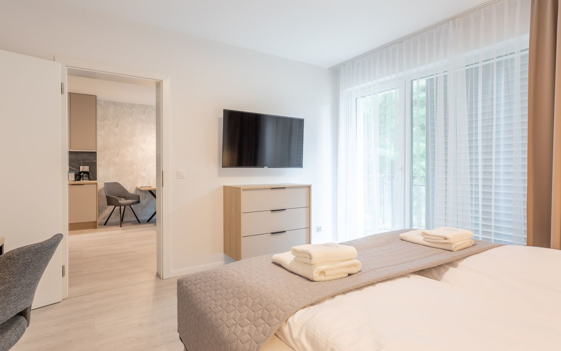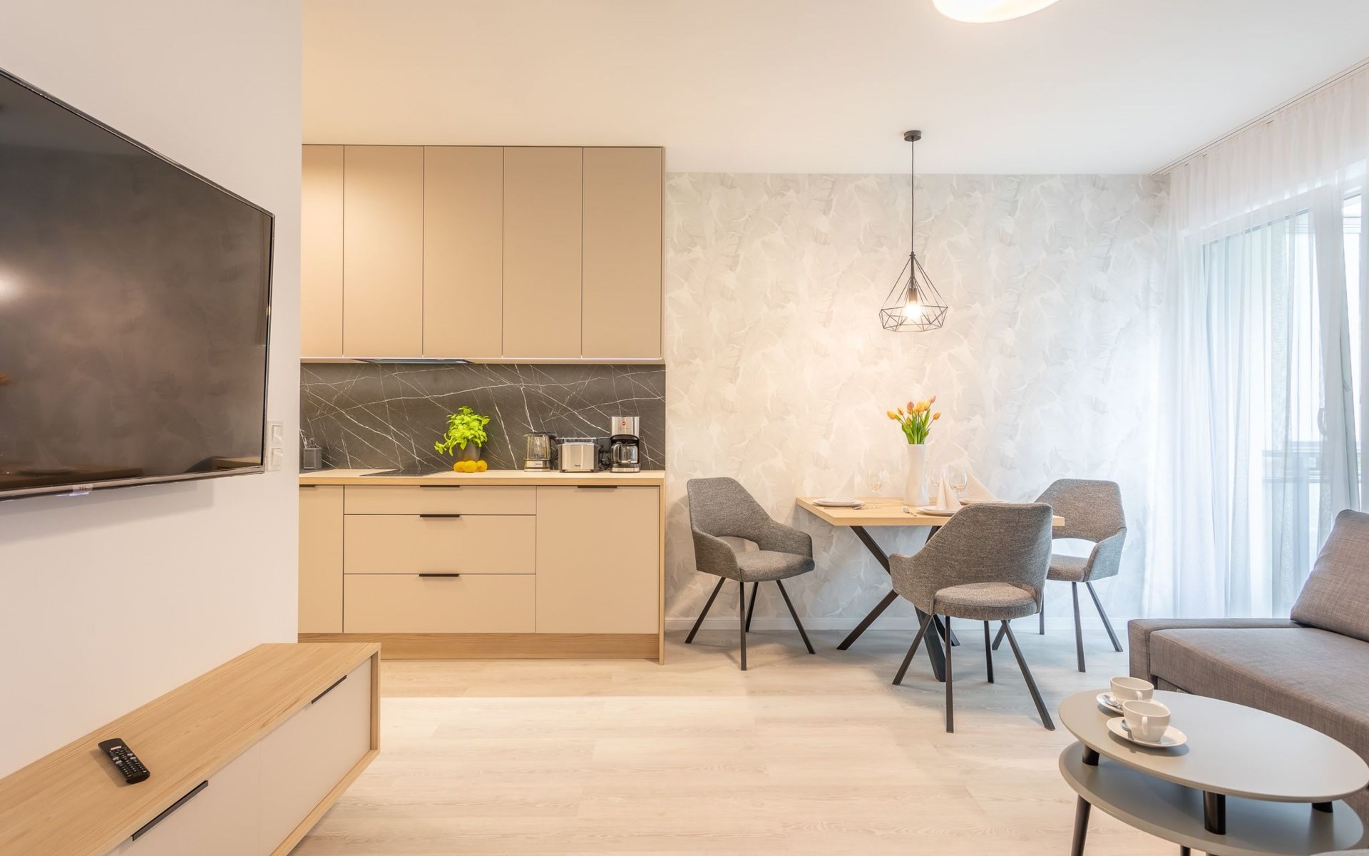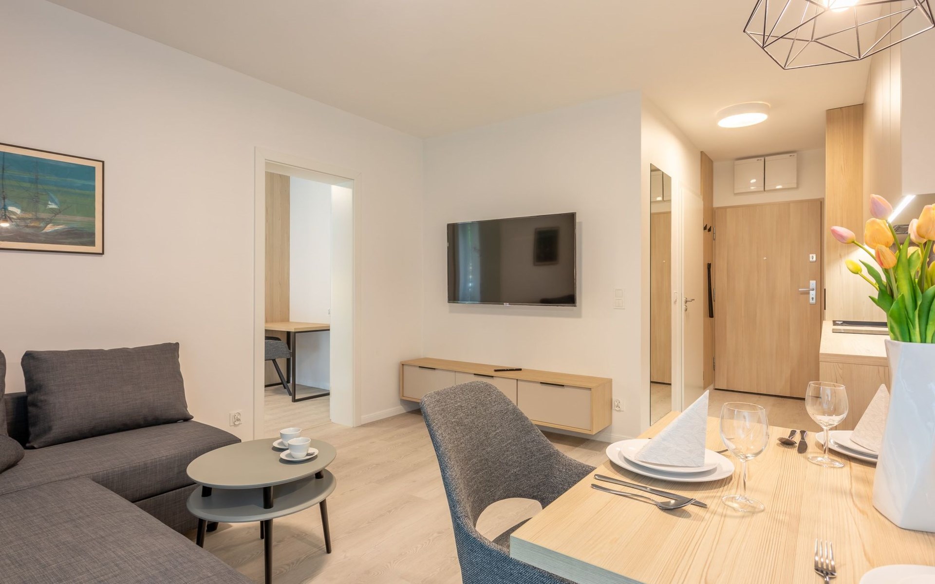Es handelt sich um eine Wohnung mit einem sehr geräumigen Schlafzimmer, einem Wohnzimmer mit einer gut ausgestatteten Küchenzeile und einem modernen Badezimmer mit einer Gesamtfläche von 41 m2, sowie einem großen Balkon. Im Innenraum dominieren helle, äußerst milde Farben: Weiß, Grau und Beige. Zudem ist die Wohnung äußerst gemütlich und zeichnet sich durch schlichte Formen und hohe Qualität aus. Zahlreiche textile und dekorative Accessoires ergänzen den Raum und lassen Sie sich wie zu Hause fühlen. Es ist ein ideales Angebot für Menschen, die während ihres Aufenthalts einige Zeit auf der Couch verbringen möchten, ein Buch lesen oder in einem äußerst bequemen Bett frühstücken möchten.