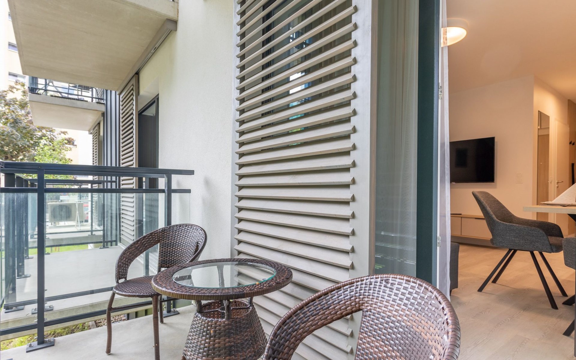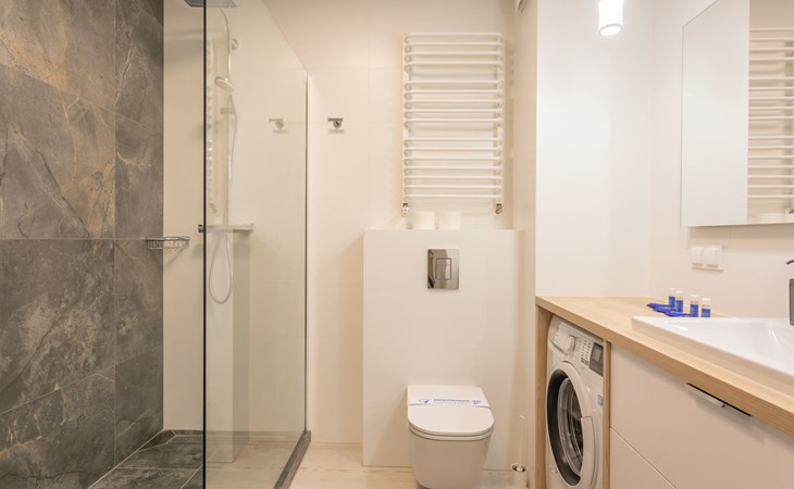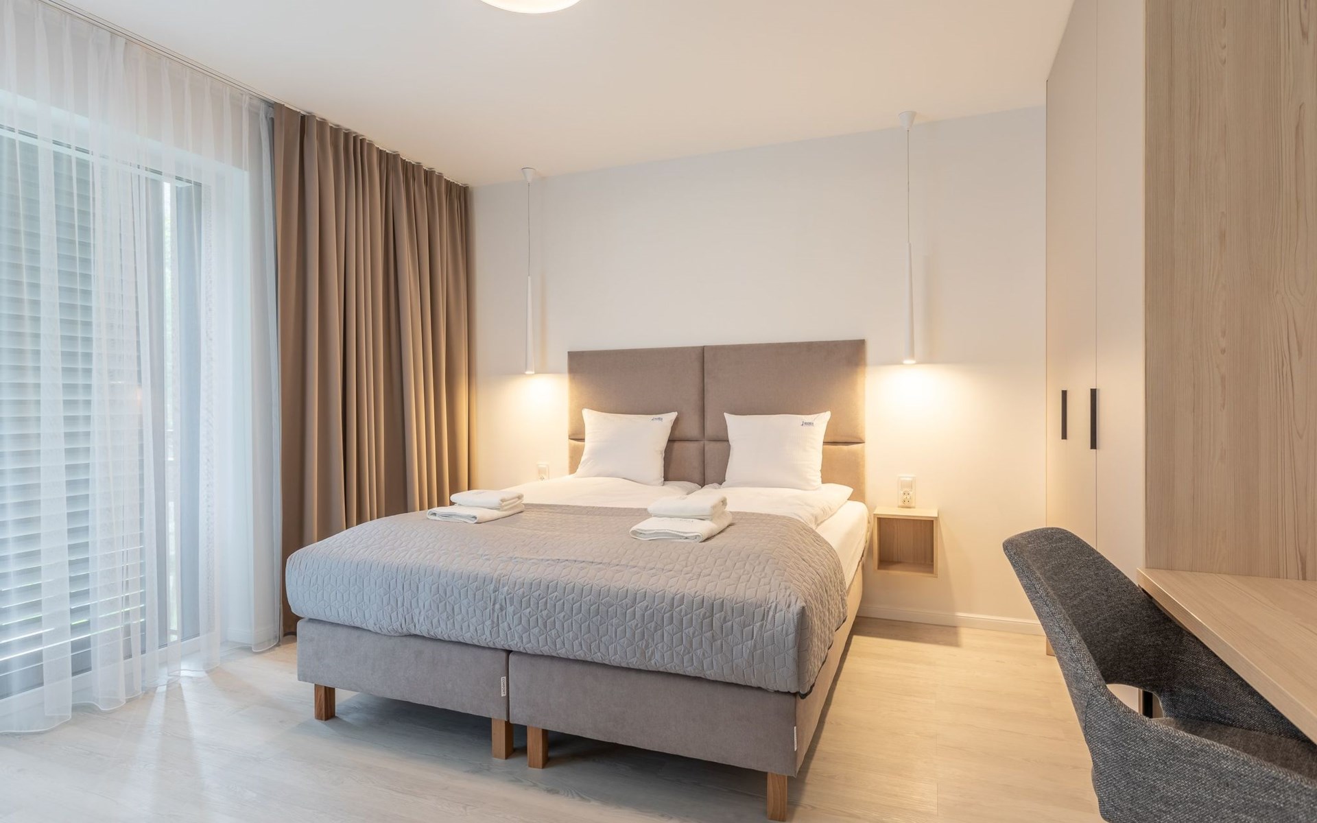 Es handelt sich um eine Wohnung mit einem sehr geräumigen Schlafzimmer, einem Wohnzimmer mit einer gut ausgestatteten Küchenzeile und einem modernen Badezimmer mit einer Gesamtfläche von 41 m2, sowie einem großen Balkon. Im Innenraum dominieren helle, äußerst milde Farben: Weiß, Grau und Beige. Zudem ist die Wohnung äußerst gemütlich und zeichnet sich durch schlichte Formen und hohe Qualität aus. Zahlreiche textile und dekorative Accessoires ergänzen den Raum und lassen Sie sich wie zu Hause fühlen. Es ist ein ideales Angebot für Menschen, die während ihres Aufenthalts einige Zeit auf der Couch verbringen möchten, ein Buch lesen oder in einem äußerst bequemen Bett frühstücken möchten.