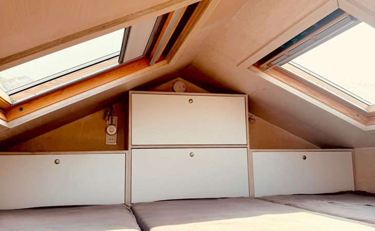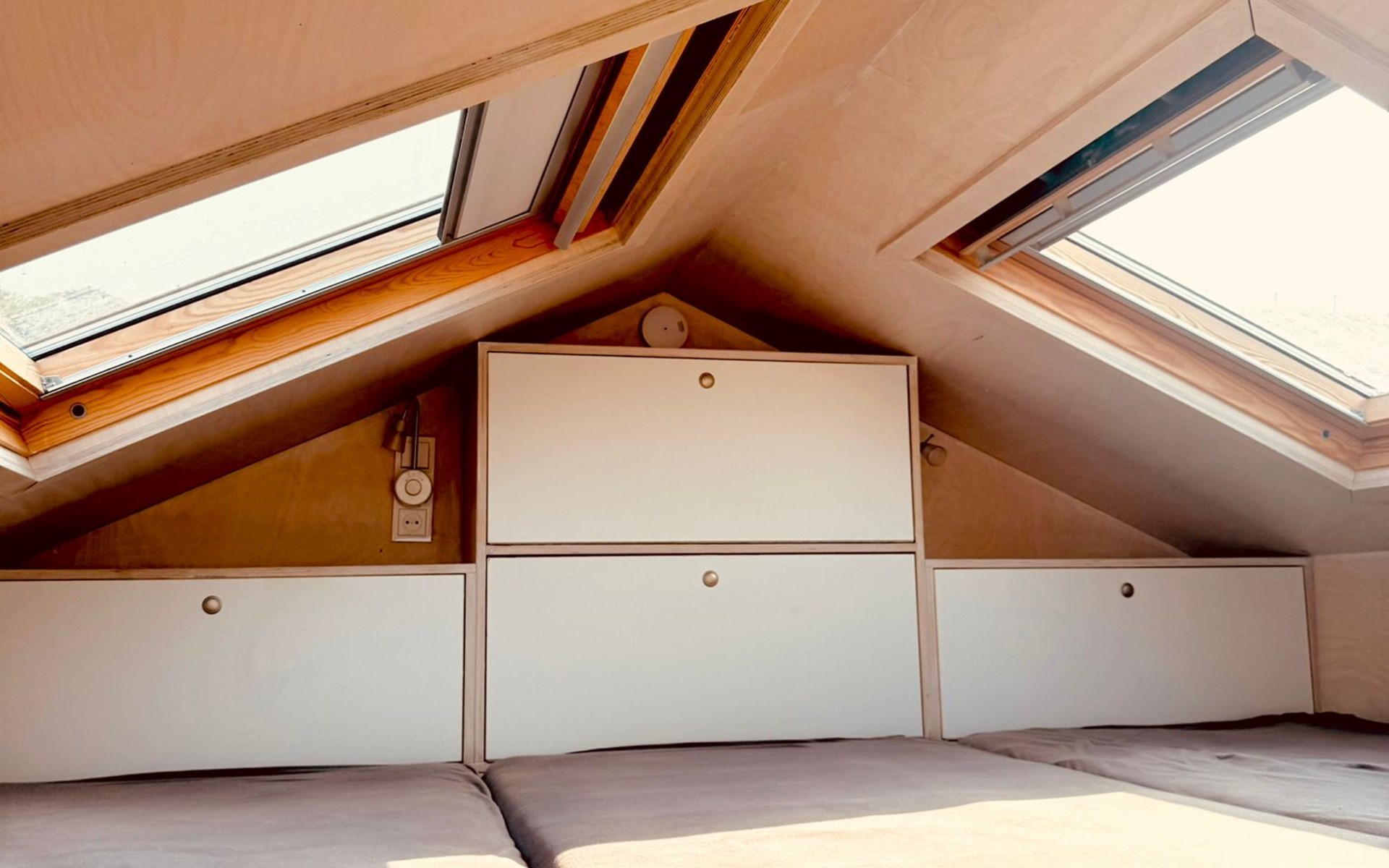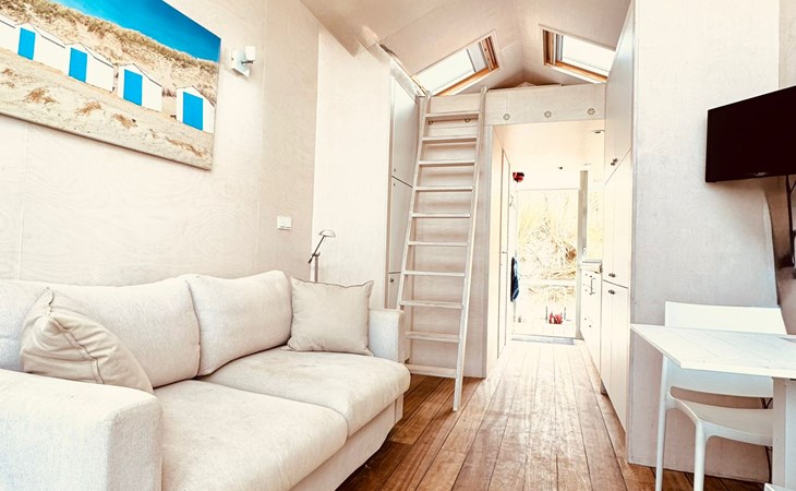 Abends fallen Sie vielleicht nach einem herrlichen Tag am Strand mit dem Sonnenuntergang, der den Himmel über dem Strand färbt, ins Bett, denn Sie schlafen buchstäblich am Meer. Über die Treppe erreichen Sie die Schlafgalerie mit drei Einzelmatratzen (90x200 cm), die aneinanderliegen. Auf dem Dachboden gibt es auch Stauraum für Gepäck.