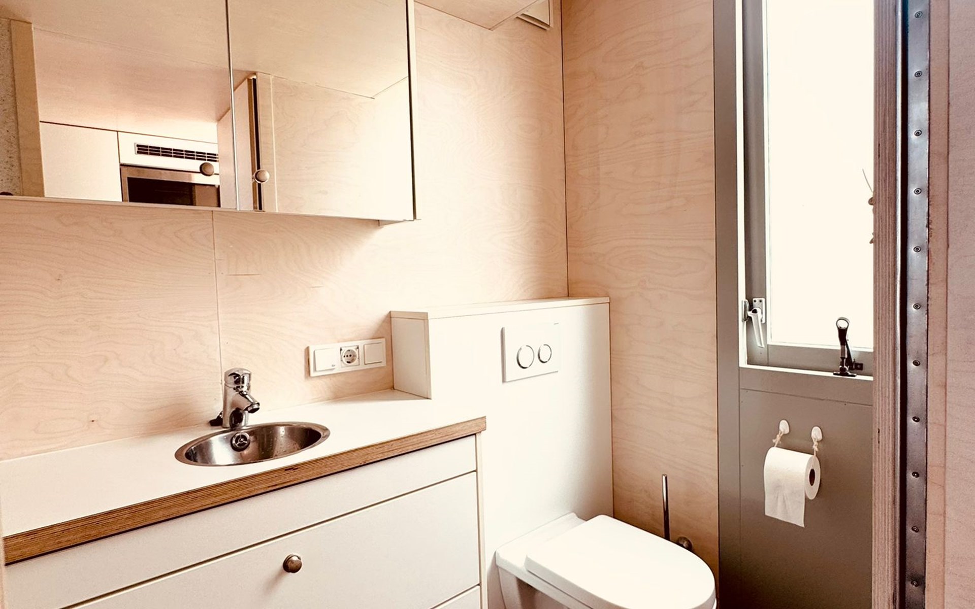 Das Tiny House ist 20m² groß, ebenerdig mit leichten Höhenunterschieden und einer Treppe zur Schlafgalerie. Alles ist praktisch eingerichtet, sodass fünf Personen bequem wohnen können.