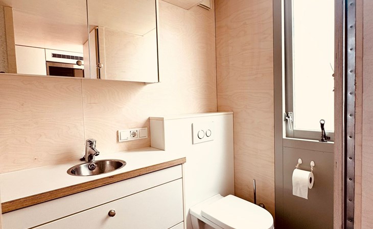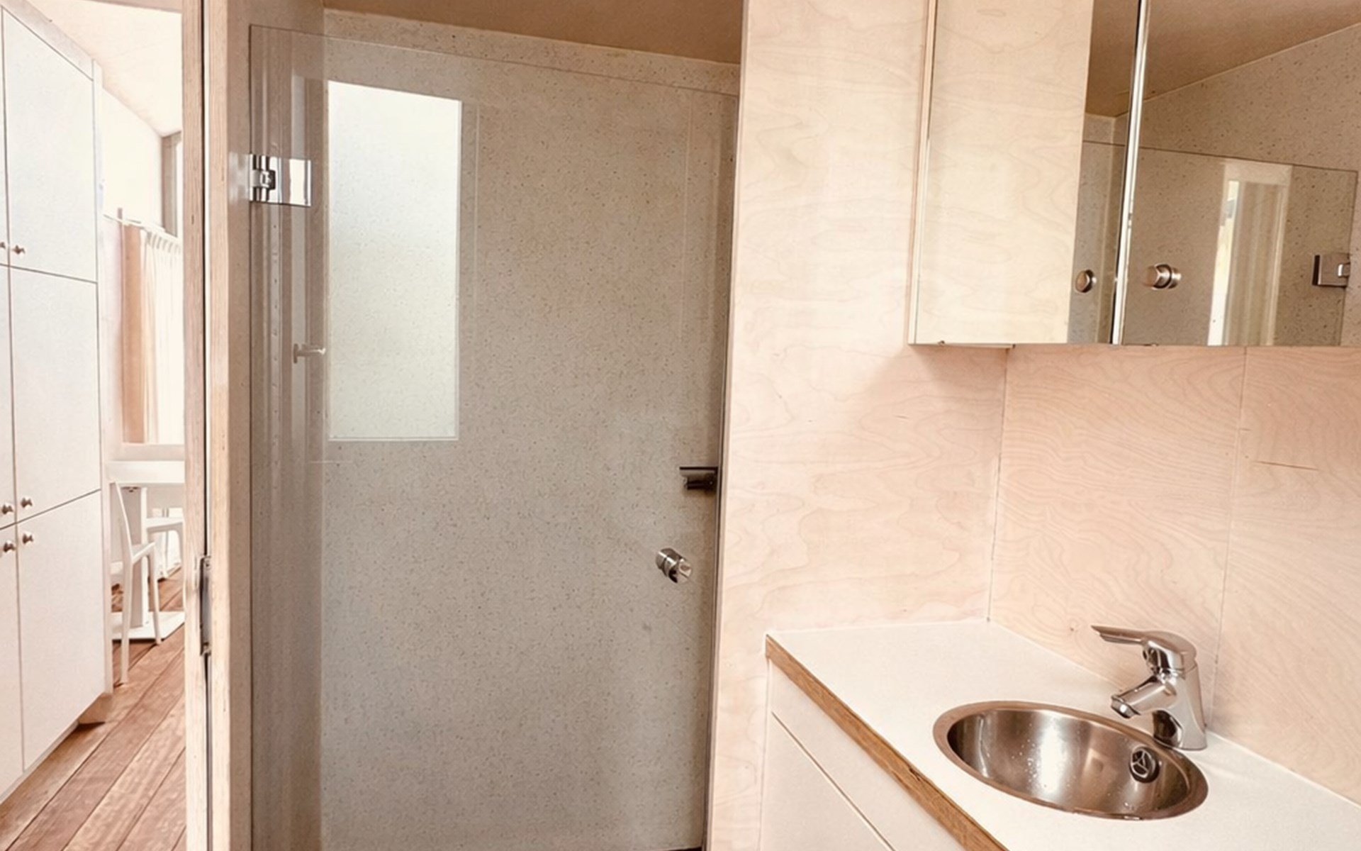 Nach einem erfrischenden Bad im Meer genießen Sie warmes Wasser unter der Dusche. Das Badezimmer verfügt über Dusche, Waschbecken mit Unterschrank, zusätzlichen Stauraum und eine feste Toilette.