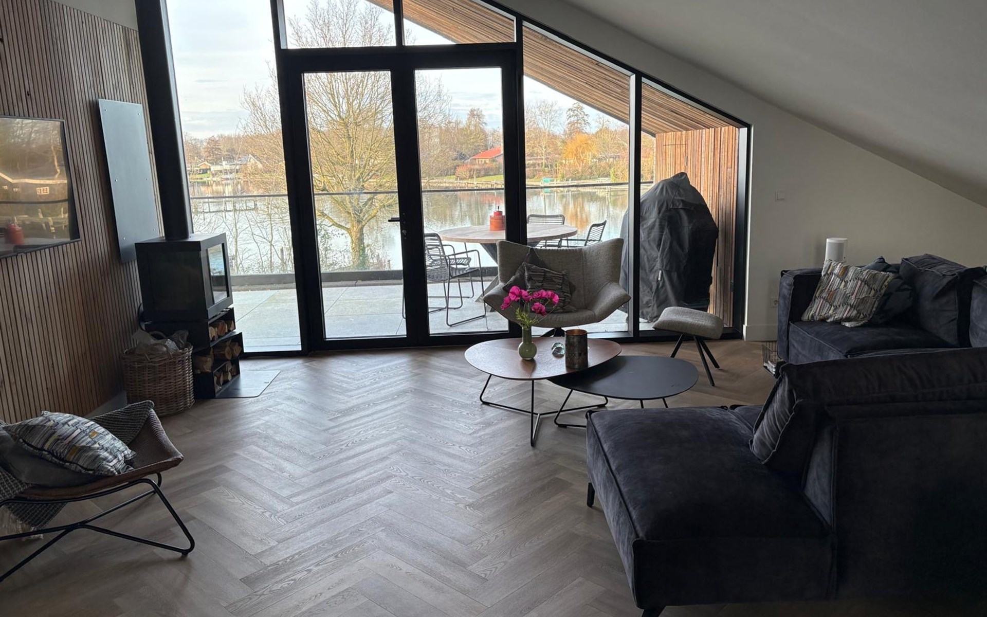 Das helle und gemütlich eingerichtete Wohnzimmer befindet sich im ersten Stock der Villa. Das Wohnzimmer verfügt über eine gemütliche Sitzecke mit einem Smart-TV, einem Holzkamin und einem atemberaubenden Blick über das Wasser. Vom Wohnzimmer aus haben Sie Zugang zur Terrasse mit einem großen runden Esstisch und einem fest installierten Grill. Der perfekte Ort für lange Sommerabende, an denen Sie gutes Essen und ein gutes Glas Wein genießen können.