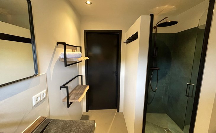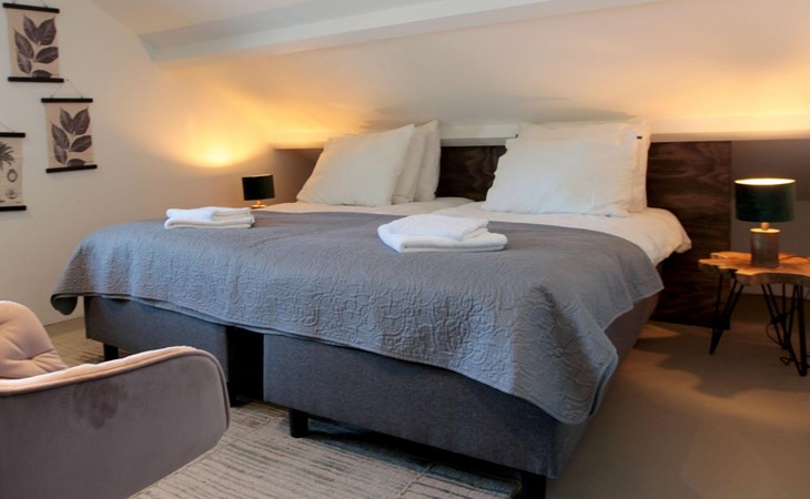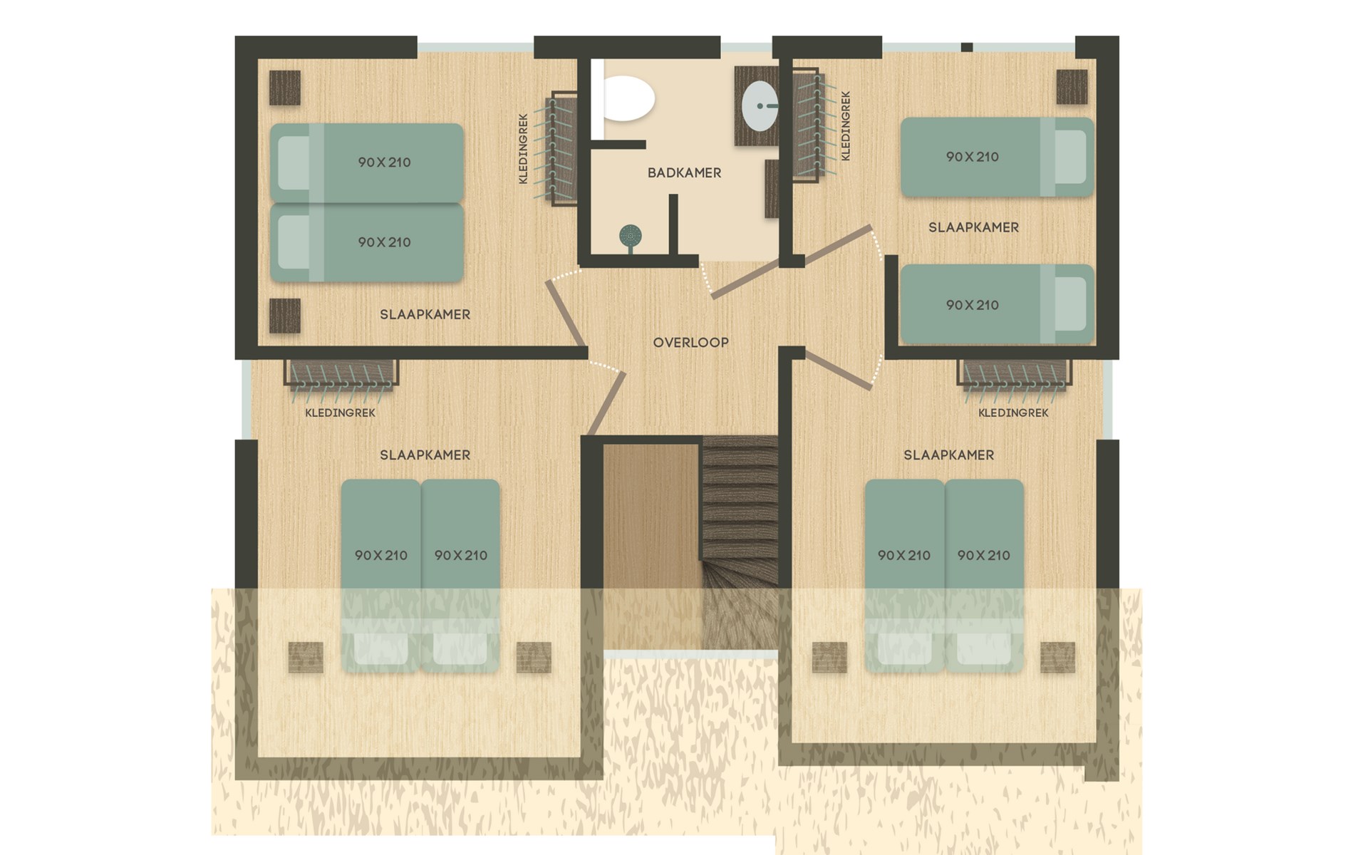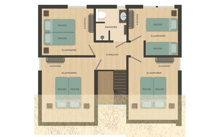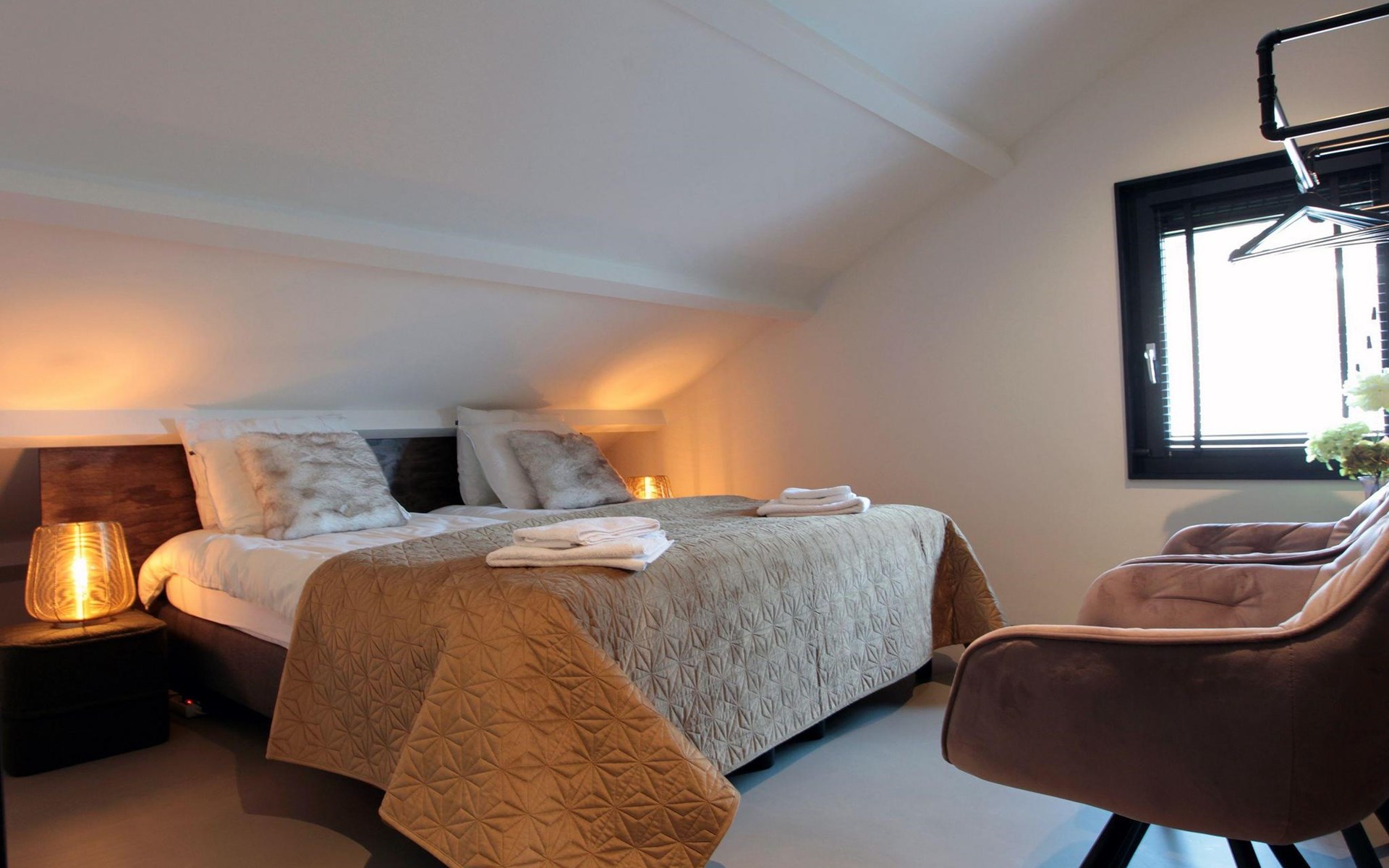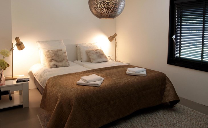 Im Obergeschoss befinden sich die vier Schlafzimmer mit Gemeinschaftsbad. Zwei Schlafzimmer sind mit einem Boxspring-Doppelbett ausgestattet, die anderen Schlafzimmer haben jeweils zwei Boxspring-Einzelbetten. Das luxuriöse Badezimmer verfügt neben Waschbecken und Toilette auch über eine verlockende Regendusche.