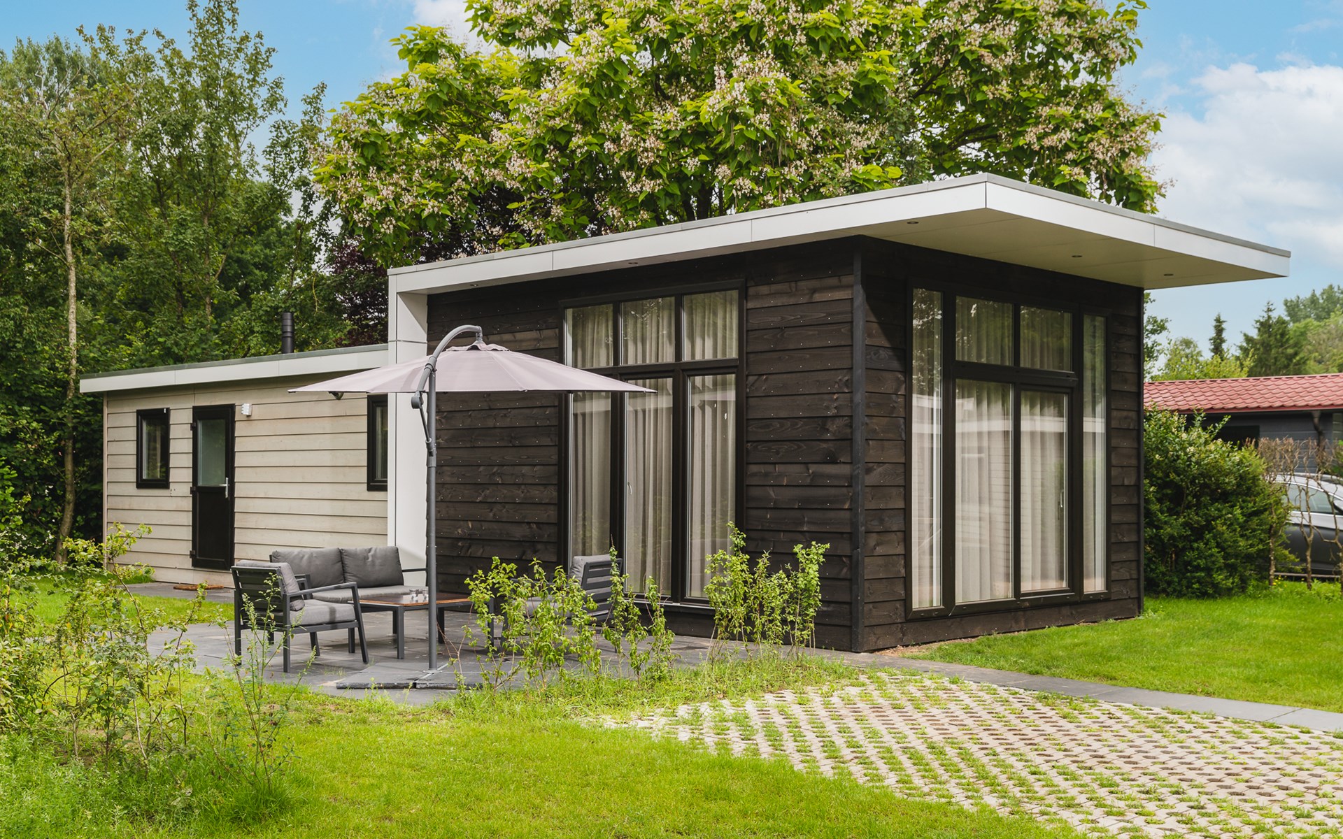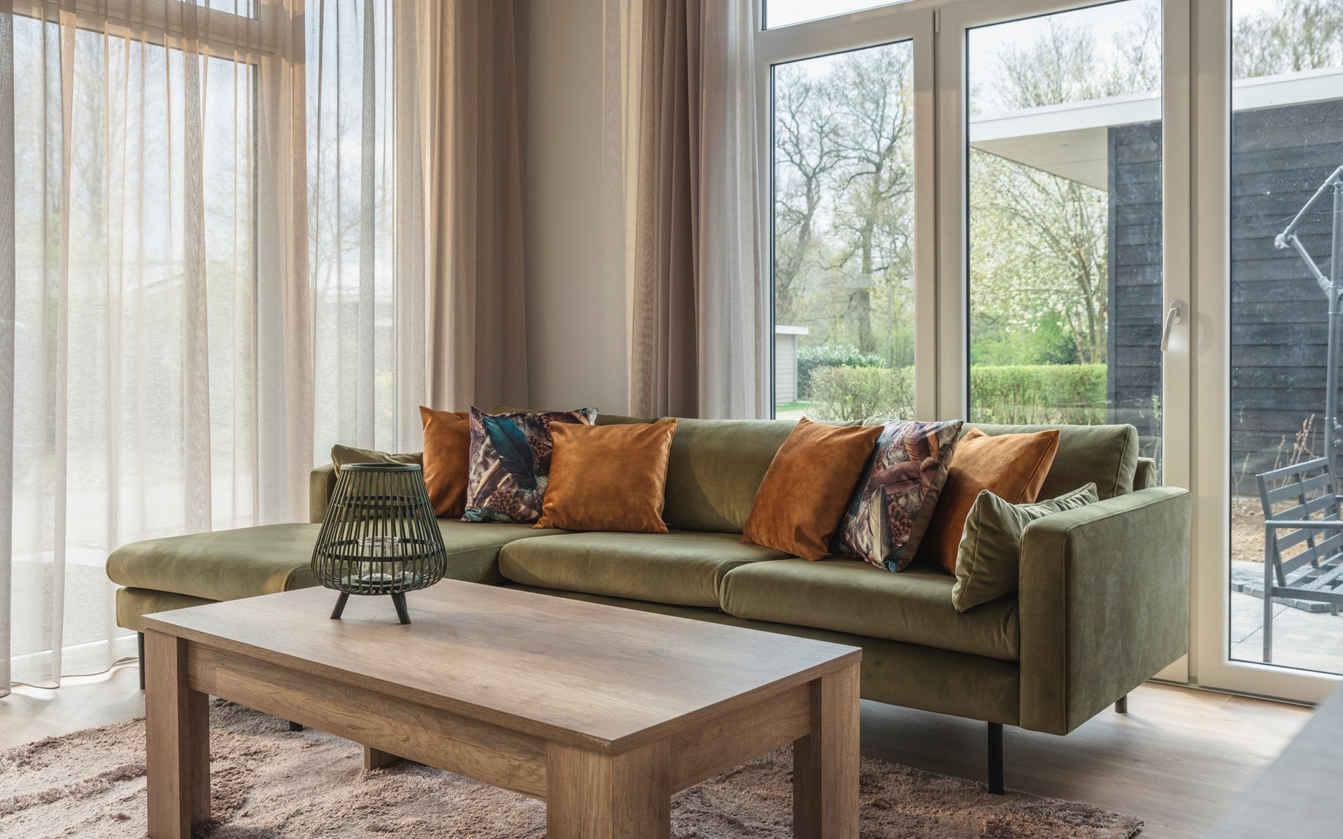 Draußen lädt der Garten mit Loungeset zum Entspannen ein. Ein wunderbarer Platz, um frische Luft zu genießen, ein Buch zu lesen oder einfach einen Moment nichts zu müssen.
