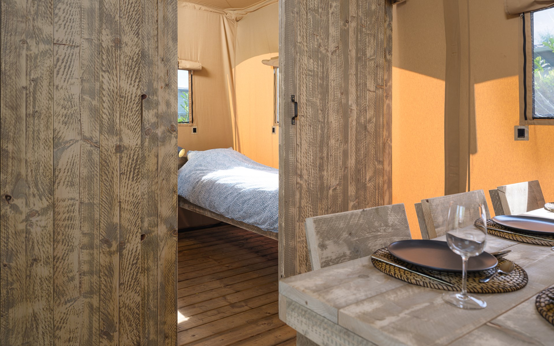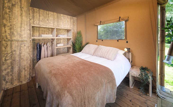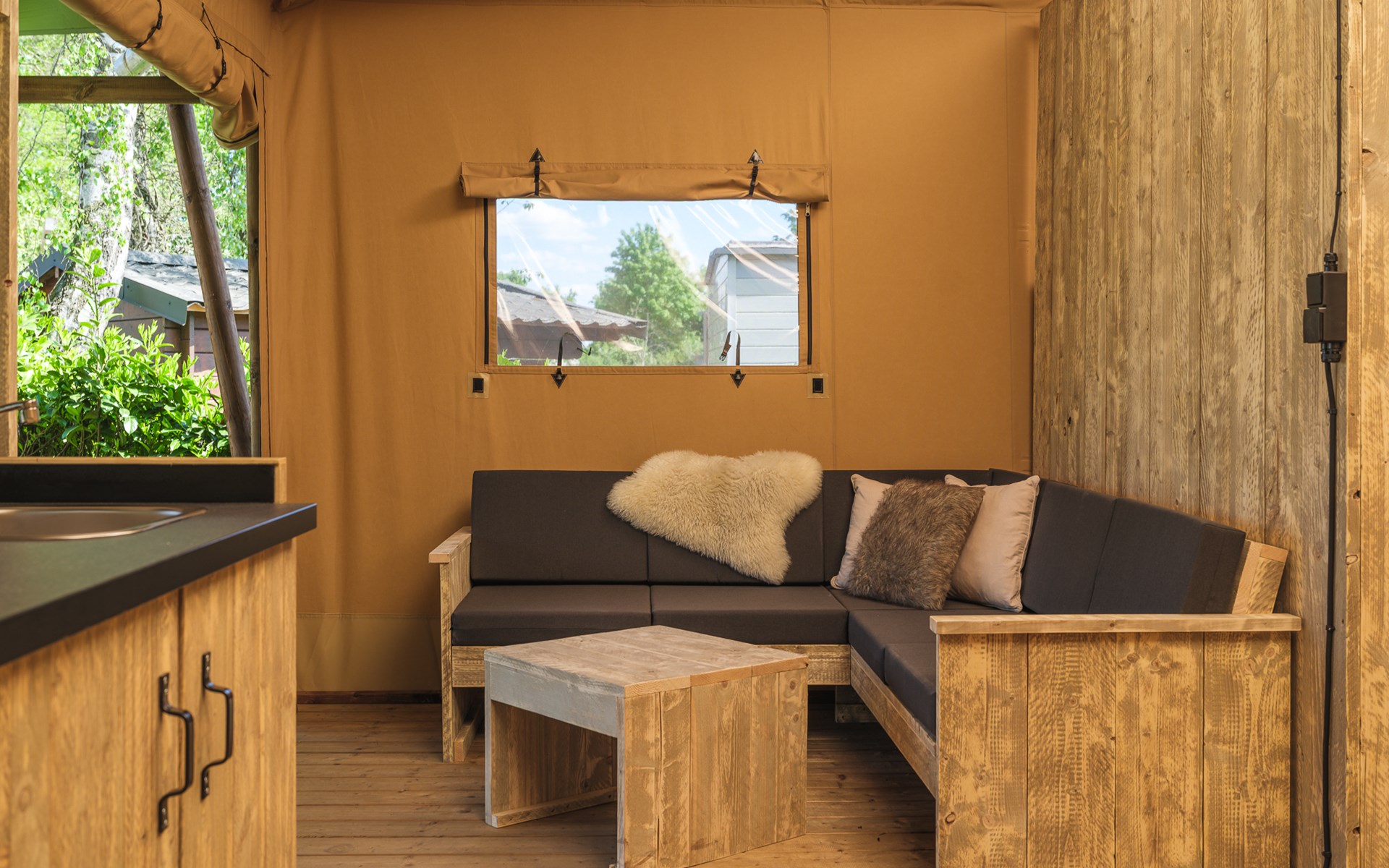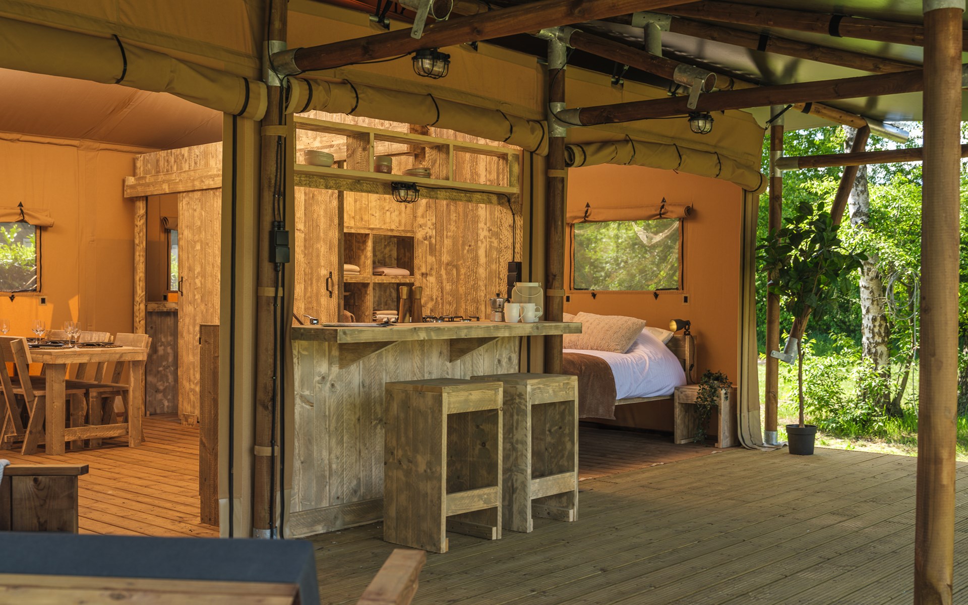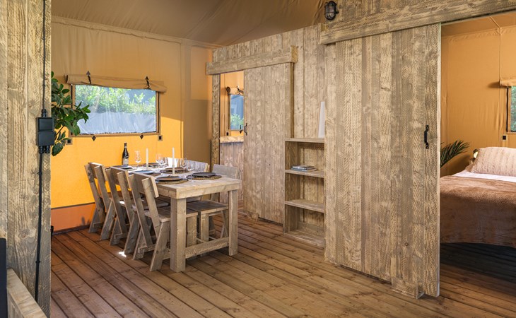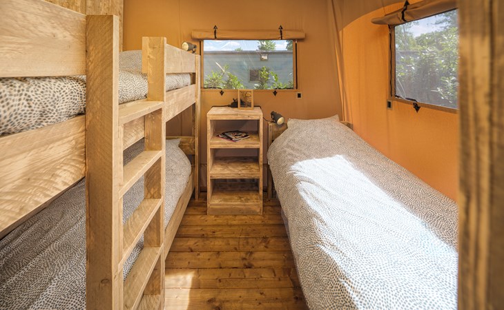 Die Safari-Suite ist für bis zu 5 Personen geeignet und bietet allen Komfort, den Sie brauchen. Das Zelt verfügt über einen gemütlichen Wohnbereich, eine ausgestattete Küche mit Kühlschrank, Geschirrspüler und Kochgelegenheit sowie eigene Sanitäranlagen. Sie können in einem komfortablen Hauptschlafzimmer mit einem Doppelbett und einem Kinderschlafzimmer mit Etagenbetten und einem Einzelbett schlafen. In de ouderslaapkamer past ook een kinderbedje.
