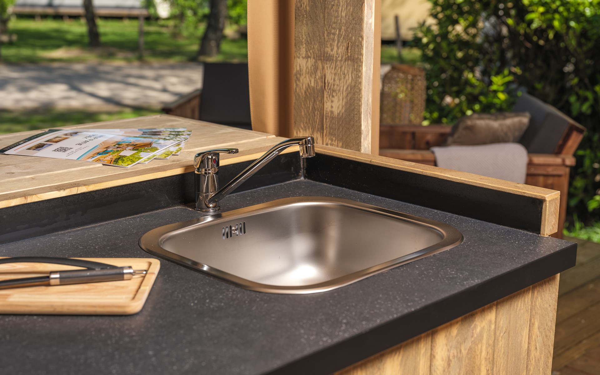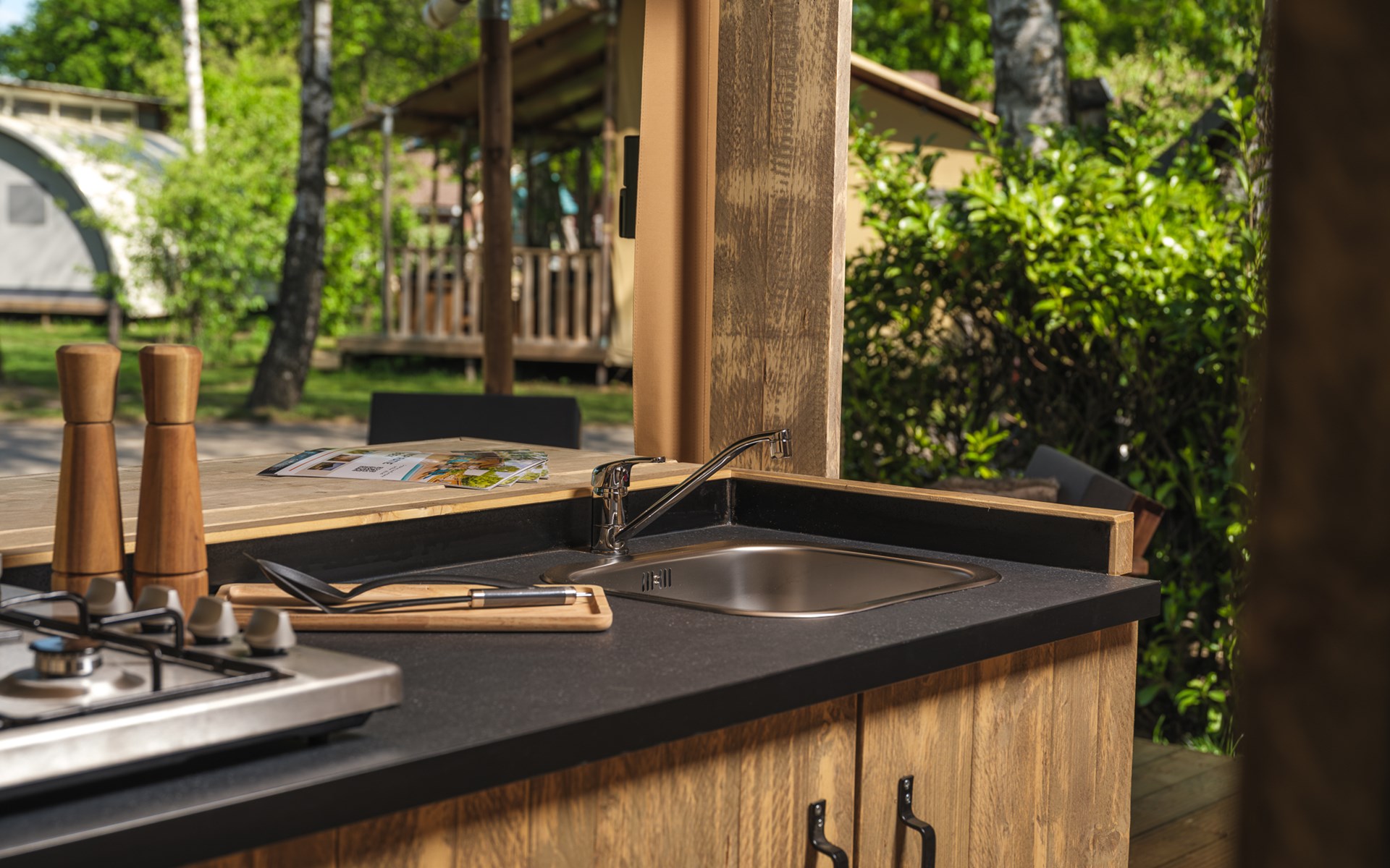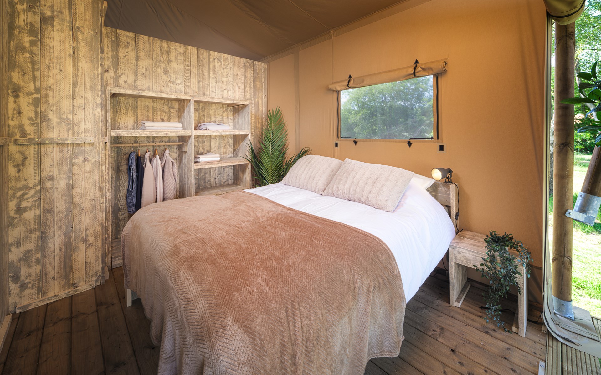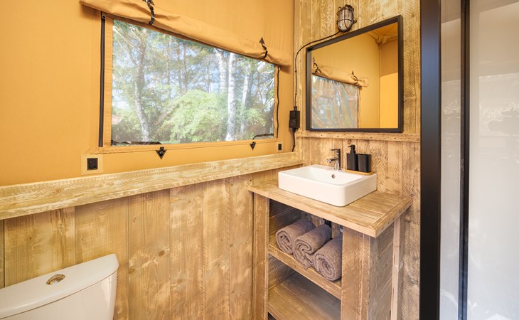 Die Safari-Suite ist für bis zu 5 Personen geeignet und bietet allen Komfort, den Sie brauchen. Das Zelt verfügt über einen gemütlichen Wohnbereich, eine ausgestattete Küche mit Kühlschrank, Geschirrspüler und Kochgelegenheit sowie eigene Sanitäranlagen. Sie können in einem komfortablen Hauptschlafzimmer mit einem Doppelbett und einem Kinderschlafzimmer mit Etagenbetten und einem Einzelbett schlafen. In de ouderslaapkamer past ook een kinderbedje.