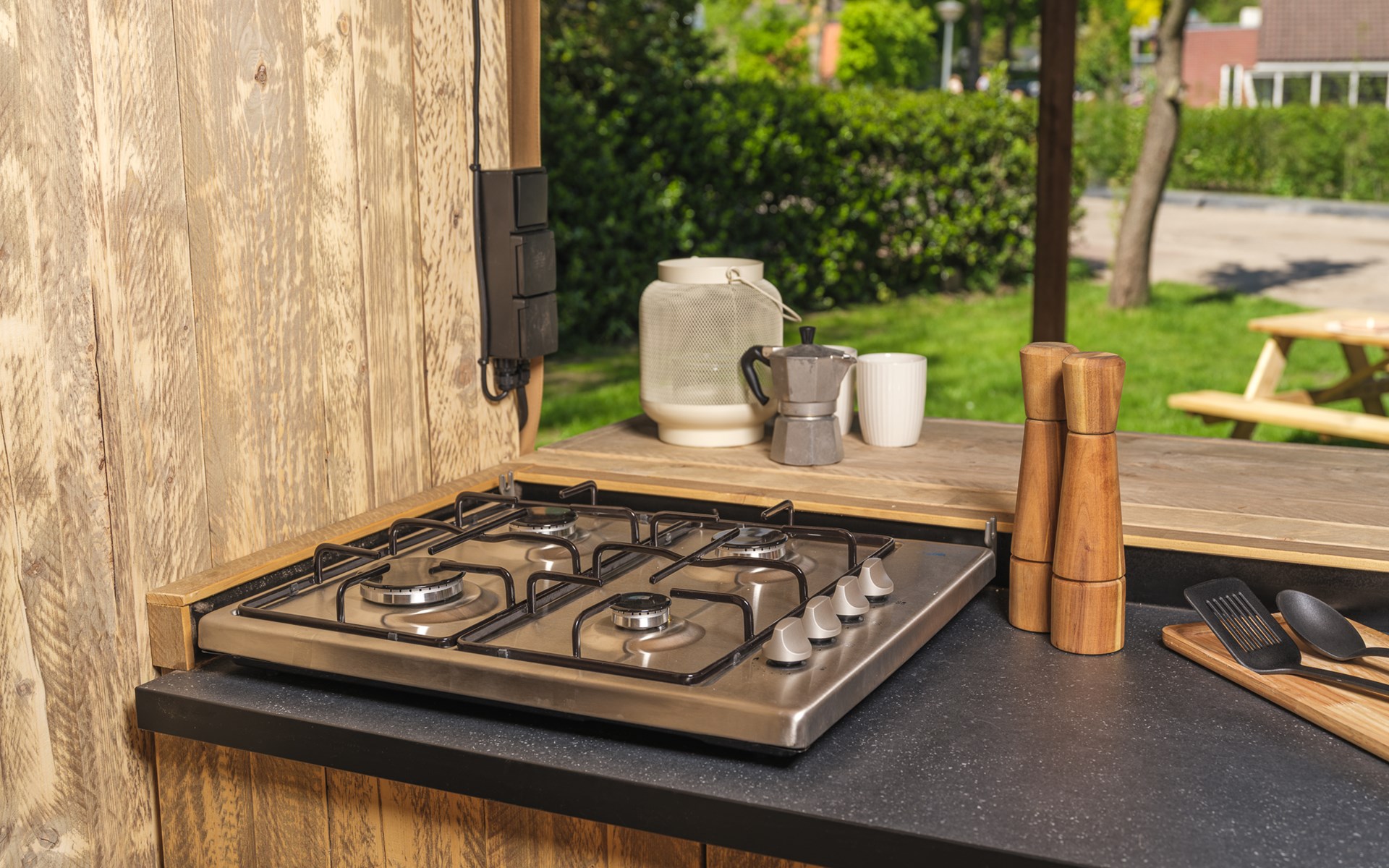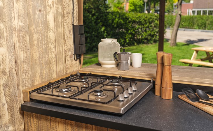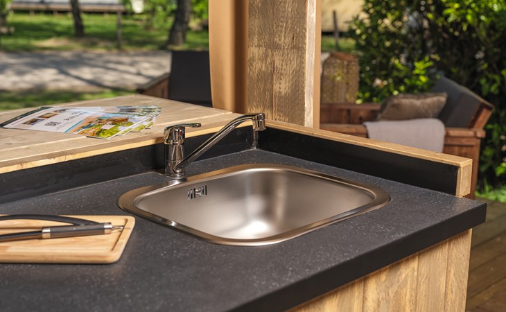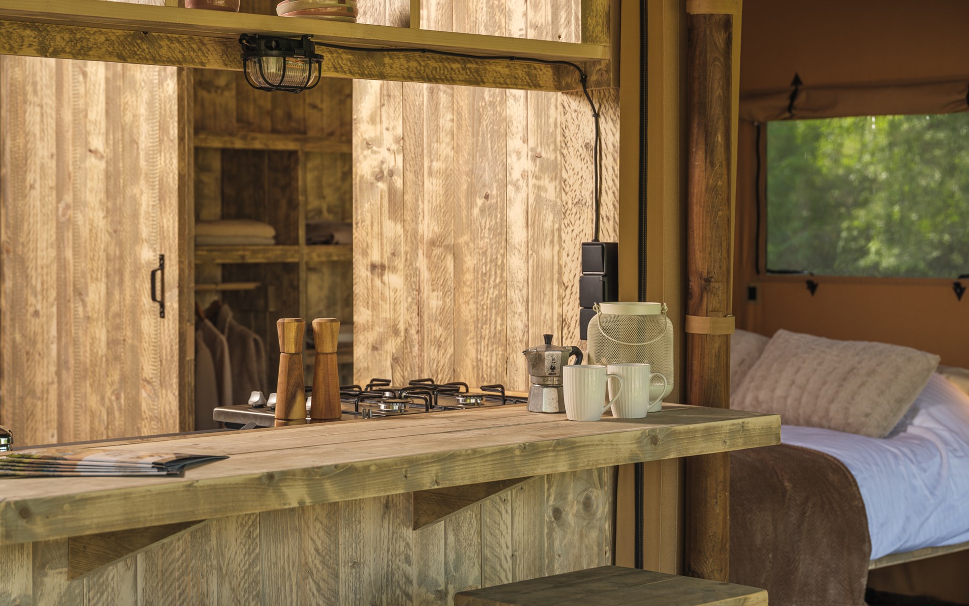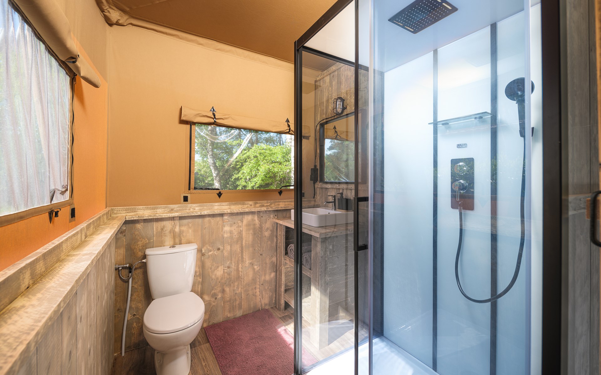 Die Safari-Suite ist für bis zu 5 Personen geeignet und bietet allen Komfort, den Sie brauchen. Das Zelt verfügt über einen gemütlichen Wohnbereich, eine ausgestattete Küche mit Kühlschrank, Geschirrspüler und Kochgelegenheit sowie eigene Sanitäranlagen. Sie können in einem komfortablen Hauptschlafzimmer mit einem Doppelbett und einem Kinderschlafzimmer mit Etagenbetten und einem Einzelbett schlafen. In de ouderslaapkamer past ook een kinderbedje.