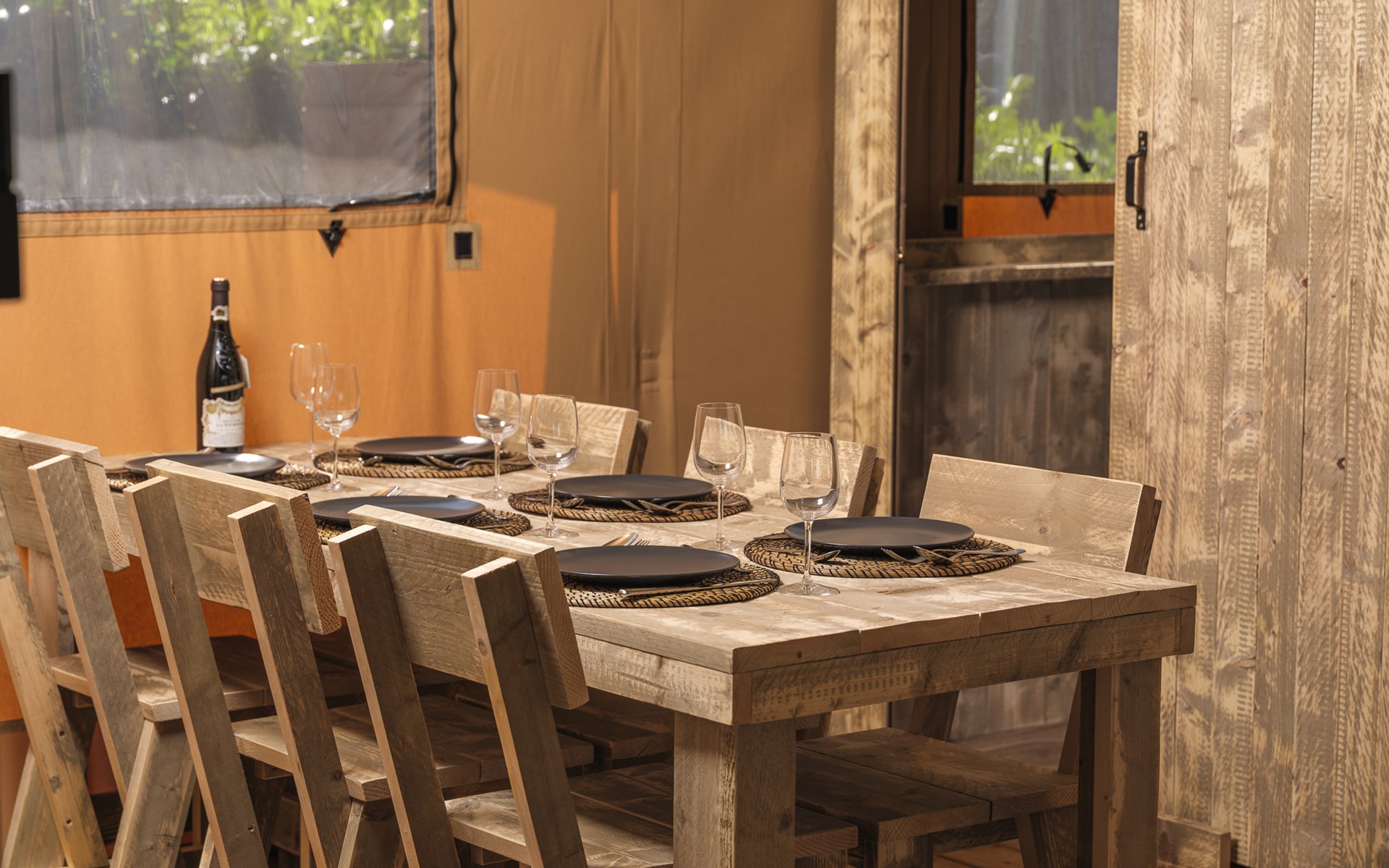 Setzen Sie sich mit einem guten Buch auf die Veranda oder genießen Sie einen Drink in der Sonne. Gemeinsam frühstücken oder ein Spiel spielen? Das ist an dem großen Esstisch im Inneren möglich. Unsere Safarizelte sind geräumig und ideal für einen entspannten Aufenthalt in der Natur.