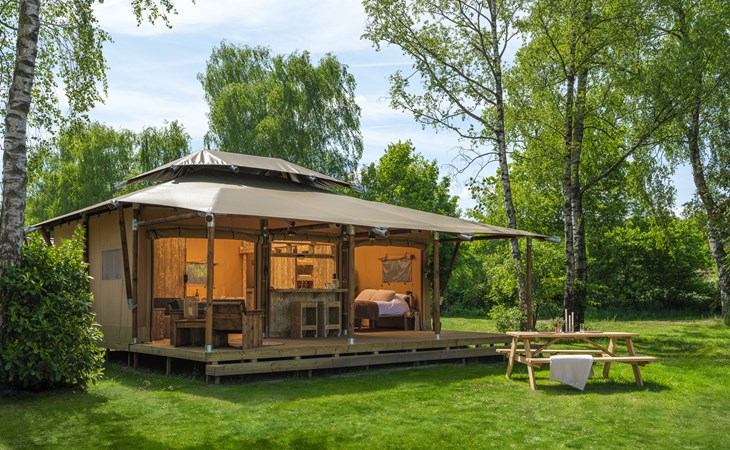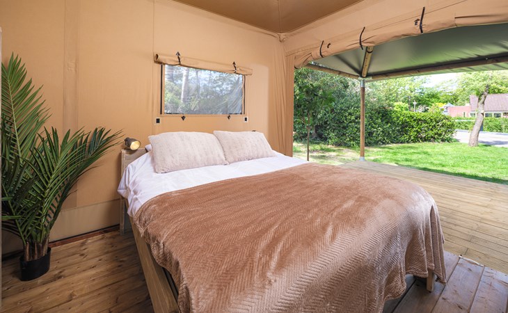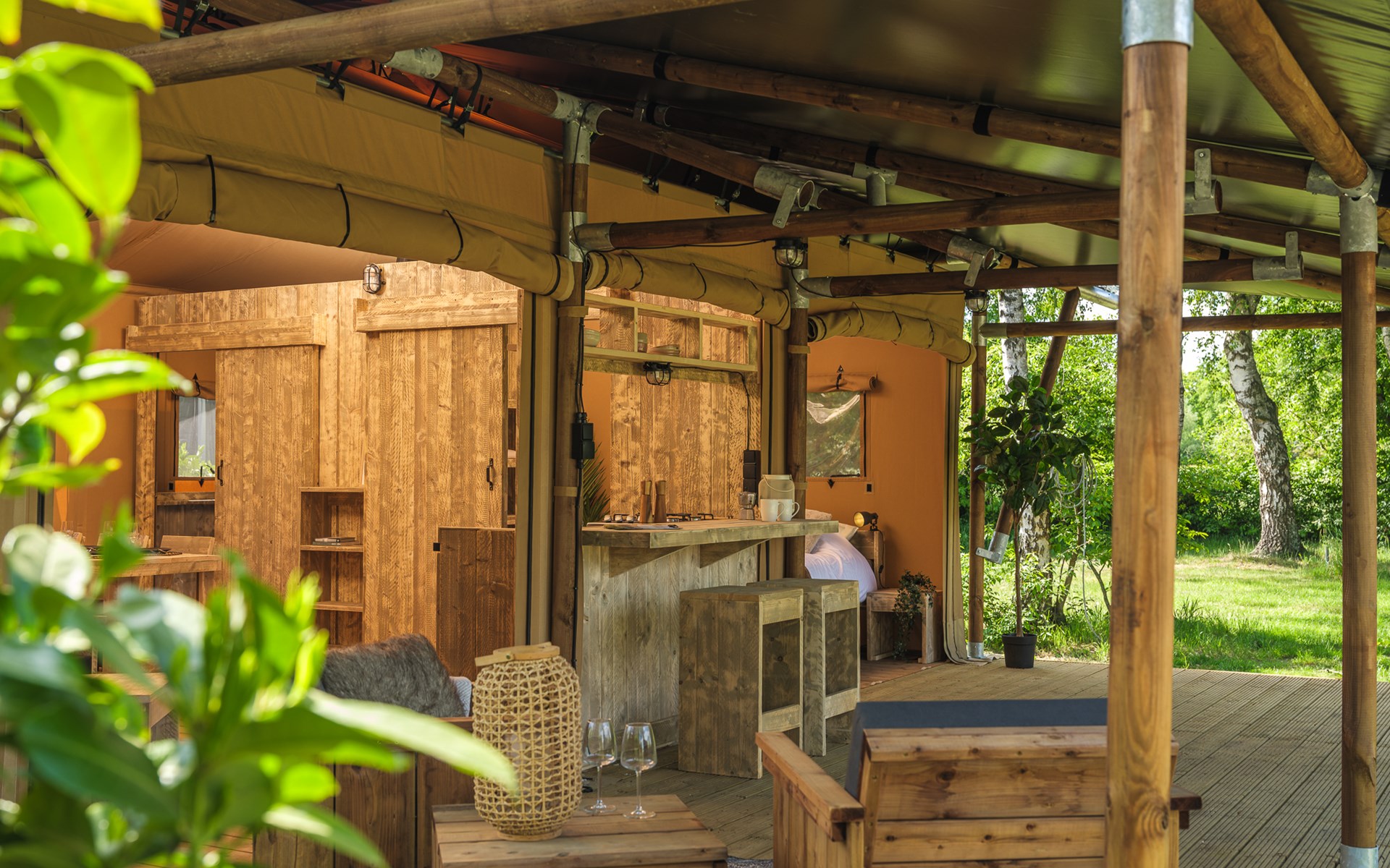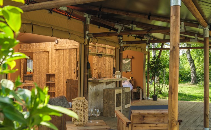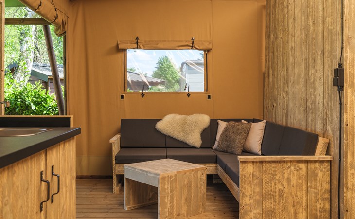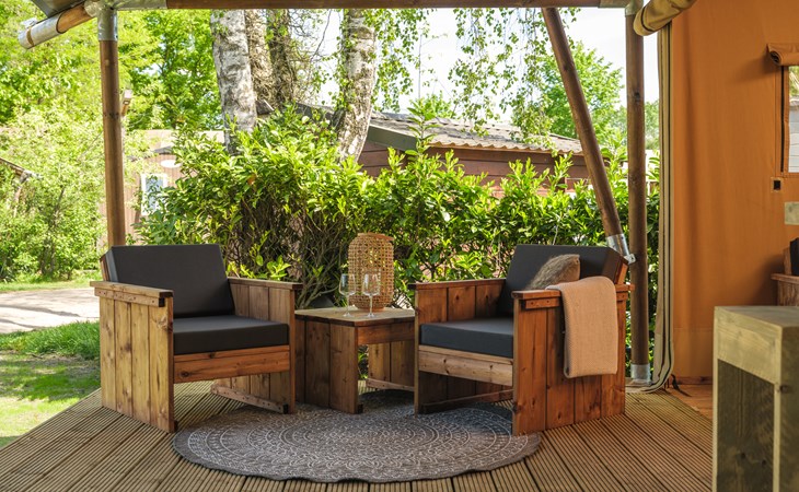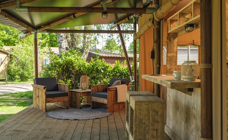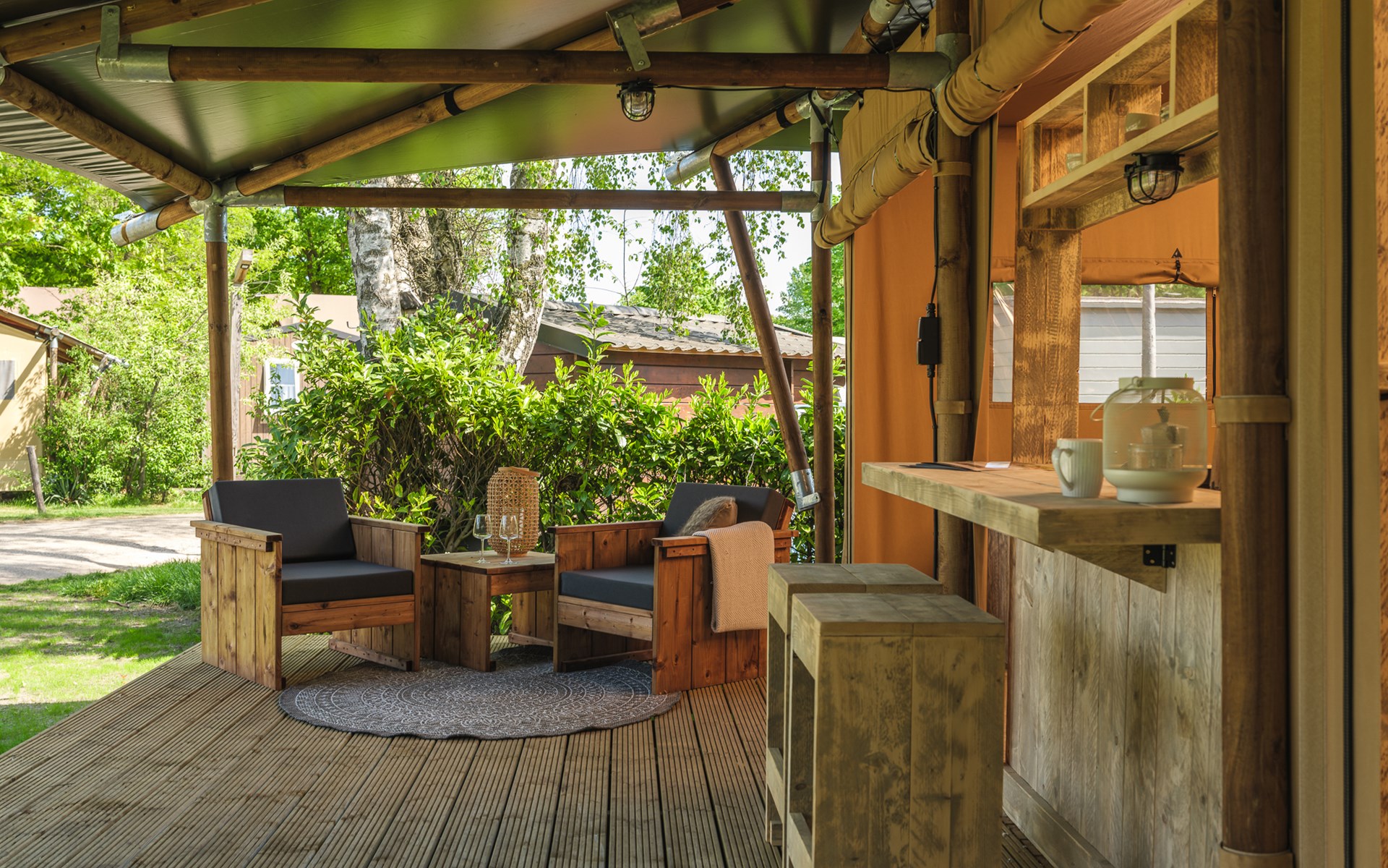Schauen Sie mal! Ein Zelt mit einer extragroßen Terrasse. In unserem Park halten wir ein gemütliches Safarizelt für Sie bereit. Dieses voll ausgestattete Zelt hat ein extra großes Dach an der Vorderseite, so dass Sie das Leben im Freien in vollen Zügen genießen können. Sie finden unsere Safarizelte an mehreren Stellen im Park. Möchten Sie sich Ihren Lieblingsplatz selbst aussuchen? Dann buchen Sie über den Grundriss!