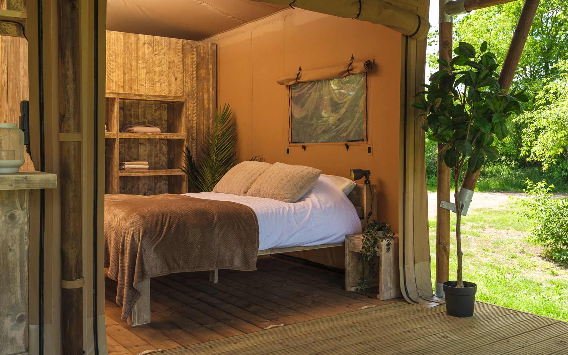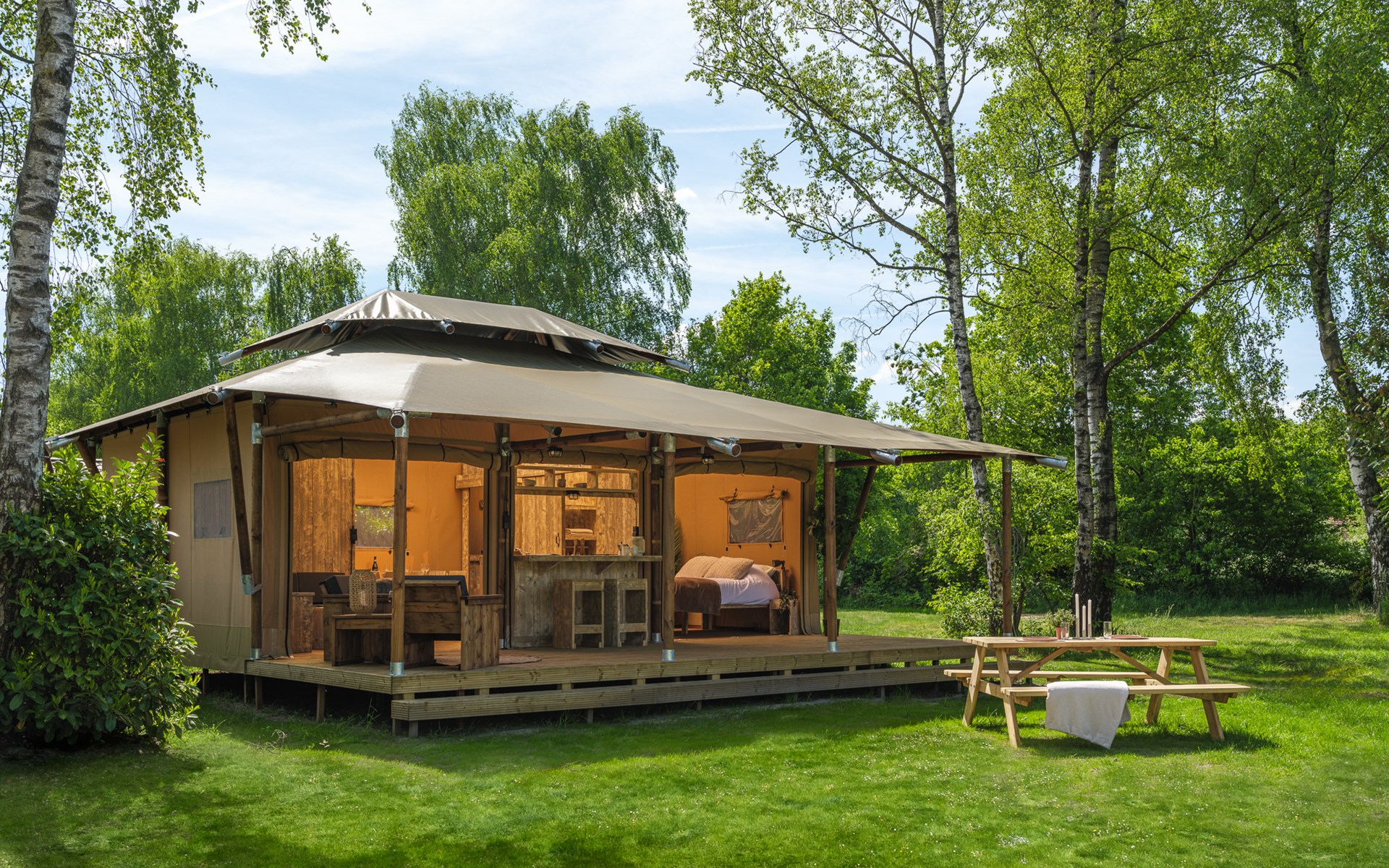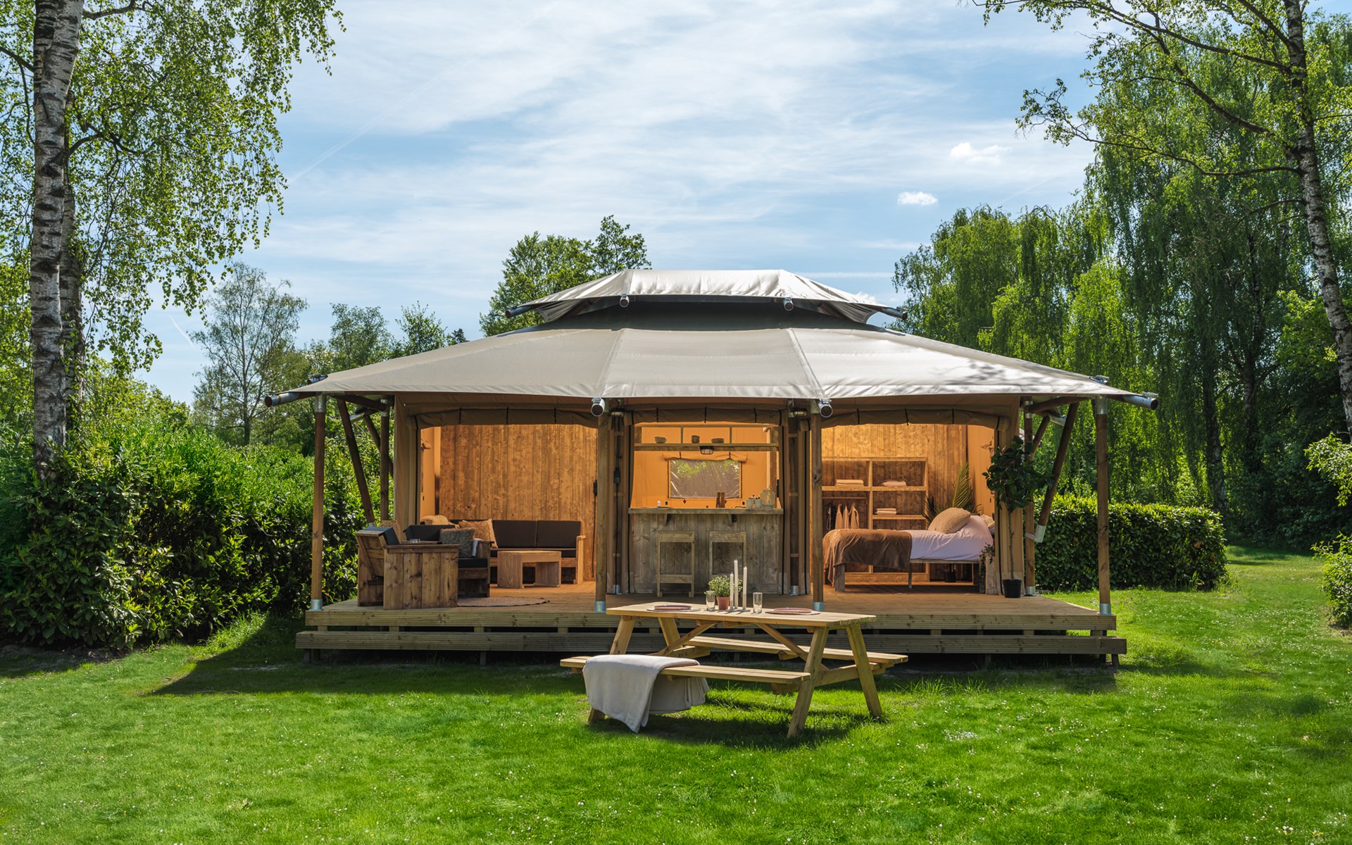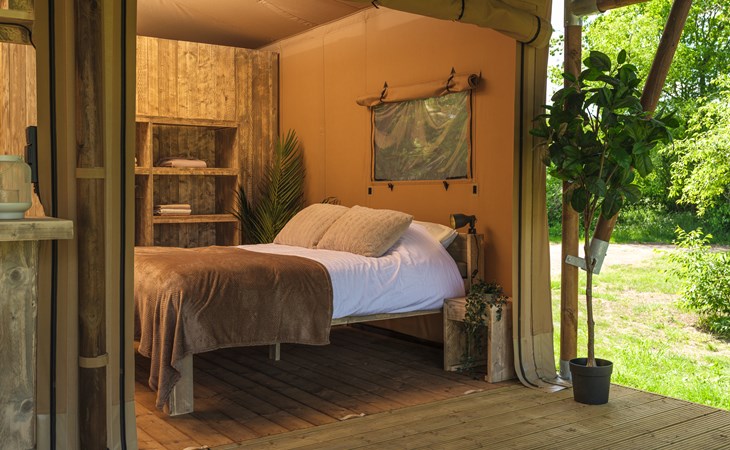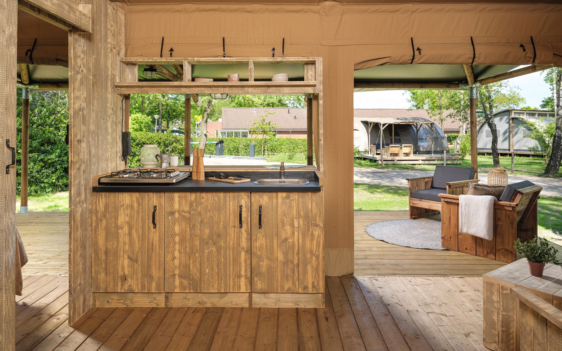 Schauen Sie mal! Ein Zelt mit einer extragroßen Terrasse. In unserem Park halten wir ein gemütliches Safarizelt für Sie bereit. Dieses voll ausgestattete Zelt hat ein extra großes Dach an der Vorderseite, so dass Sie das Leben im Freien in vollen Zügen genießen können. Sie finden unsere Safarizelte an mehreren Stellen im Park. Möchten Sie sich Ihren Lieblingsplatz selbst aussuchen? Dann buchen Sie über den Grundriss!