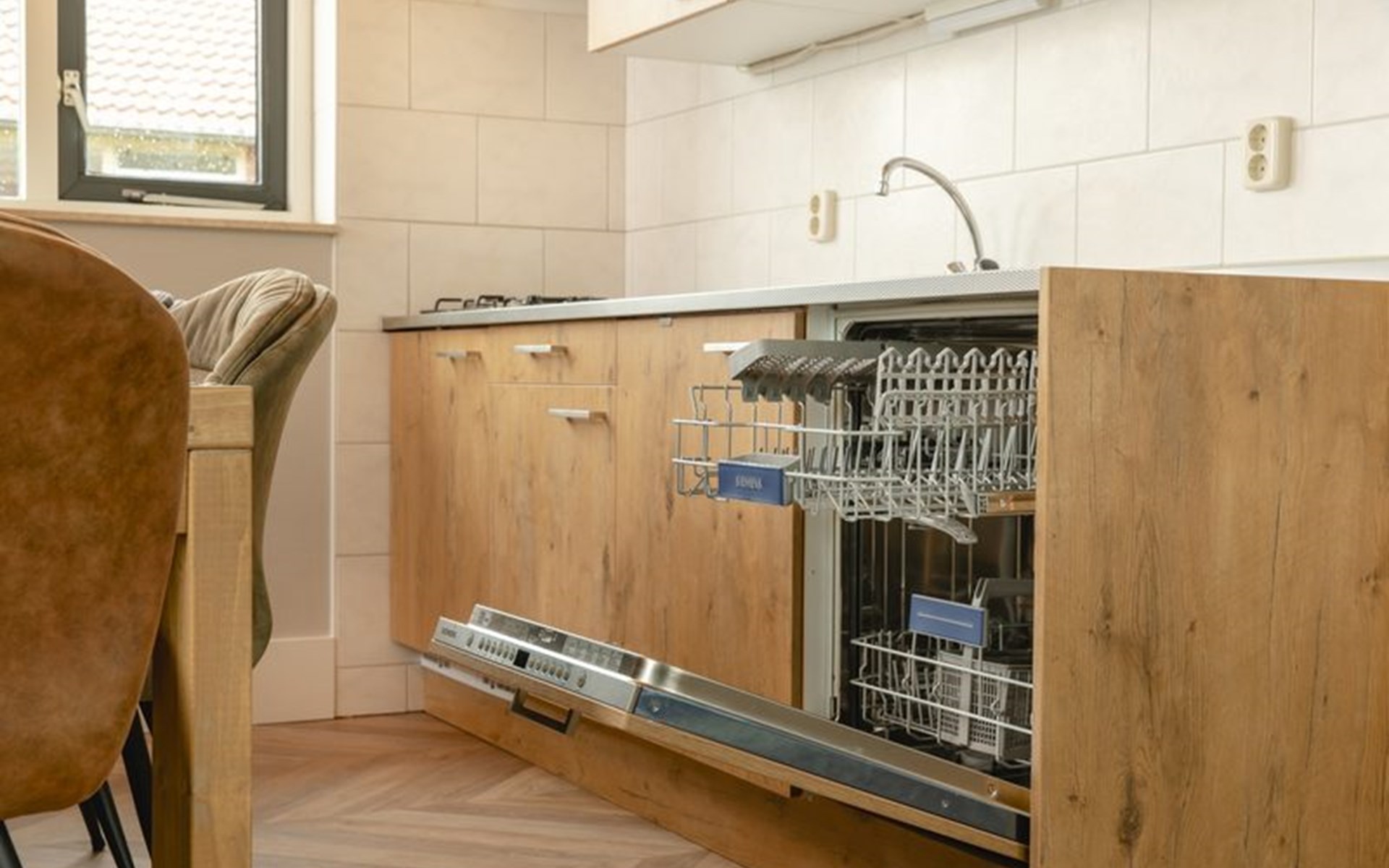 Drinnen fühlt es sich an, als wärst du mitten in einem Twenter Bauernhof. Das Wohnzimmer ist liebevoll thematisiert und bietet genug Platz für alle. Die Küche ist modern ausgestattet mit Geschirrspüler, Mikrowelle und allem, was du brauchst, um gemeinsam stressfrei zu kochen.
