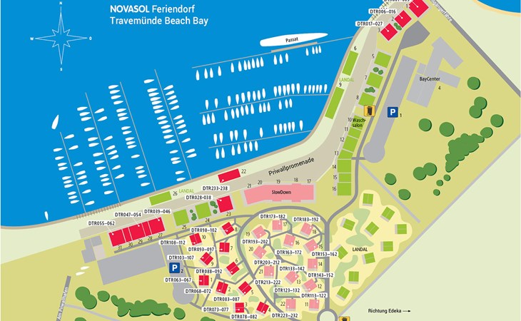 Zu dem Ferienresort „BeachBay“ gehören u.a. Rezeption, Shops, Restaurants und Bars, Eisdiele, Spielplätze, Fahrradverleih, Waschsalon und die Ostseestation (Umweltzentrum und Aquarien mit heimischen Meerestieren).