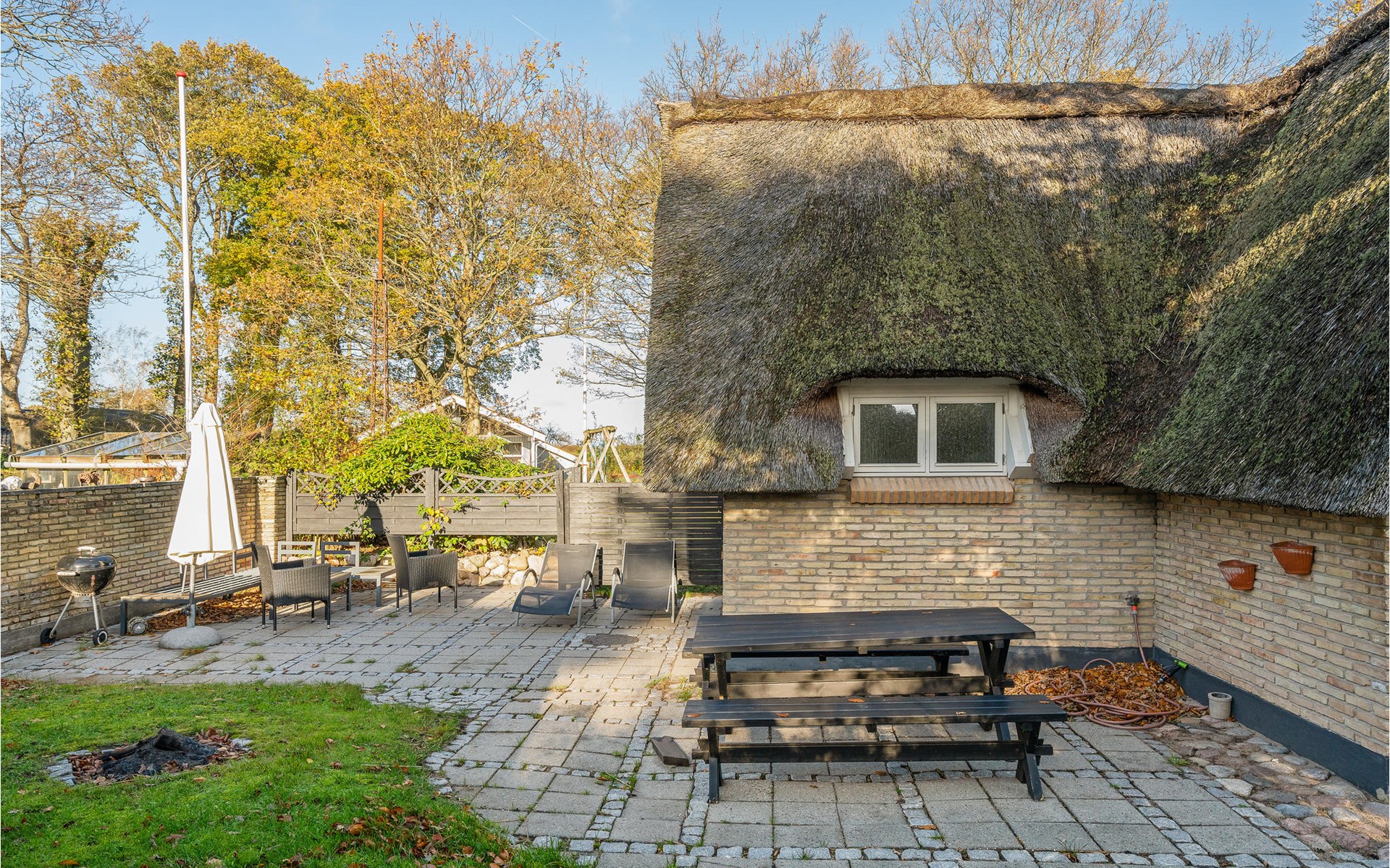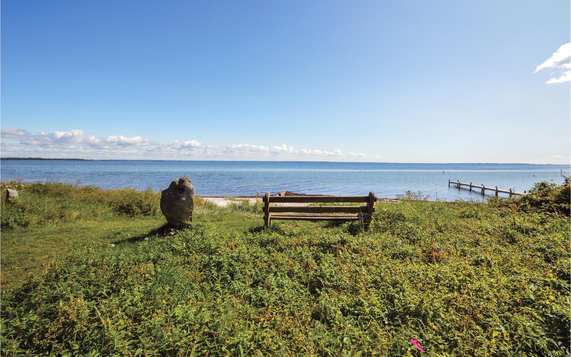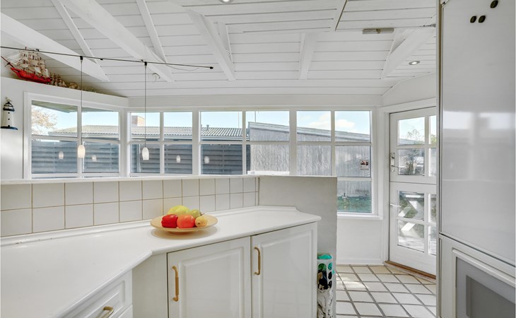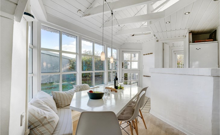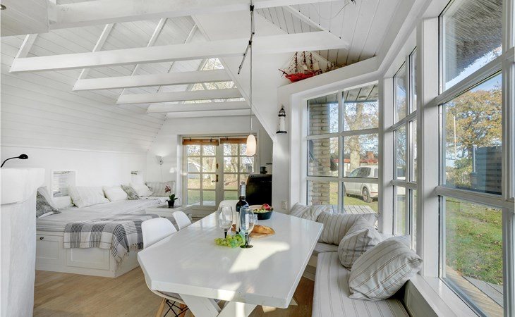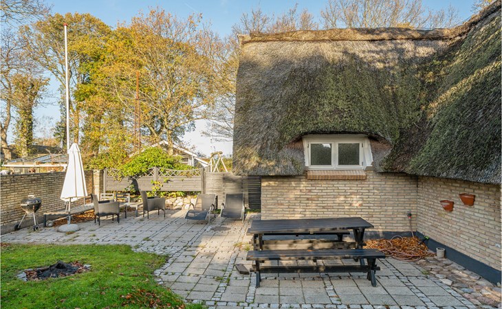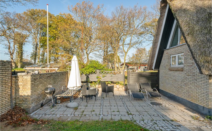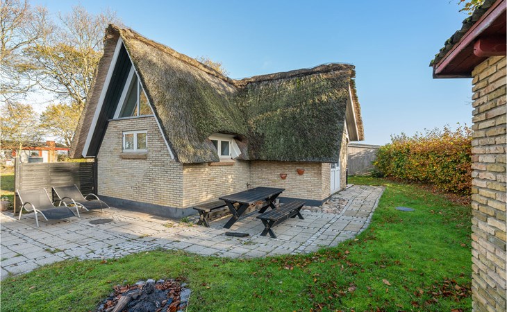 Dieses charmante Landhaus ist aus Stein gebaut und mit Stroh gedeckt. Das Haus befindet sich in der wunderschönen Umgebung des Sandersvig Standes. Das Haus wirkt innen hell und freundlich, und in Teilen des Hauses gibt es einen offenen Dachfirst mit freiliegenden Balken. Das Haus strahlt eine traditionelle Ferienhausatmosphäre aus. Das Haus verfügt über eine kleine Küche, die zum Wohnzimmer hin durch eine halbe Wand getrennt ist, im Wohnzimmer befinden sich ein Essbereich, ein Sofa, ein Holzofen und ein Fernseher. Das Haus verfügt über zwei Schlafzimmer, eines davon mit einem Doppelbett. Die Terrasse liegt gut platziert auf dem gemütlichen Gelände mit Blick auf das Wasser. Der Strand liegt direkt hinter dem nächsten Haus, so dass Sie leicht zum Wasser gelangen.