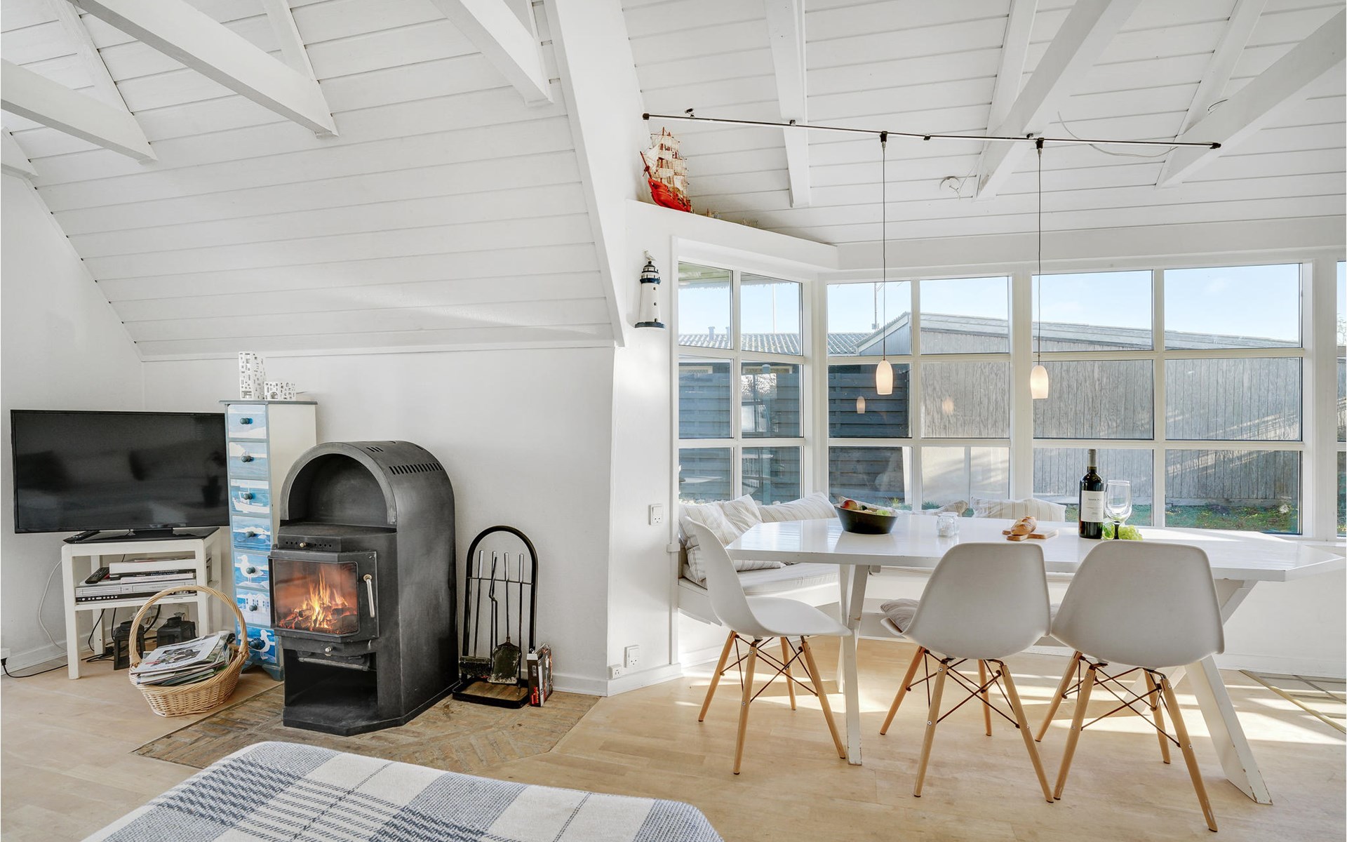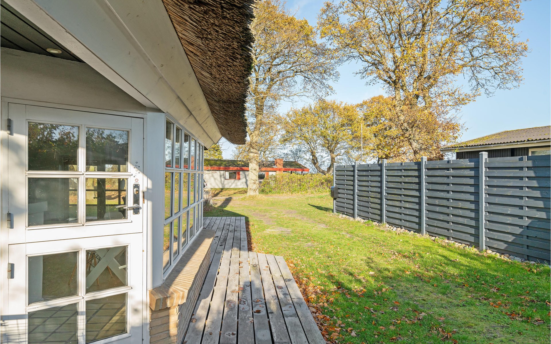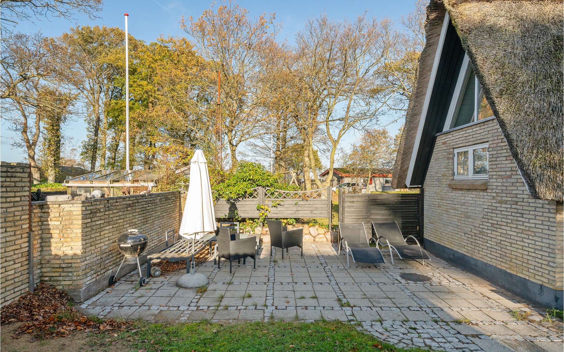 Dieses charmante Landhaus ist aus Stein gebaut und mit Stroh gedeckt. Das Haus befindet sich in der wunderschönen Umgebung des Sandersvig Standes. Das Haus wirkt innen hell und freundlich, und in Teilen des Hauses gibt es einen offenen Dachfirst mit freiliegenden Balken. Das Haus strahlt eine traditionelle Ferienhausatmosphäre aus. Das Haus verfügt über eine kleine Küche, die zum Wohnzimmer hin durch eine halbe Wand getrennt ist, im Wohnzimmer befinden sich ein Essbereich, ein Sofa, ein Holzofen und ein Fernseher. Das Haus verfügt über zwei Schlafzimmer, eines davon mit einem Doppelbett. Die Terrasse liegt gut platziert auf dem gemütlichen Gelände mit Blick auf das Wasser. Der Strand liegt direkt hinter dem nächsten Haus, so dass Sie leicht zum Wasser gelangen.