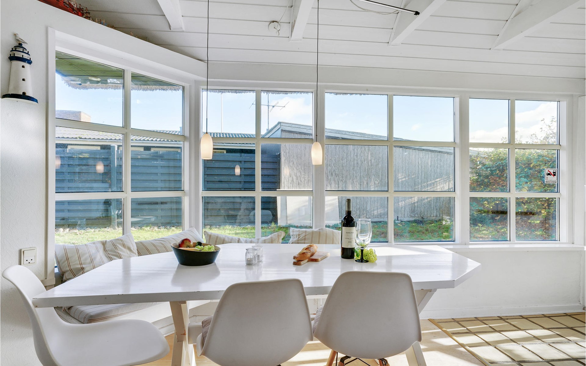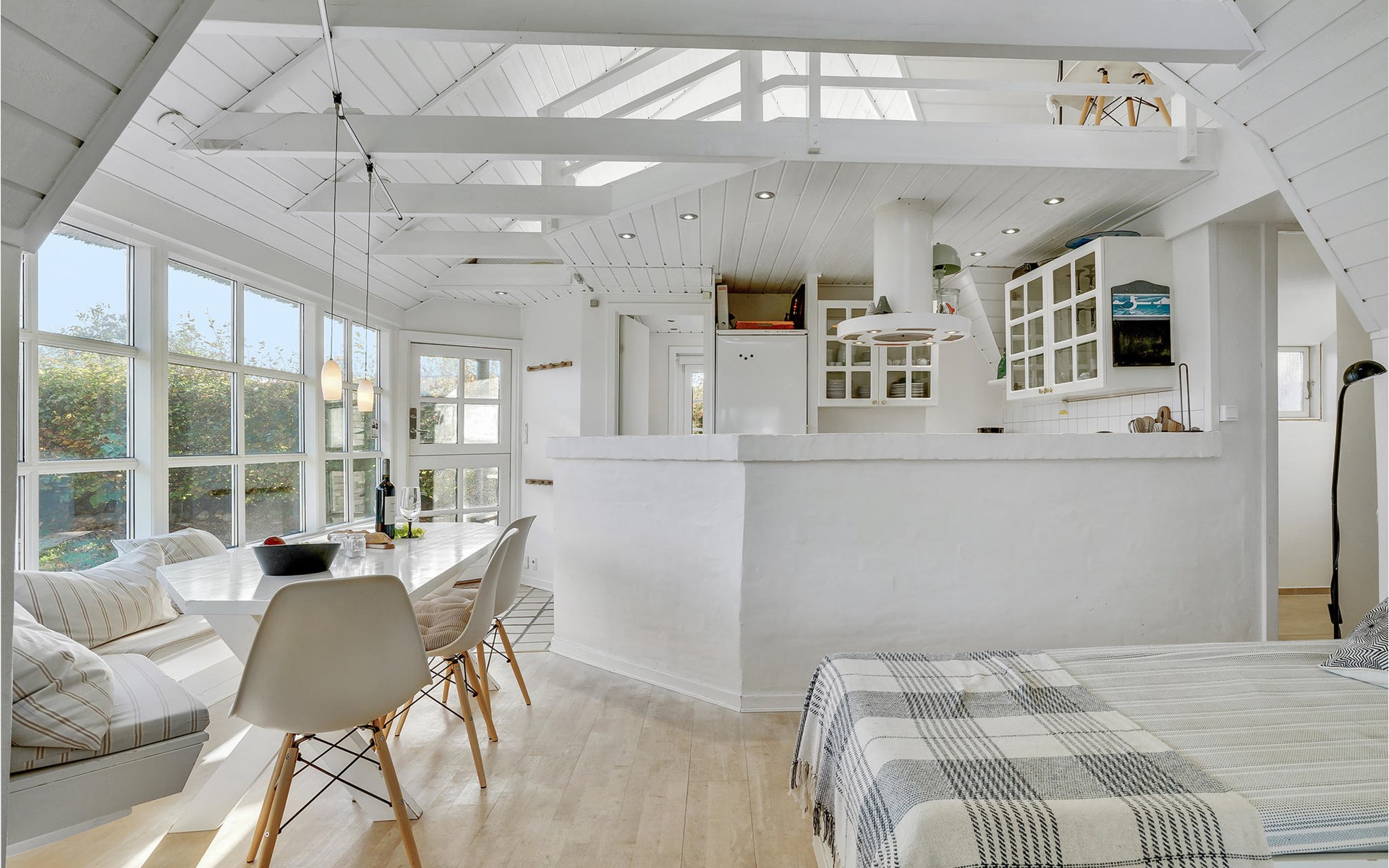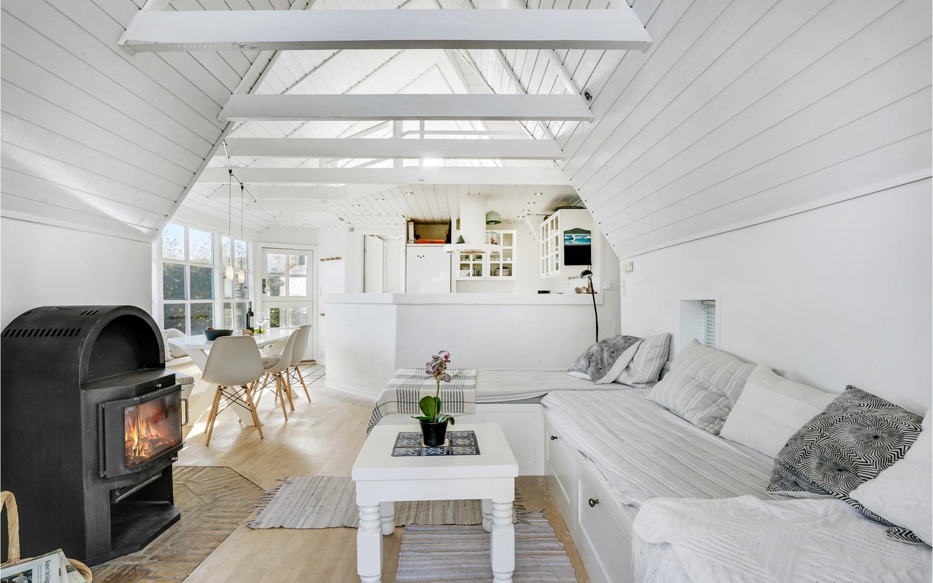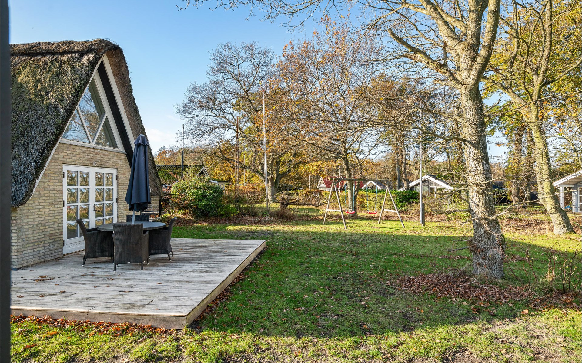 Dieses charmante Landhaus ist aus Stein gebaut und mit Stroh gedeckt. Das Haus befindet sich in der wunderschönen Umgebung des Sandersvig Standes. Das Haus wirkt innen hell und freundlich, und in Teilen des Hauses gibt es einen offenen Dachfirst mit freiliegenden Balken. Das Haus strahlt eine traditionelle Ferienhausatmosphäre aus. Das Haus verfügt über eine kleine Küche, die zum Wohnzimmer hin durch eine halbe Wand getrennt ist, im Wohnzimmer befinden sich ein Essbereich, ein Sofa, ein Holzofen und ein Fernseher. Das Haus verfügt über zwei Schlafzimmer, eines davon mit einem Doppelbett. Die Terrasse liegt gut platziert auf dem gemütlichen Gelände mit Blick auf das Wasser. Der Strand liegt direkt hinter dem nächsten Haus, so dass Sie leicht zum Wasser gelangen.