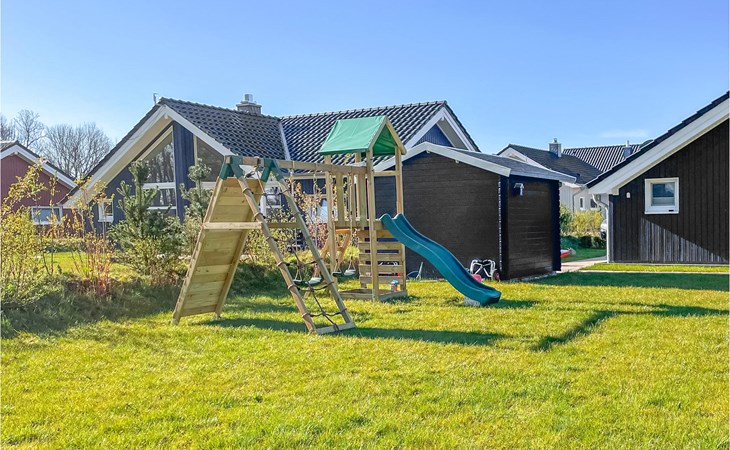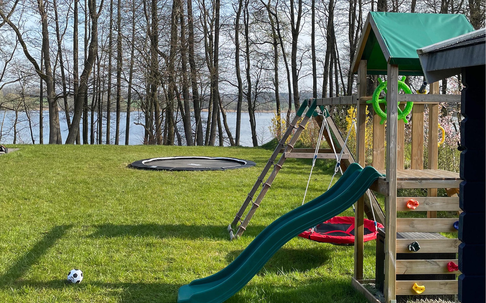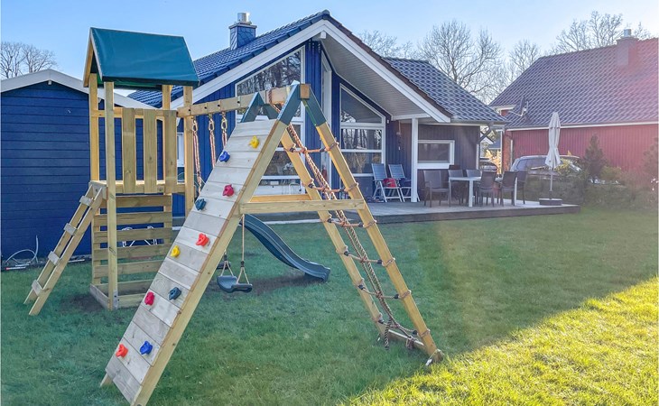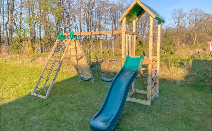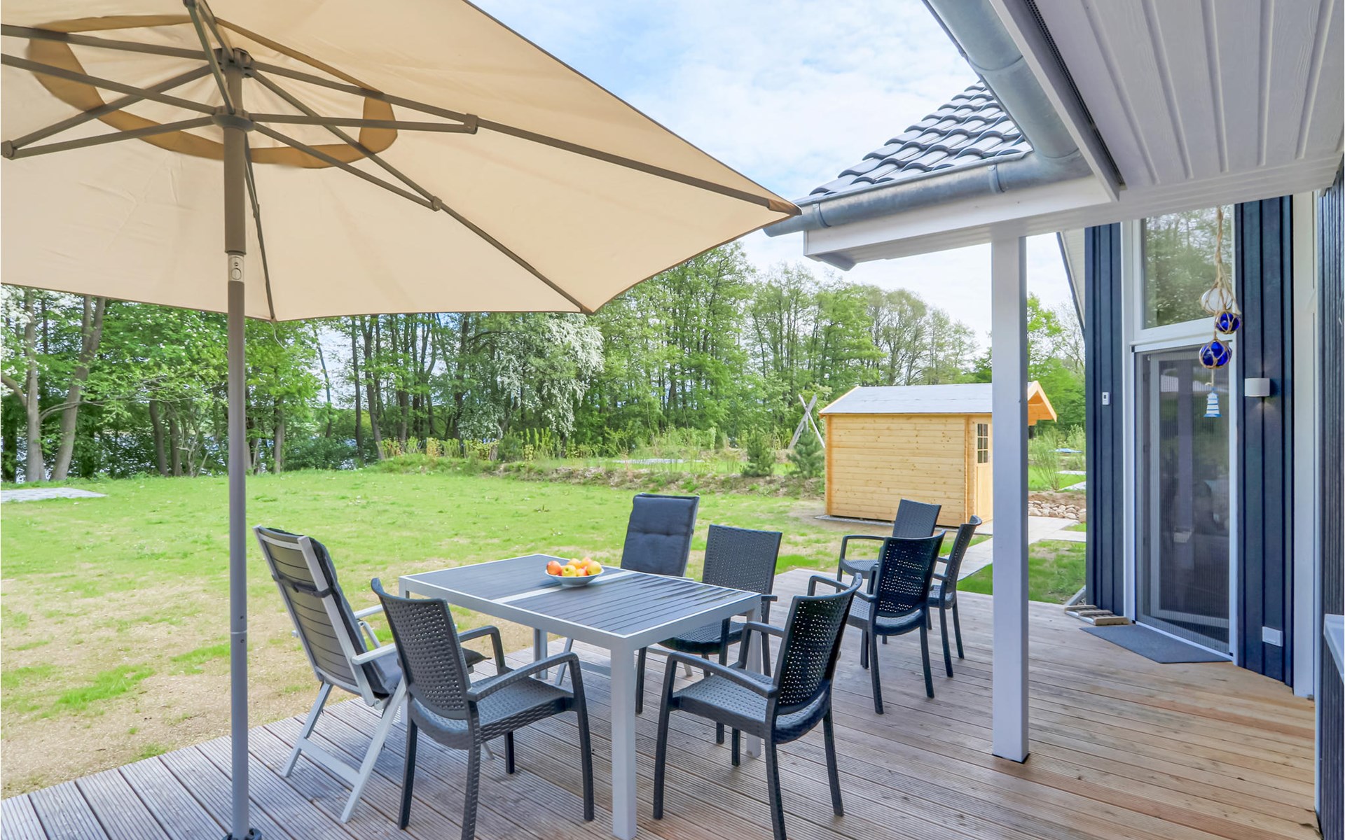 Auf der großzügigen Terrasse können Sie herrlich entspannen und mit der ganzen Familie frühstücken. Gartenmöbel und Sonnenliegen stehen für Sie zur Verfügung. Für die kleinen Gäste gibt es ein Kinderspielgerüst mit Schaukeln, Rutsche und Kletterwand. Das dargestellte Gartenhäuschen ist privat und kann nicht genutzt werden.