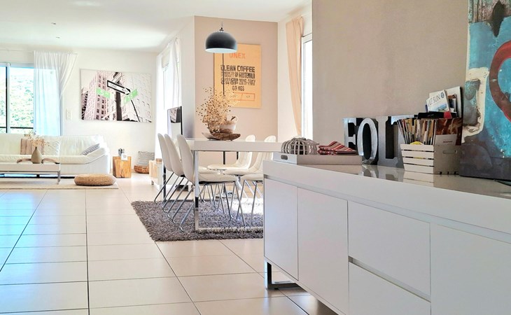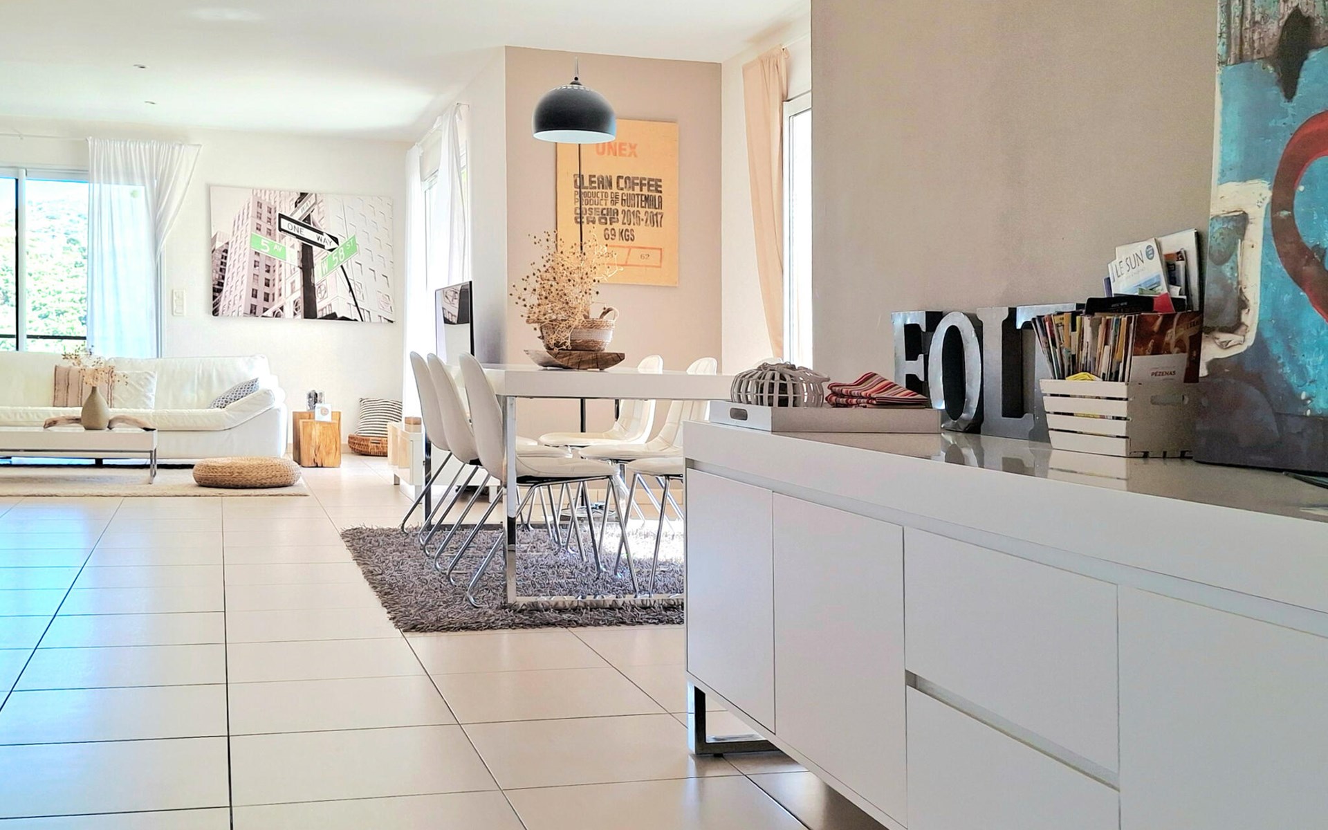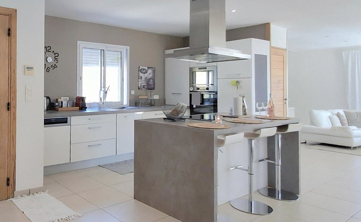 Neben einer ultramodernen Küche mit Kochinsel, die sich zum großen Wohnzimmer hin öffnet, verfügt die geschmackvoll eingerichtete Unterkunft zudem über ein Badezimmer mit sowohl Wanne als auch Dusche.