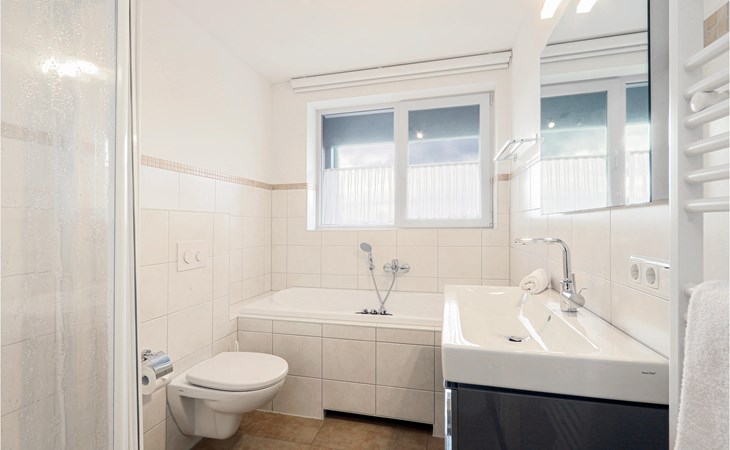 Das großzügige Duschbad verfügt über eine Whirlwanne, in der Sie herrlich entspannen können. Ein Haarföhn steht hier für Sie zur Verfügung.