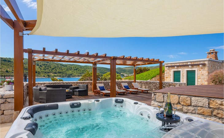 Genießen Sie ein Bad im Whirlpool im Freien und lassen Sie sich vom atemberaubenden Meerblick verzaubern. Natürlich steht Ihnen auch ein Grill zur Verfügung, außerdem gibt es eine Sommerküche.