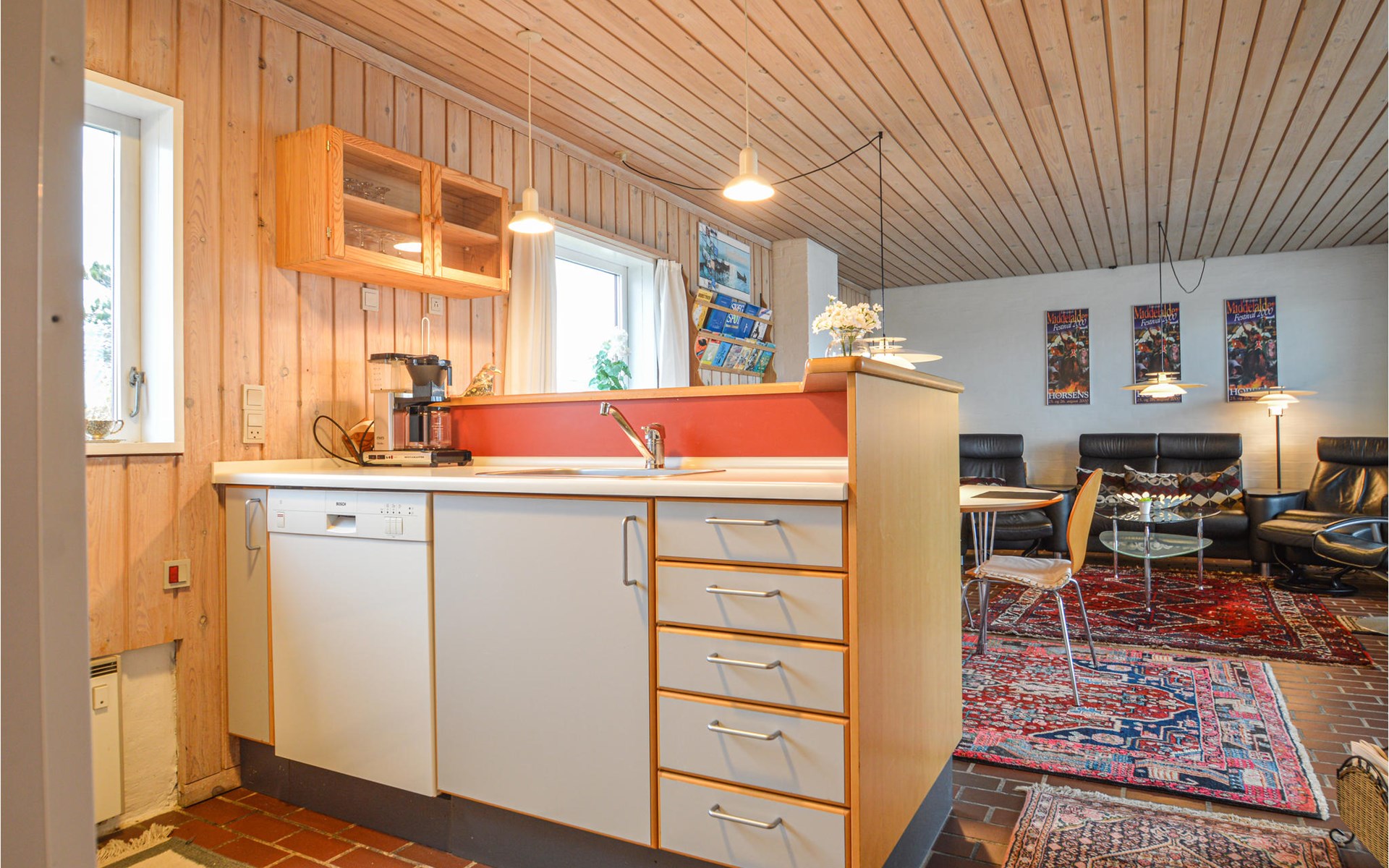 Im Inneren des Ferienhauses erwartet Sie eine gemütliche Einrichtung mit unter anderem Kaminofen. Das Herz des Hauses bildet das gemütliche Wohnzimmer mit offener Küche und Essbereich. Auf der umzäunten Terrasse mit Gartenmäbeln können Sie gut windgeschützt sitzen und schöne Stunden verbringen.