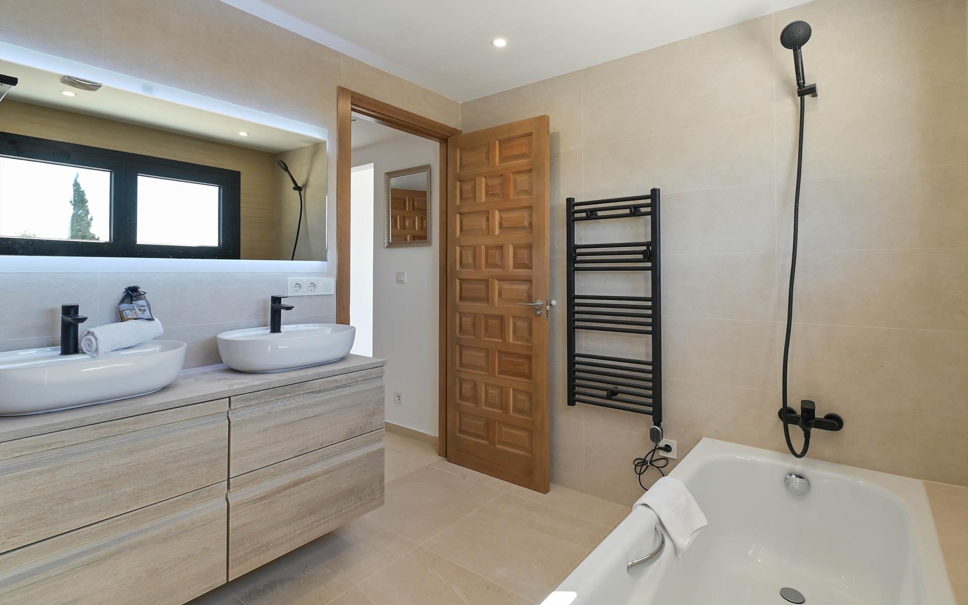 - Eigenes Badezimmer mit Doppelwaschbecken, Badewanne und Toilette