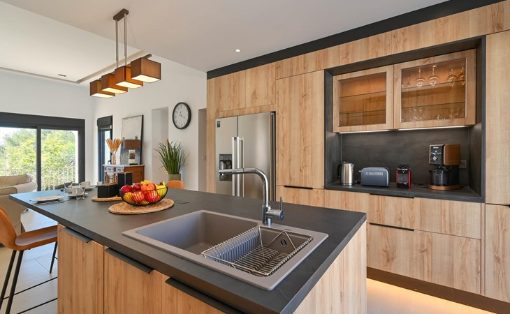 - Offene Küche mit Elektroherd, Elektroofen, Mikrowelle, Geschirrspüler, Kühl-Gefrierkombination, Kaffeemaschine, Wasserkocher, Mixer und Toaster