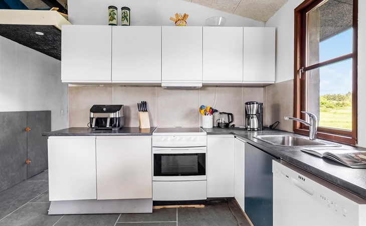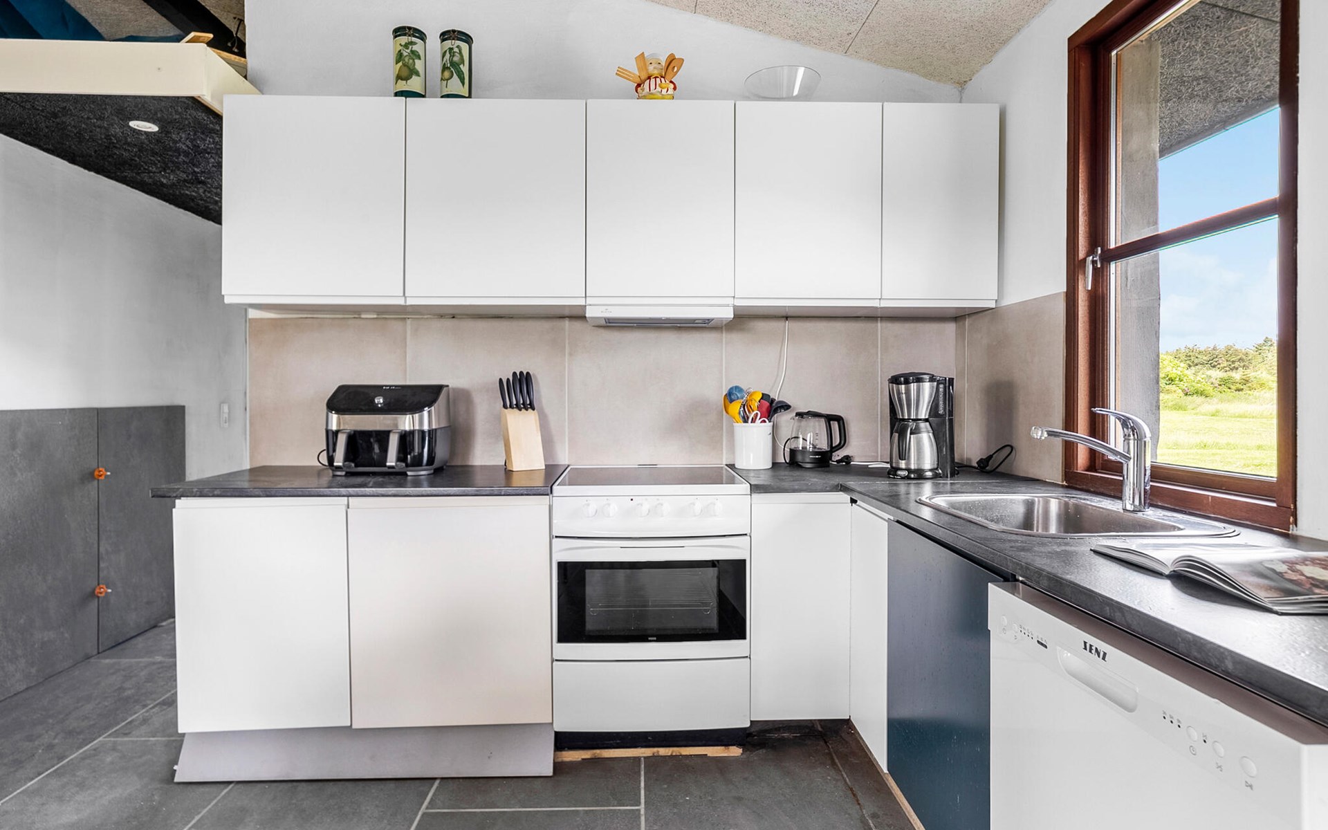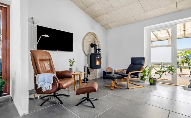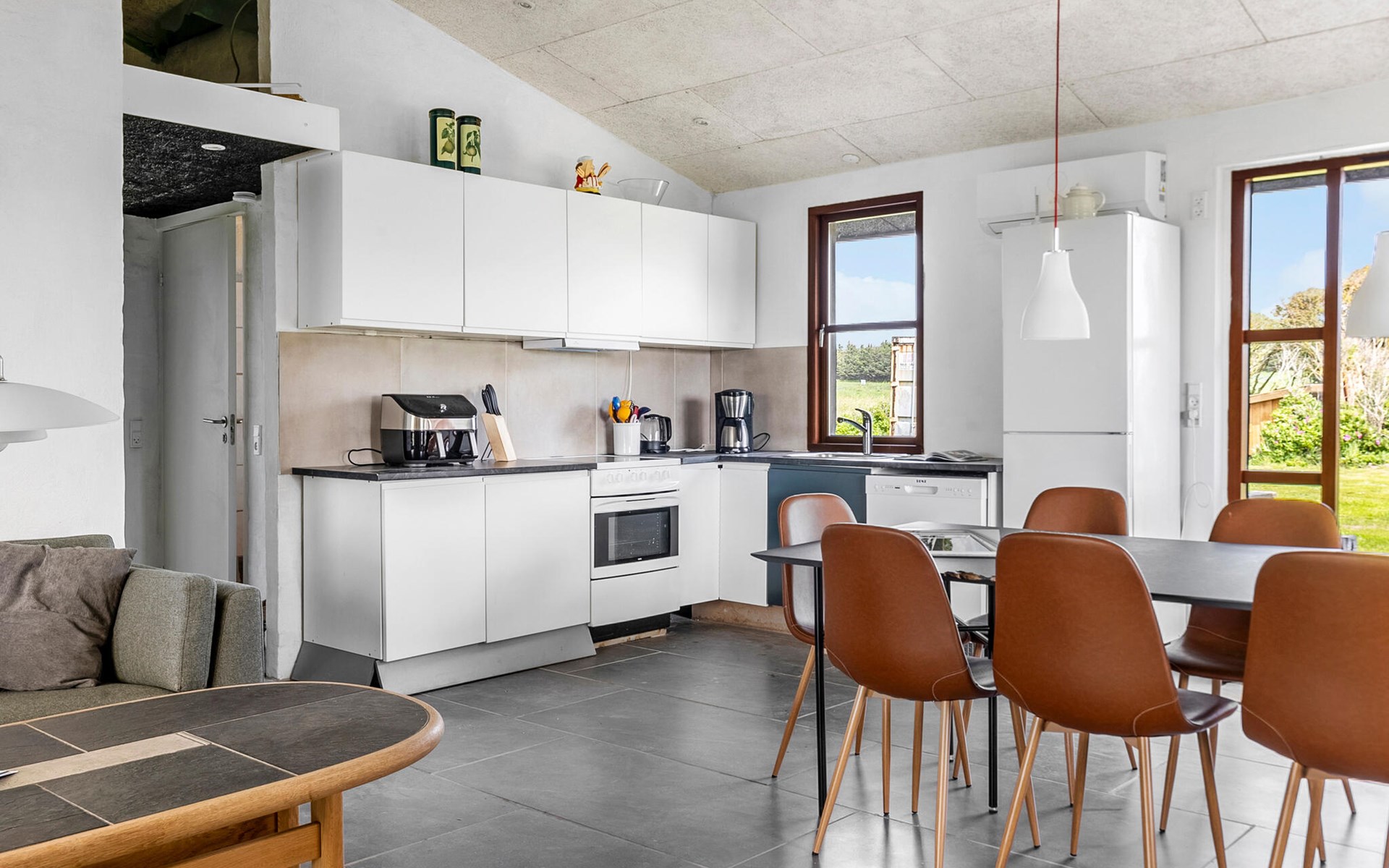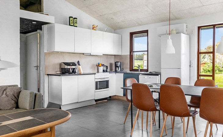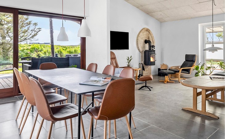 Ihr Ferienhaus bietet eine gelungene Balance zwischen Natur, Komfort und nordischem Design. Das durchdachte Raumkonzept schaffen eine einladende Atmosphäre für entspannte Urlaubsmomente. Machen Sie es sich im großzügigen Wohnbereich mit Kaminofen und gemütlicher Sofaecke bequem. Nutzen Sie die bodentiefen Fenster, um den Blick in die Landschaft zu genießen oder verbringen Sie gesellige Stunden am Esstisch mit direktem Zugang zur überdachten Terrasse. Die offene Küche ist praktisch gestaltet und ermöglicht es Ihnen, gemeinsam zu kochen.