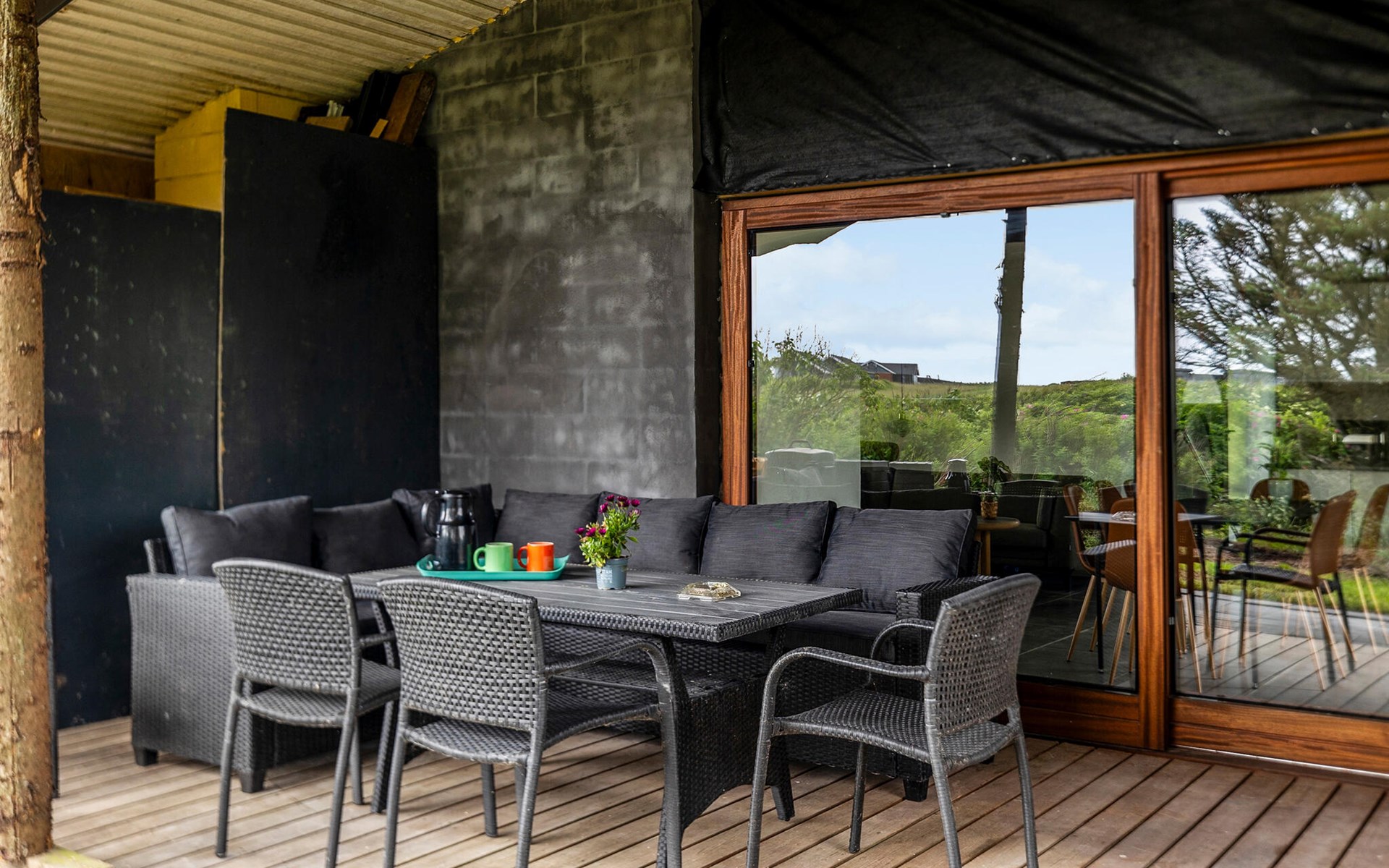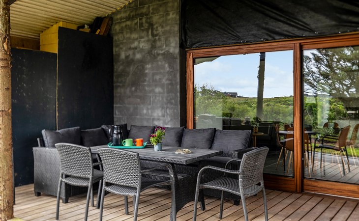 Genießen Sie Ihre Mahlzeiten im Freien auf der möblierten Terrasse. Entspannen Sie in der gepolsterten Sitzecke oder im Finnischen Holzbad, das Ihnen auch an kühleren Tagen wohlige Wärme im Freien bietet. Der große, naturbelassene Garten bietet viel Platz zum Spielen und Entspannen, während verschiedene Sitzbereiche zum Verweilen einladen.