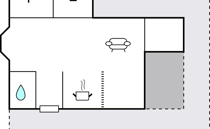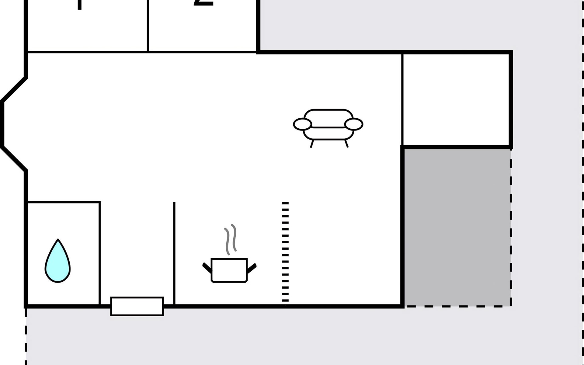 Das Haus bietet zwei gute Schlafzimmer, eines mit einem Doppelbett und das andere mit zwei Einzelbetten. Die letzten beiden Schlafplätze befinden sich im Wohnzimmer auf dem Schlafsofa. Darüber hinaus gibt es ein kleines Badezimmer und eine offene Küche in Verbindung zum Wohnzimmer. Vom Wohnzimmer aus können Sie das Meer im Westen sehen.