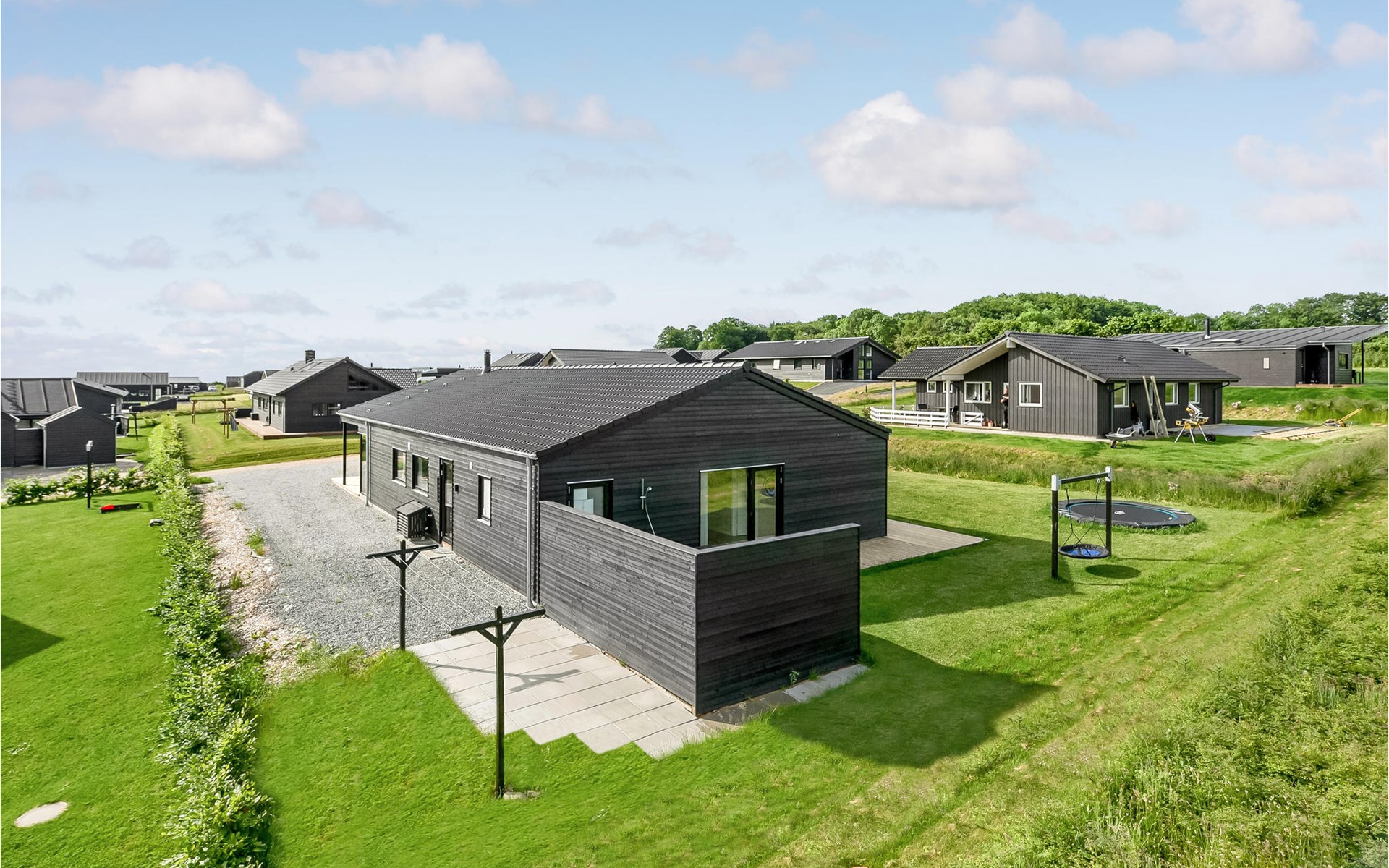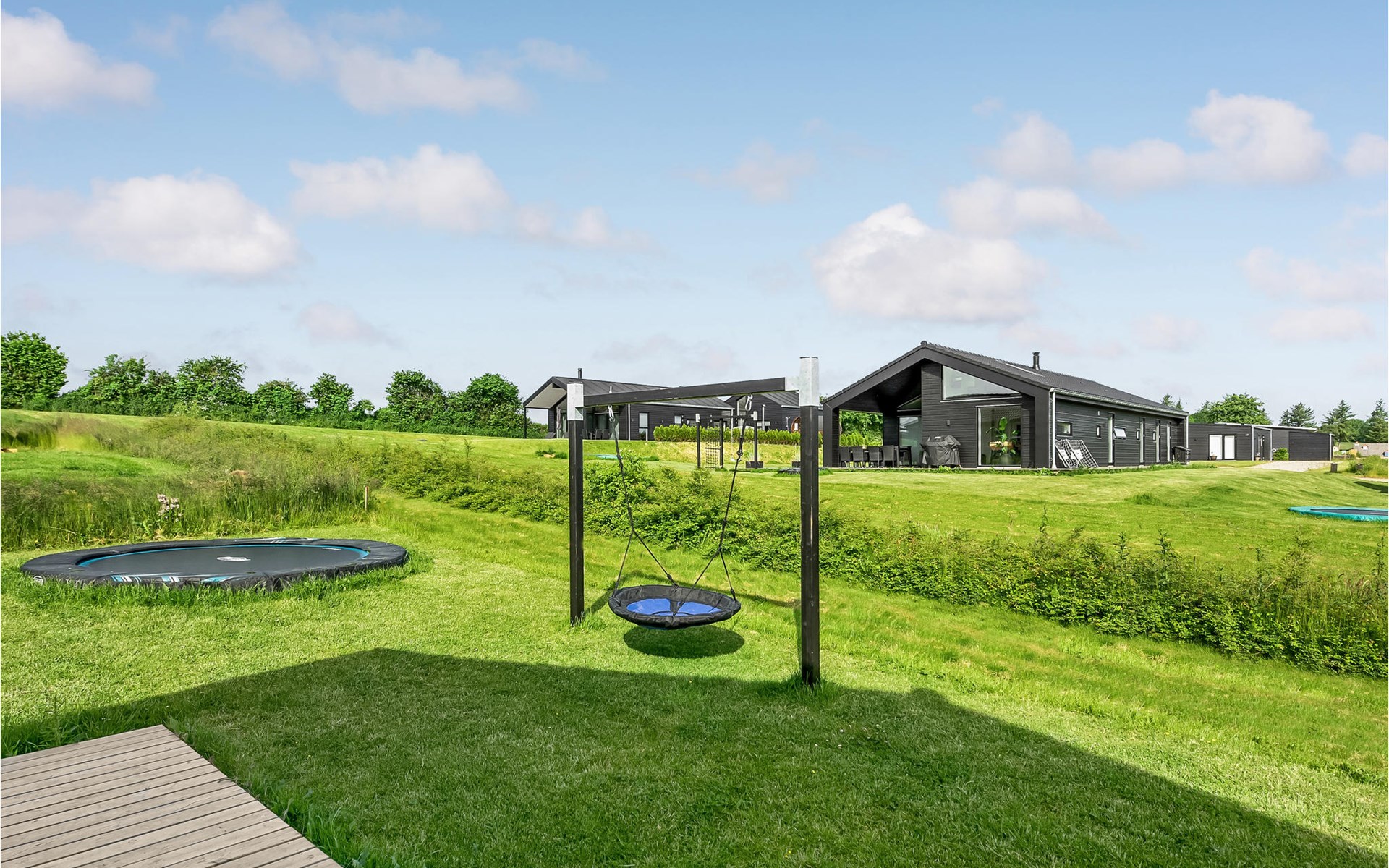 Luxuriöses Ferienhaus mit viel Platz. Der zentrale Teil des Hauses besteht aus Wohnzimmer und Küche in offener Verbindung, hier gibt es viel Platz für die ganze Familie, und der große Fensterbereich bietet einen schönen Lichteinfall in den Raum. Das Ferienhaus verfügt über einen Aktivitätsraum mit Tischfußball und anderen Aktivitäten. Die Schlafzimmer sind in zwei Schlafabteilungen mit eigenem Bad unterteilt, ideal für zwei Familien, die gemeinsam ein Haus mieten möchten. Das eine Badezimmer ist mit einem Whirlpool ausgestattet und im anderen haben Sie Zugang zur Sauna. Dazu kommt ein schöner Außenwhirlpool, in dem Sie zu jeder Jahreszeit Wellness im Freien genießen können. An schönen Sonnentagen können Sie das Wetter draußen auf der großen Terrasse genießen, die zu 2/3 das Haus umgibt.