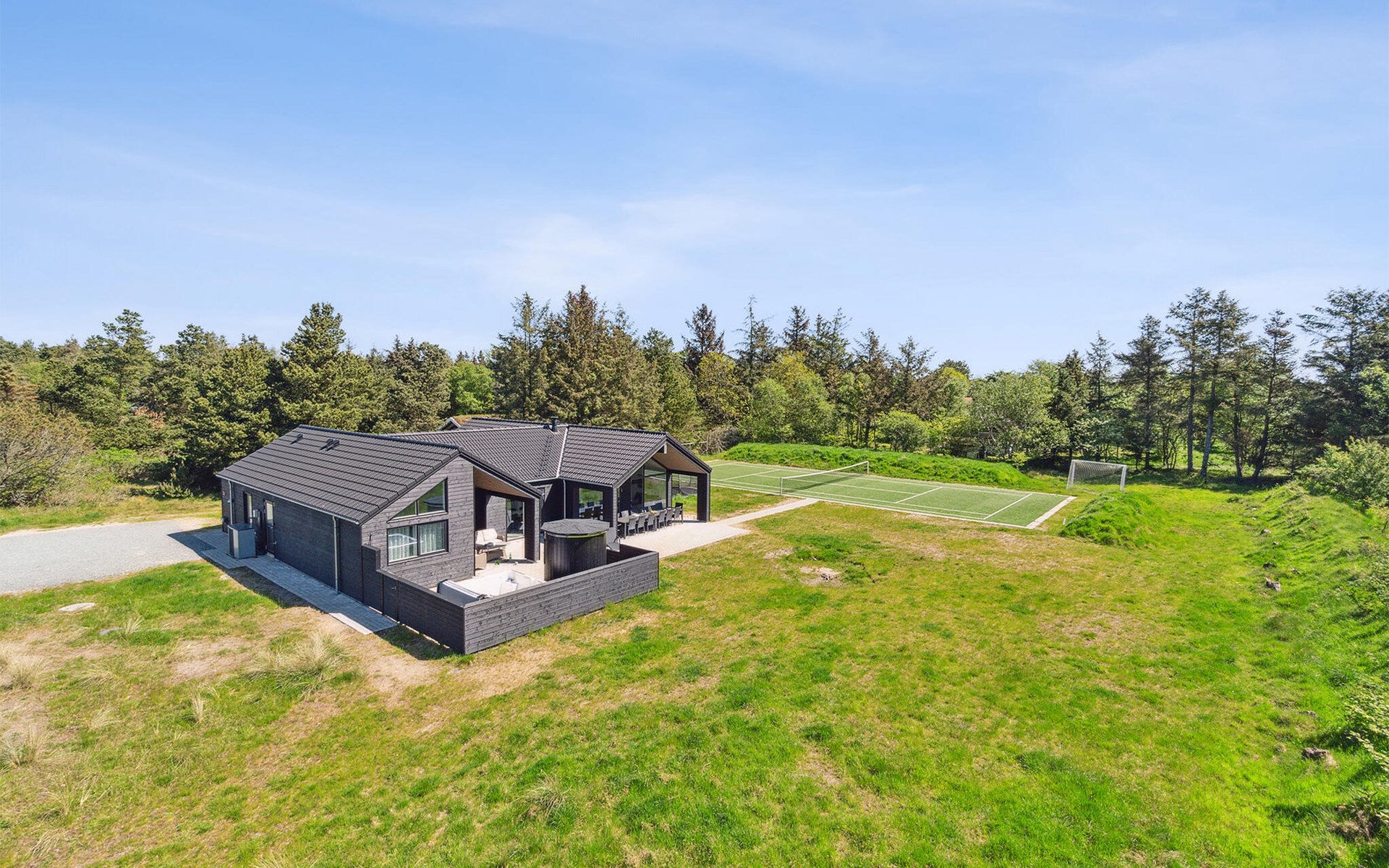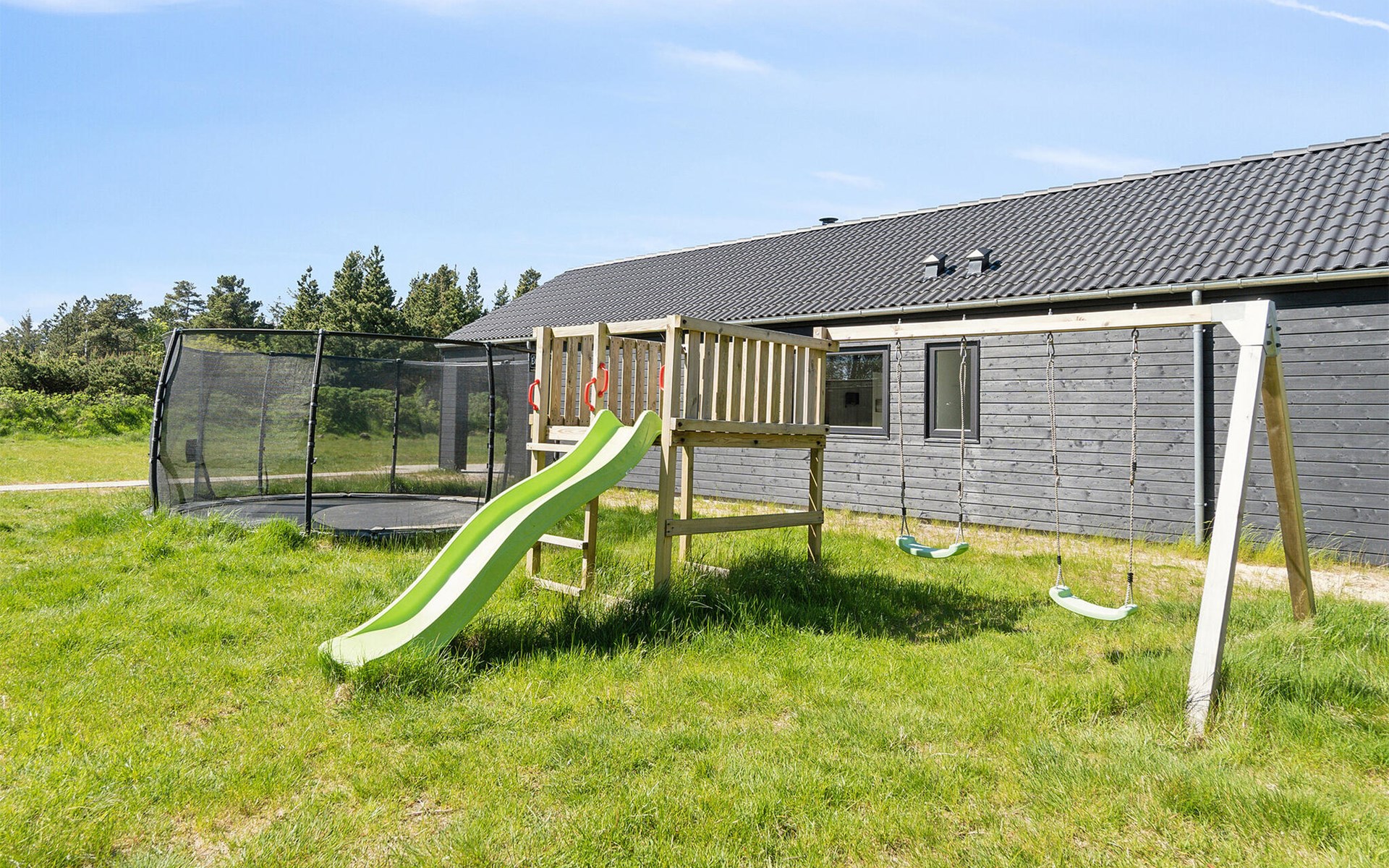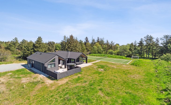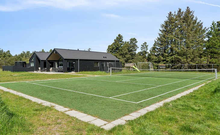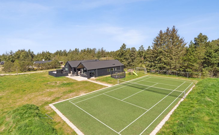 Auch der Außenbereich des Ferienhauses hat viel zu bieten. Genießen Sie auf der Terrasse die Sonne, während Ihre Kinder vergnügt buddeln, spielen und Trampolin springen, und versammeln Sie später die ganze Familie zu Leckereien vom Grill. Ein Highlight ist der private und moderne Tennisplatz, wo Sie auch im Urlaub Ihre Schläger schwingen können.