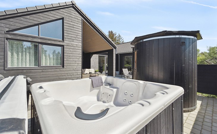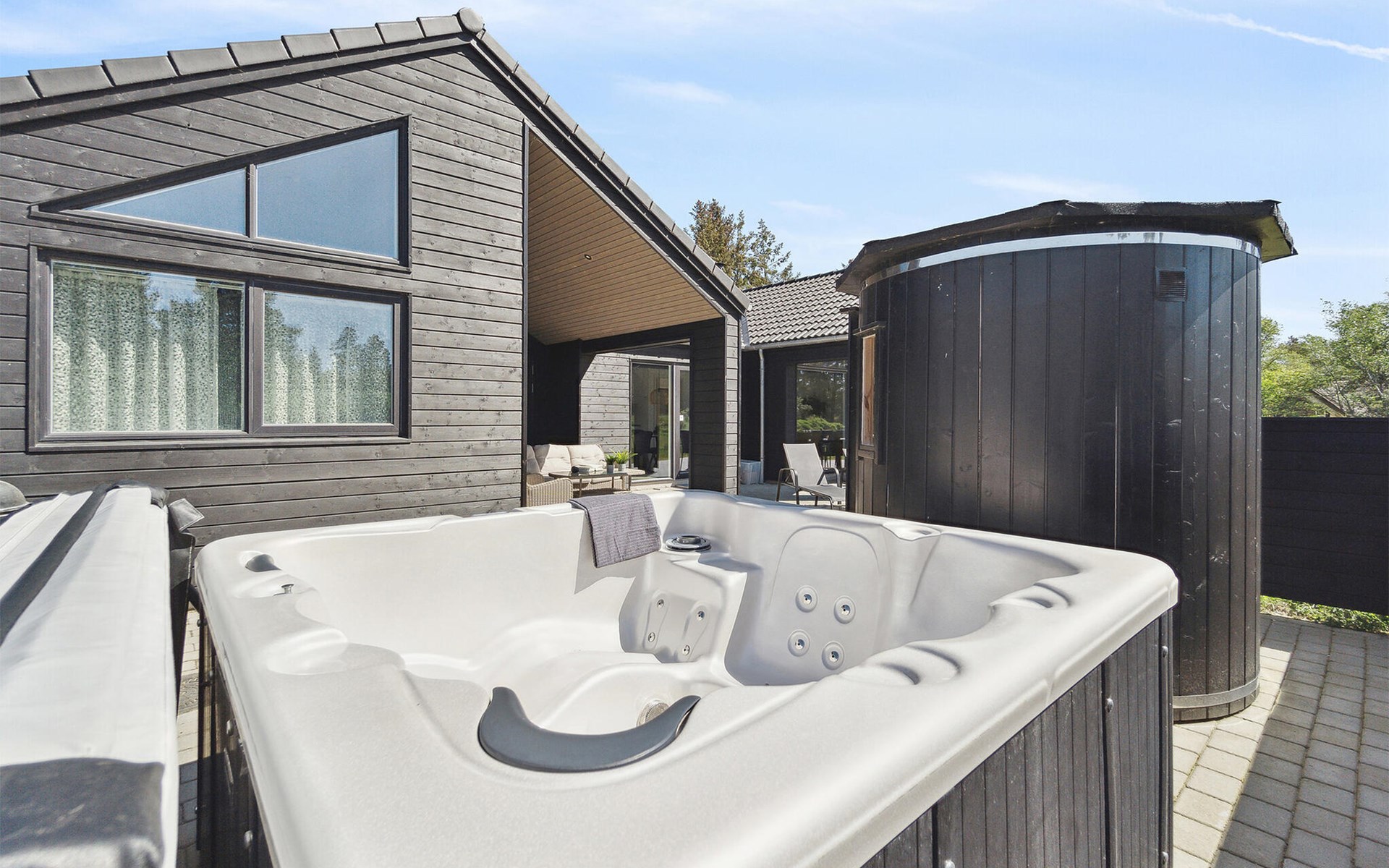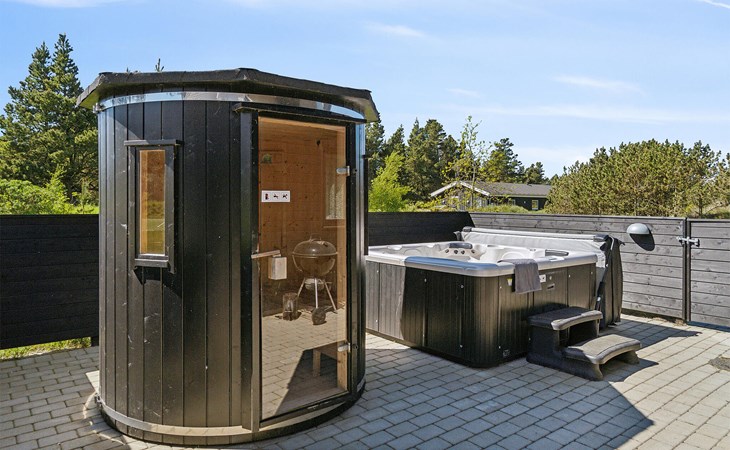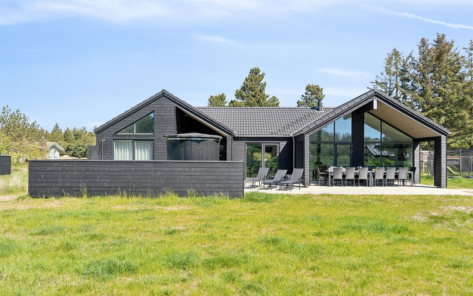 Auch der Außenbereich des Ferienhauses hat viel zu bieten. Genießen Sie auf der Terrasse die Sonne, während Ihre Kinder vergnügt buddeln, spielen und Trampolin springen, und versammeln Sie später die ganze Familie zu Leckereien vom Grill. Ein Highlight ist der private und moderne Tennisplatz, wo Sie auch im Urlaub Ihre Schläger schwingen können.