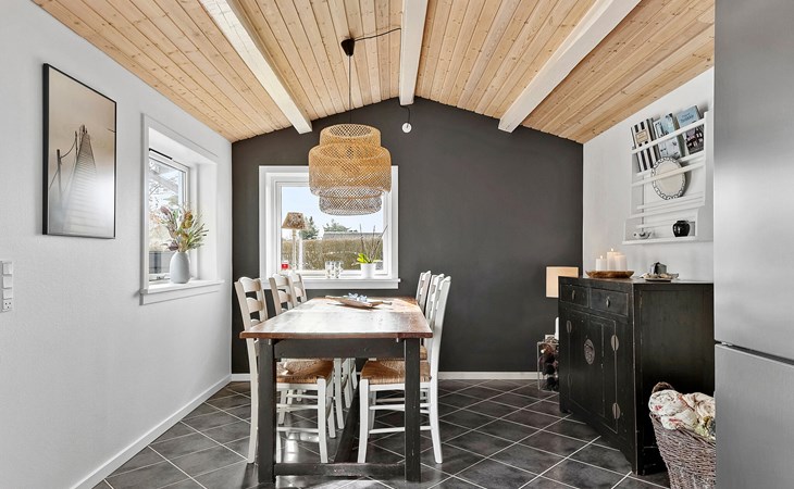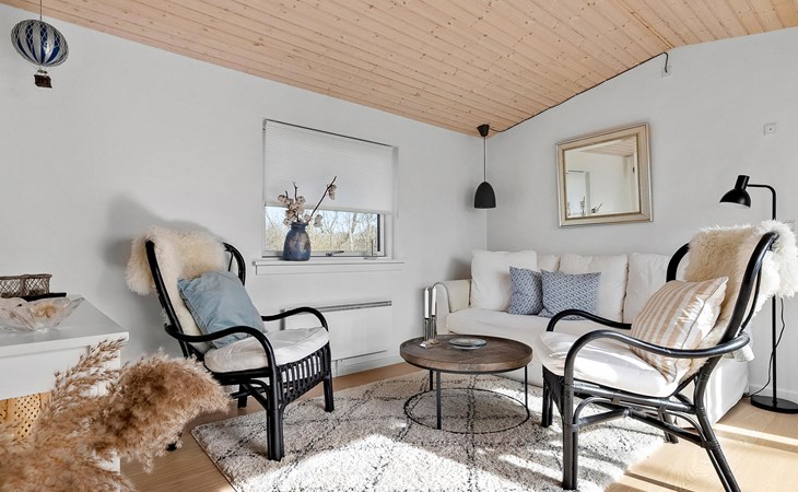 Genießen Sie Ihren nächsten Urlaub in diesem einladend gestalteten Haus, das Ruhe, Komfort und Natur ideal vereint. Tanken Sie frische Luft, lassen Sie den Alltag hinter sich und kommen Sie zur Ruhe, umgeben von einer sanften Landschaft und nur unweit vom Strand entfernt. Machen Sie es sich im liebevoll gestalteten Wohnbereich bequem, der mit großen Fenstern, einer gemütlichen Sofaecke und weiteren bequemen Sitzgelegenheiten zum Verweilen einlädt. Lesen Sie in aller Ruhe ein gutes Buch oder genießen Sie einfach das warme Licht im Raum. Die Kombination aus interessanter Architektur und wohnlicher Wärme schafft eine Atmosphäre, in der Sie sich sofort wohlfühlen. Kochen Sie gemeinsam in der geräumigen Küche und versammeln Sie sich am schönen Esstisch, um Mahlzeiten und Gespräche zu teilen.