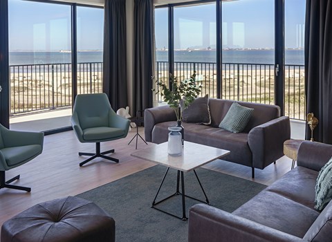 Über die Treppe gelangt man nach oben in das schöne Wohnzimmer. Hier gibt es einen großen Flachbild-Digital Fernseher mit SMART-tv und extra deutschen Fernsehsendern, einen Radio CD Player mit USB & Bluetooth Funktion und eine Handy Qi-Station. Zudem befindet sich hier auch der extra große Balkon mit komfortablen Balkonmöbeln, Sonnenschirm und 2 Sonnenliegen. Schier endlose Weitsicht auf das angrenzende Naturschutzgebiet genießt man nach einem herrlichen Tag am Strand, bis dass die Sonne am Horizont untergeht.