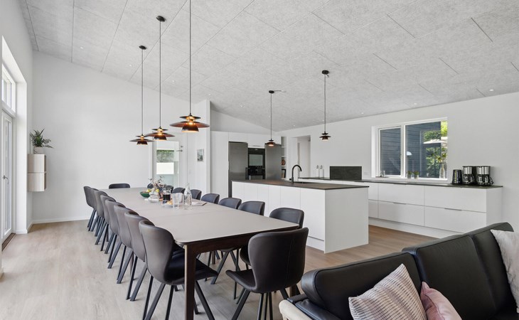 Treten Sie ein in dieses moderne Ferienhaus in Rågeleje, einer der schönsten Urlaubsgegenden in Dänemark. Das Haus bietet Platz für mehrere Familien oder eine große Freundesgruppe und lädt mit seinen vielseitigen Unterhaltungsmöglichkeiten und dem luxuriösen Ambiente zu einem unvergesslichen Urlaub ein. Nach dem Frühstück, das Sie in der stilvollen, offenen Küche zubereiten und an dem langen, eleganten Esstisch zu sich nehmen können, ist vielleicht schon Zeit für lustige Aktivitäten im Spielbereich Ihres Ferienhauses. Spielen Sie Billard, Tischfußball und Tischtennis und ermitteln Sie den Rågeleje-Urlaubsmeister in den unterschiedlichen Disziplinen. Entspannen und vergnügen Sie sich nach den sportlichen Wettkämpfen im Innenpool und dem Whirlpool. Der angenehme Wohnbereich mit bequemen Sofas ist der ideale Ort, um sich mit den Freunden oder der Familie bei unterhaltsamen Spielen oder anregenden Gesprächen zu vergnügen. Erleben Sie in den großen Räumen, einschließlich des Poolbereichs, viele Spots mit Dimmern an der Decke, damit zum Beispiel abends in den verschiedenen Wohnbereichen eine besonders gemütliche Atmosphäre geschaffen werden kann.