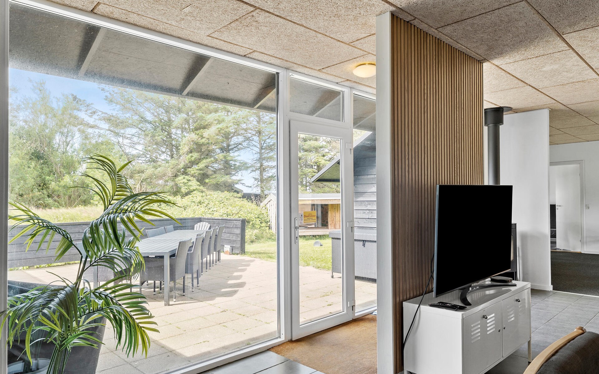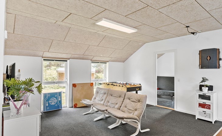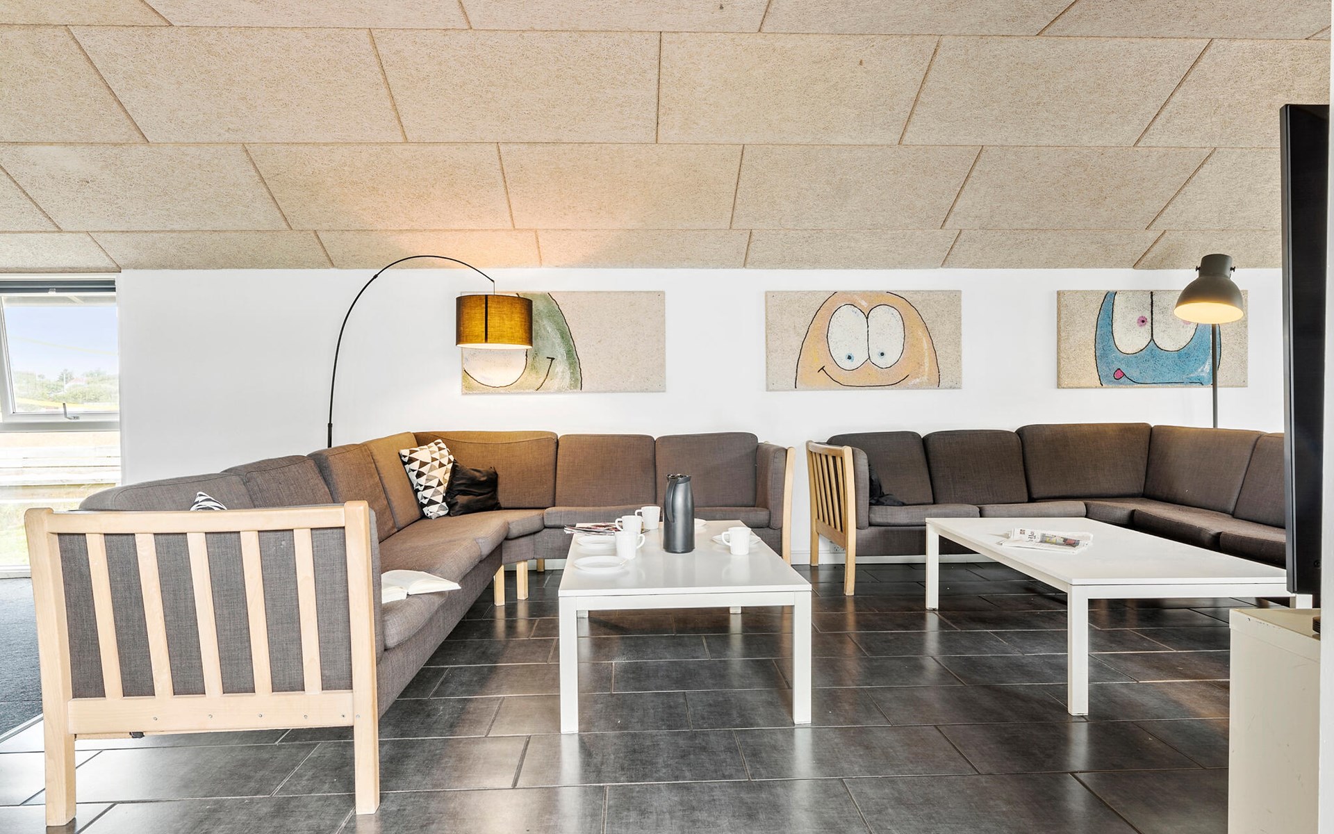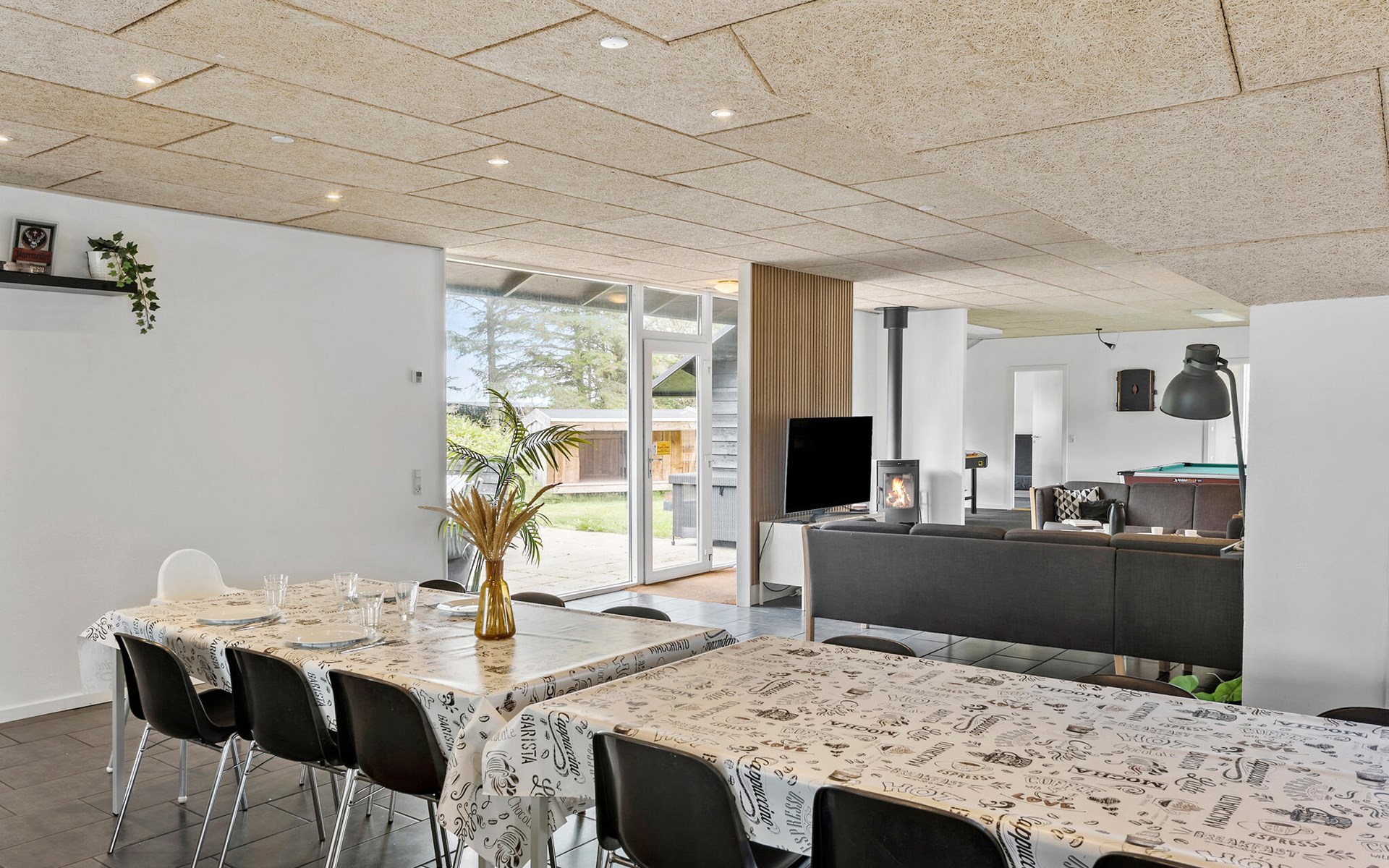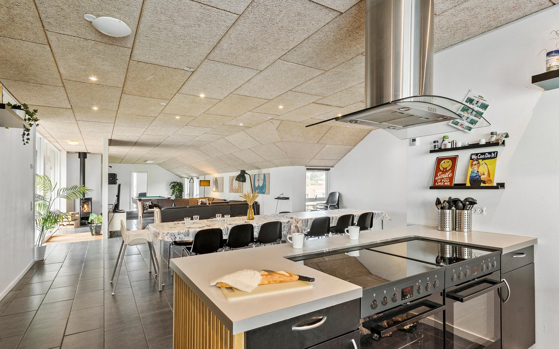 Verbringen Sie Ihren nächsten Urlaub am Stenbjerg Strand in diesem großzügigen Ferienhaus, das Platz für mehrere Familien oder eine größere Reisegruppe bietet. Betreten Sie den großzügigen Wohnbereich, der mit einer eleganten und modernen Einrichtung begeistert. Machen Sie es sich auf den gemütlichen Sofas vor dem Kaminofen bequem. Nutzen Sie die voll ausgestattete Küche, um Ihre Lieblingsgerichte zuzubereiten, und servieren Sie diese an dem langen Esstisch, der viel Platz für gesellige Mahlzeiten bietet.