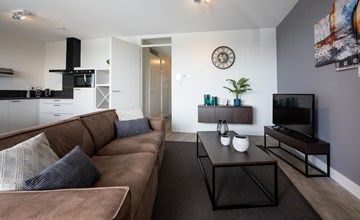 Das geräumige und ansprechend eingerichtete Wohnzimmer verfügt über eine bequeme Sitzecke und einen Smart-TV mit Auslandspaket. Sonnenschirme auf der Terrassenseite halten die Wohnung im Sommer angenehm kühl. Vom Wohnzimmer aus haben Sie Zugang zu der geräumigen, überdeckten Südbalkon mit luxuriösen, bequemen Gartenmöbeln und Terrassenheizung. Hier können Sie, bis in die späten Abendstunden, das schönes Aussicht auf den lebhaften Jachthafen und das Veerse Meer genießen.