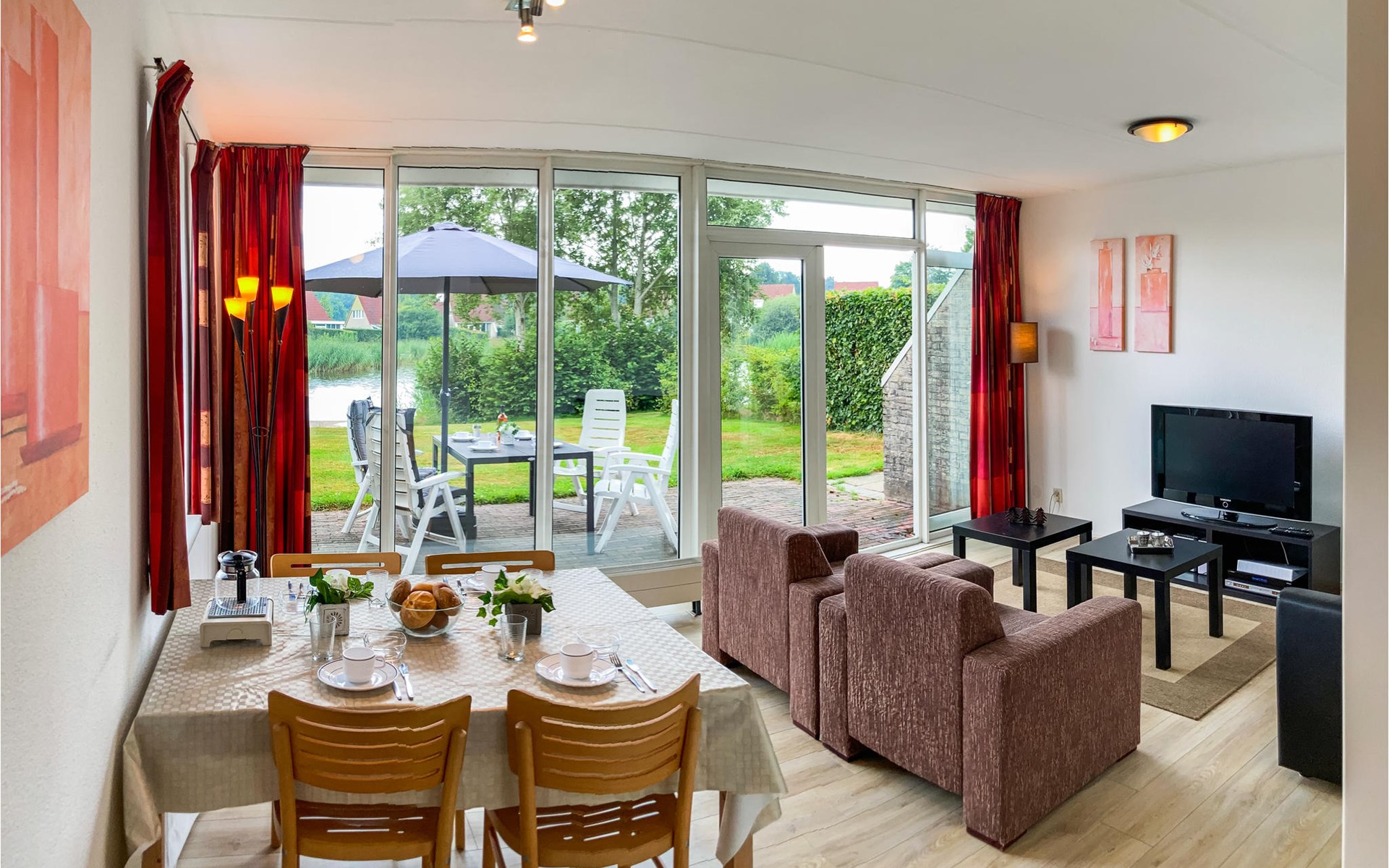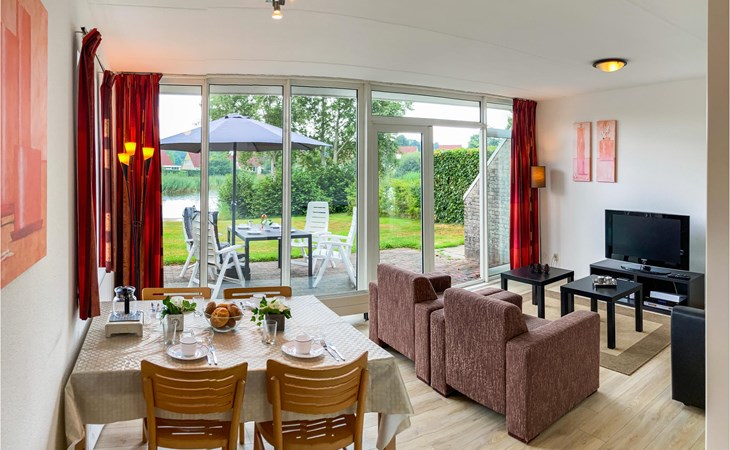 Das Wohnzimmer dieses gemütlichen Ferienhauses in Holland hat große Fensterpartien mit Blick auf den Garten und das Wasser. Das Haus ist komfortabel eingerichtet, mit schönen Details und Dekorationen, die eine warme Atmosphäre schaffen.