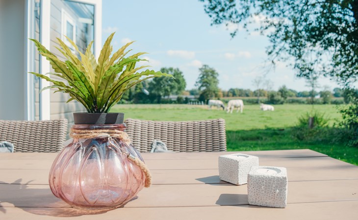 Veluwelodge Gelb 123: Glasanbau und freier Blick über die Wiese.