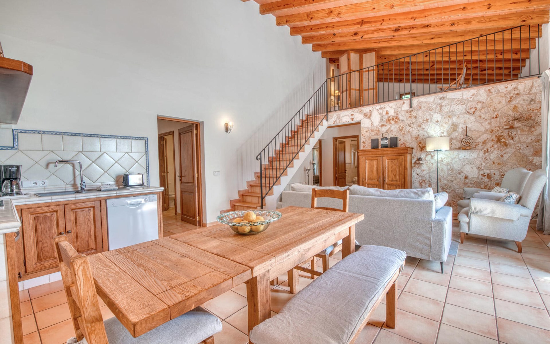 Im Inneren verfügt der offene Wohn- und Essbereich über helle Wände, sichtbare Balken und gemütliche Holzmöbel. Ein dekorativer Torbogen führt zu den drei komfortabel eingerichteten Schlafzimmern, zwei Doppelzimmern und einem Einzelzimmer. Mit drei Bädern, zwei davon en suite, bietet die Finca absolute Privatsphäre. Die Buchung von "Es Lledoner Tres" (EMI327) nebenan ist perfekt für zwei Familien, die zusammen reisen.