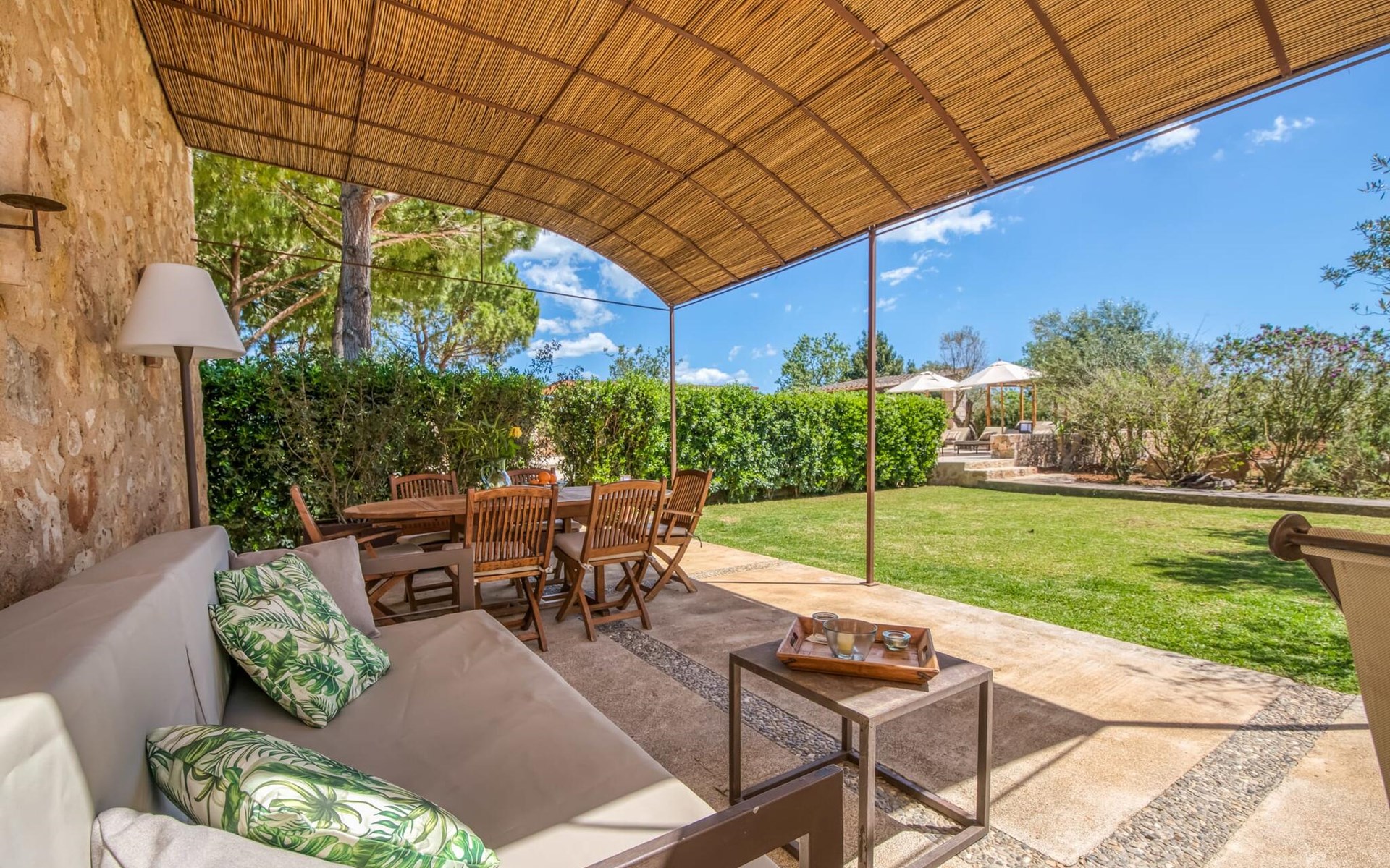 Diese aus Stein gebaute Finca "Es Lledoner dos" ist von einem großzügigen Grundstück mit Palmen, Pinien- und Olivenbäumen und anderen mediterranen Pflanzen umgeben.