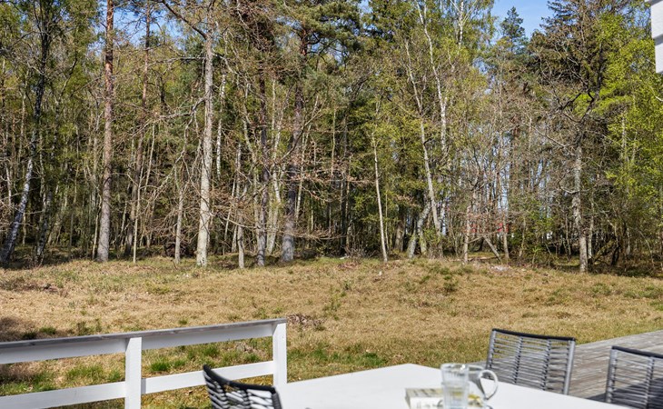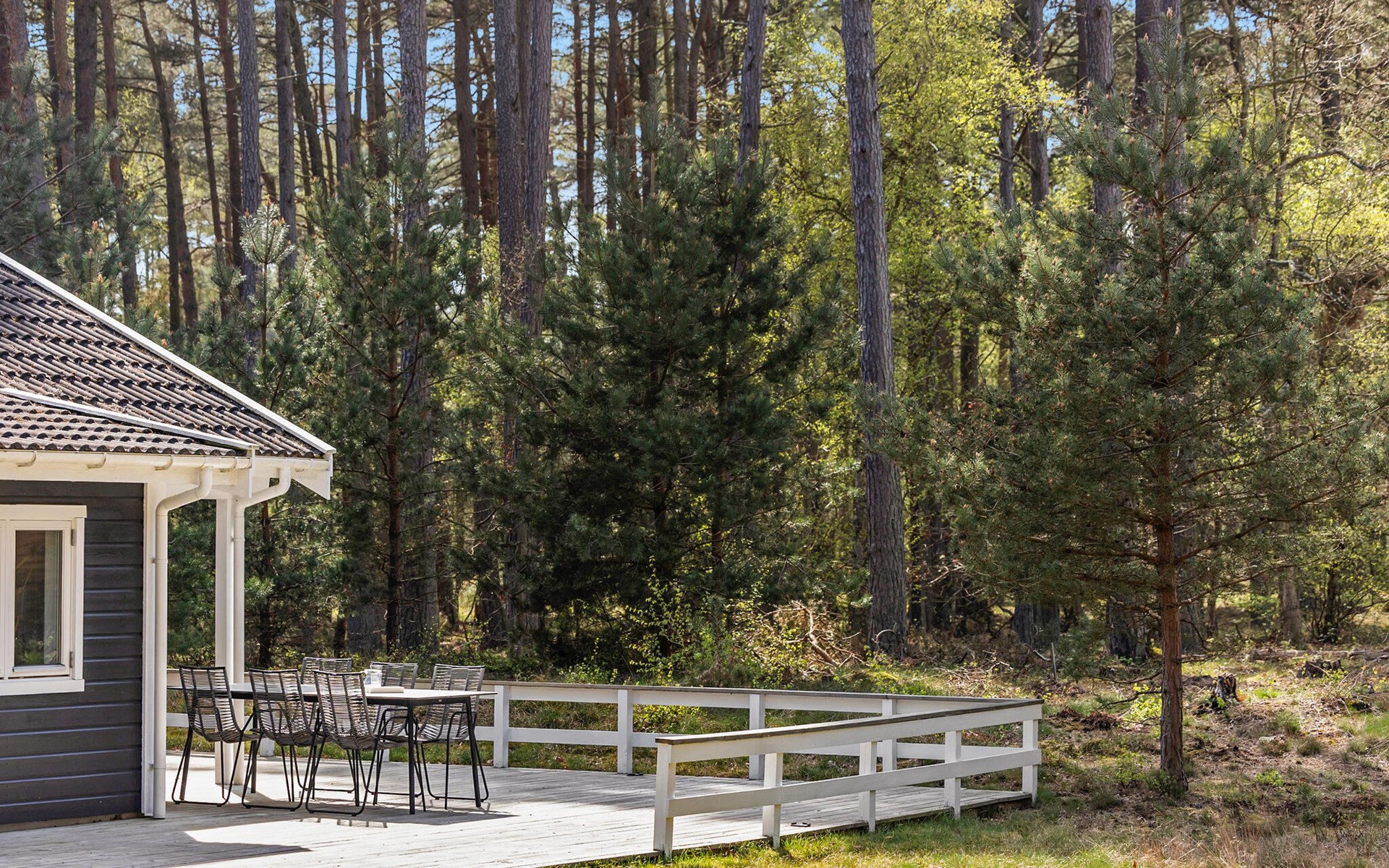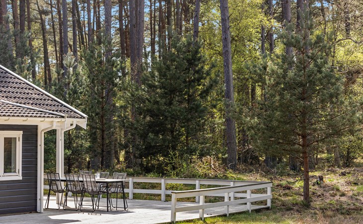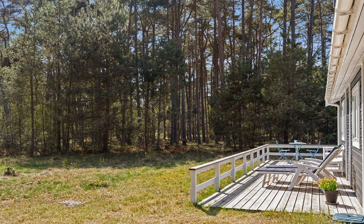 Der Außenbereich bietet viel Privatsphäre und Platz zum Durchatmen. Die große Terrasse umgibt das Haus und ist mit Gartenmöbeln ausgestattet. Genießen Sie Ihre Mahlzeiten unter freiem Himmel, lesen Sie ein Buch in der Sonne oder lassen Sie einfach die Ruhe auf sich wirken. Das idyllische Naturgrundstück grenzt direkt an den Wald.