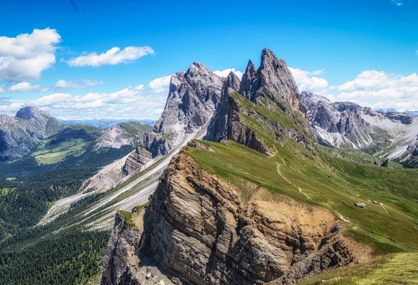 Das Besondere an Seceda ist der eindrucksvolle Kontrast zwischen sanften, grünen Wiesen und steilen Felsformationen. Entlang der Strecke finden sich familienfreundliche Hütten mit Tieren, Trampolinen und Spielmöglichkeiten. Besonders beliebt ist die Troier Hütte.