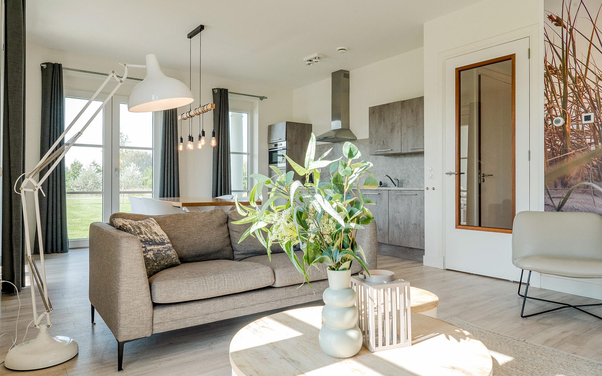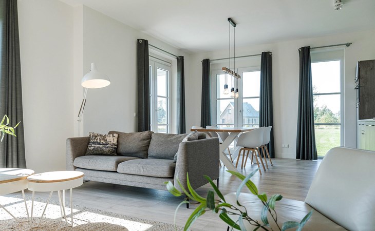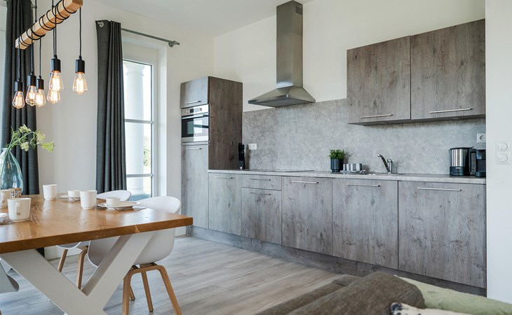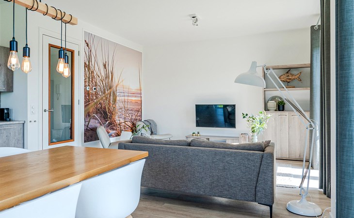 This modern and luxurious holiday apartment in an elegant apartment building offers you the perfect place to unwind. The stylish furnishings and bright, maritime ambience create a calm and inviting atmosphere. Here you have plenty of space to feel at home with your family or friends. Come together in the open-plan living room, which successfully combines the kitchen, dining and living areas and invites you to cook, eat or relax together.