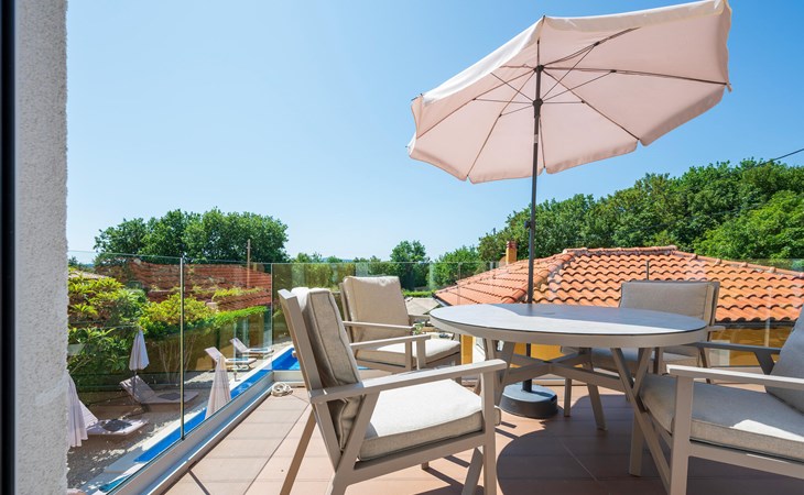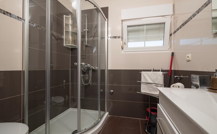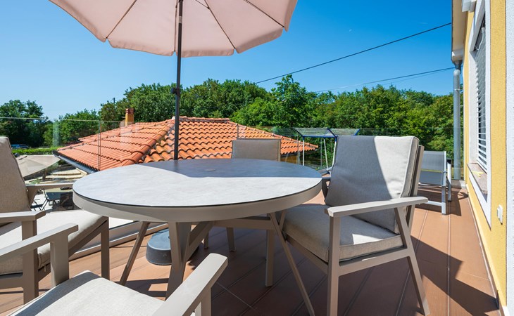 The inviting apartment welcomes its guests on the 1st floor of a beautiful house. SDank air conditioning you will be comfortable here in the summer. A beautiful shared outdoor pool with hydromassage in one part offers welcome refreshment. By the pool there is a well-equipped shared summer kitchen with fireplace and an additional shared toilet.