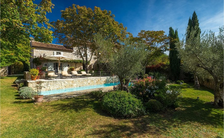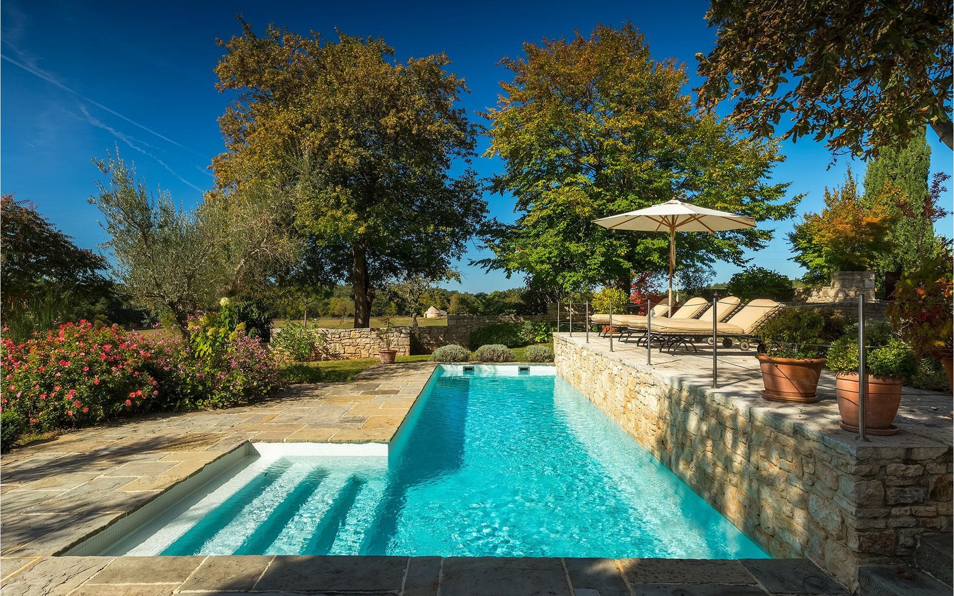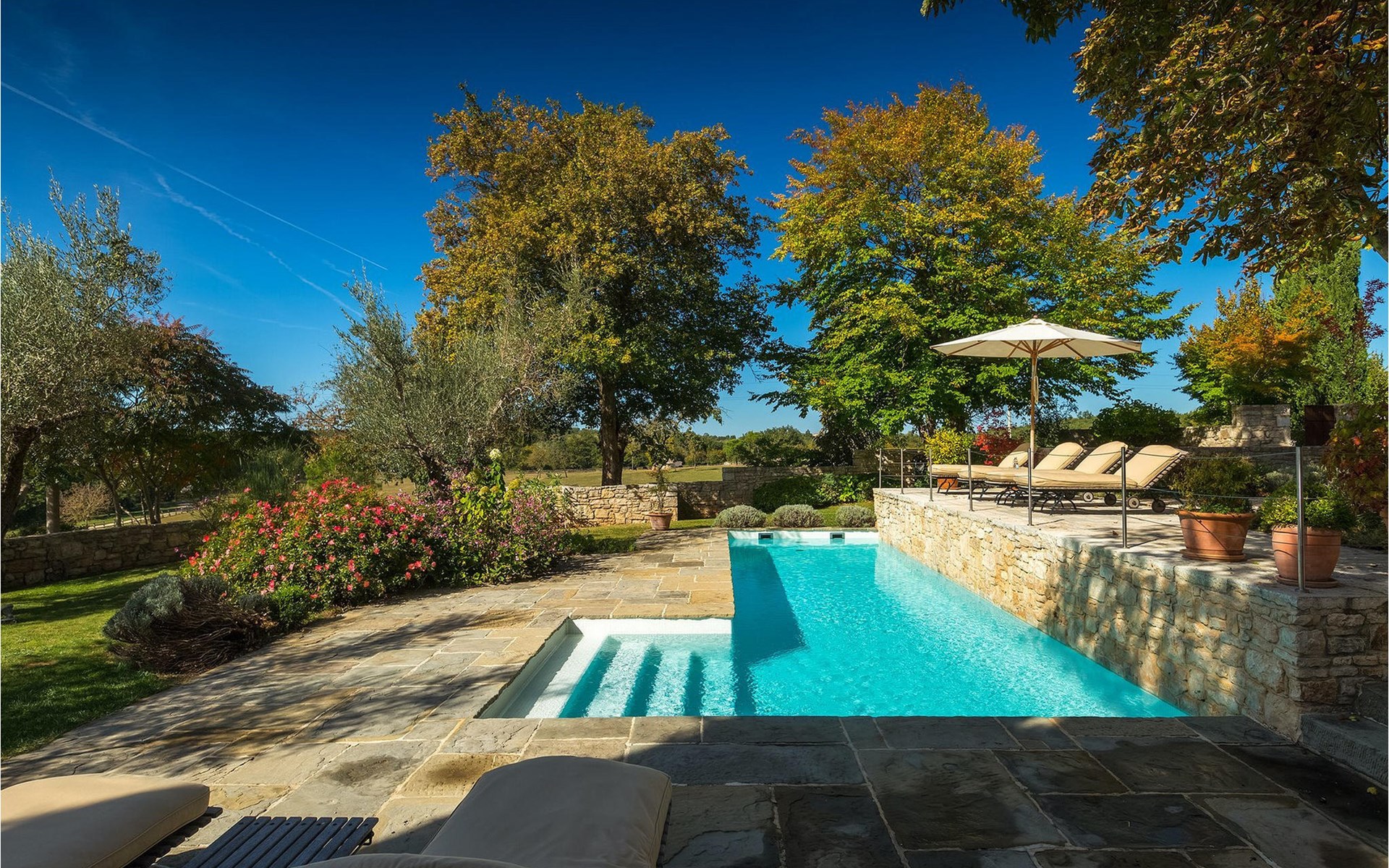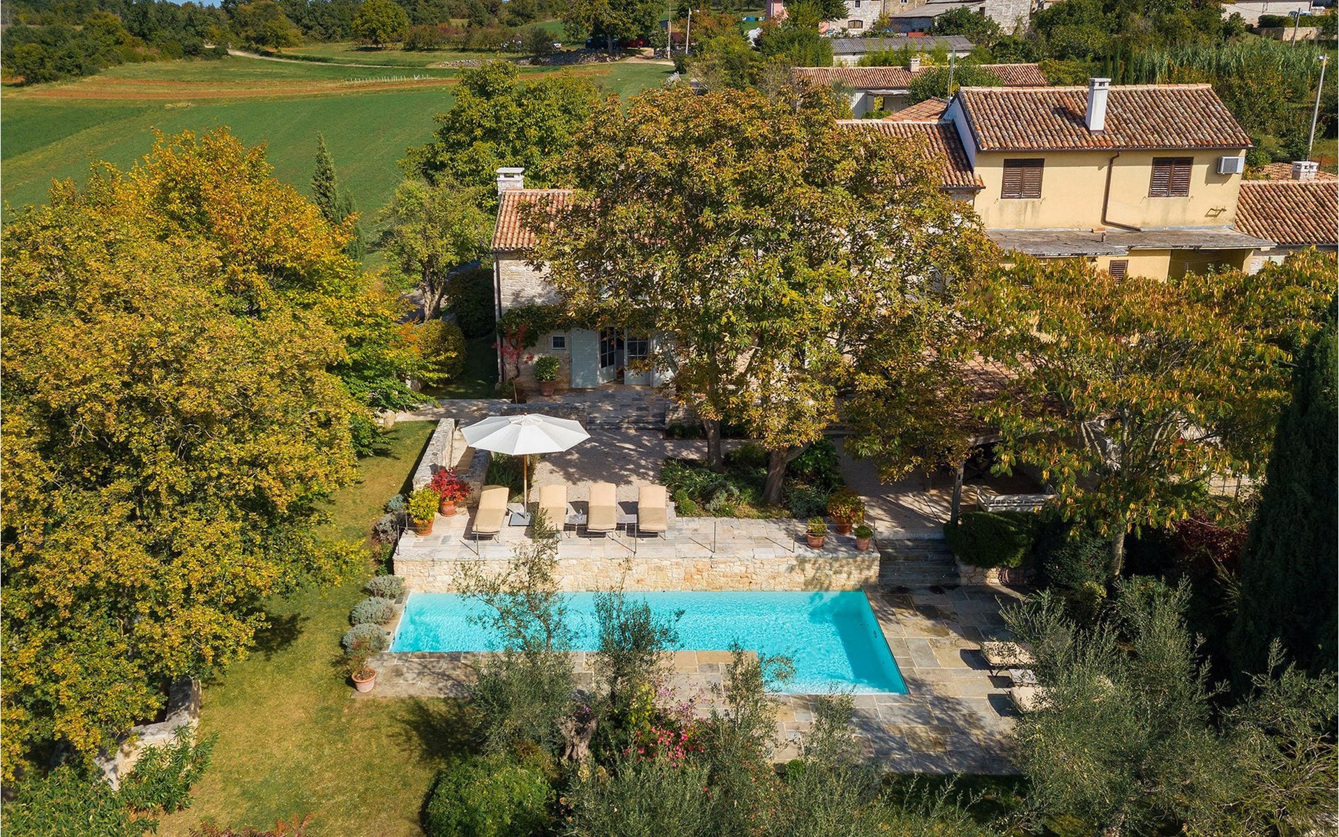 The outdoor area of Villa Castagno is just as enchanting as its interior. The stone pool in the garden is framed by comfortable sun loungers, trees and flowers. The garden is exquisite and is tended by a professional gardener. The view of the unspoiled nature of the garden and the entire surroundings of Villa Castagno can be best enjoyed from the covered terrace Located in the small village of Prascari in the municipality of Visnjan, this villa is situated in a fairytale place in the heart of Istria. Surrounded by meadows and forests, the village consists of a few family houses and vacation villas. The completely restored hamlet, peace and quiet of the rural area, untouched nature and an idyllic atmosphere are only part of the charm of this place. The town of Visnjan is only 5 km away from Prascari. Since the days of Venetian rule, Visnjan has served as a well-known trading center where all kinds of agricultural products and tools were sold. Even today, a traditional open market is held on the last Thursday of every month, which is a special attraction for people from all over Istria. The ancient terrace on the square, which can be entered through an arch with the motif of the Venetian lion, gives an amazing sea view. Visnjan is a place of special interest for astronomy lovers because of its internationally renowned Astronomical Observatory. The tourist hotspot of Porec is a short drive away. During your stay in our villas near Porec, don't miss the opportunity to visit the Basilica of Euphrasia. It was built in the middle of the 6th century and is considered one of the most beautiful works of art in the world. Porec is a city rich in cultural heritage, where the massive city wall stops time and welcomes visitors.