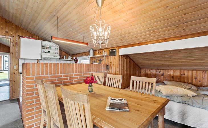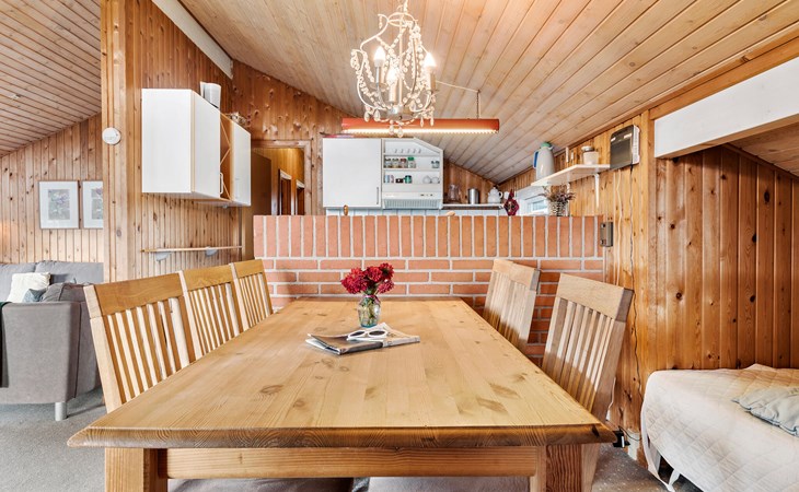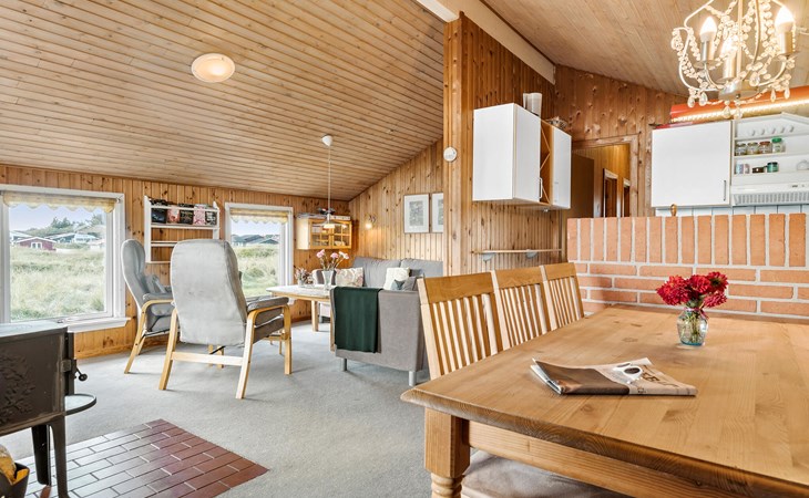 As soon as you arrive at Vorupør Strand, you will feel the cosy and inviting atmosphere of this holiday home. The tasteful wooden ambience inside harmonises with the beautiful exterior of your home. The open-plan kitchen invites you to prepare a delicious breakfast, while the wooden dining table is ideal for making plans for the day ahead with the whole family. A cosy sofa and a wood-burning stove await you in the living area, providing pleasant warmth on cooler days. On the sunny terrace, you can relax and enjoy your meals or savour the peaceful surroundings with a cup of tea. And the in-house sauna provides even more soothing relaxation.